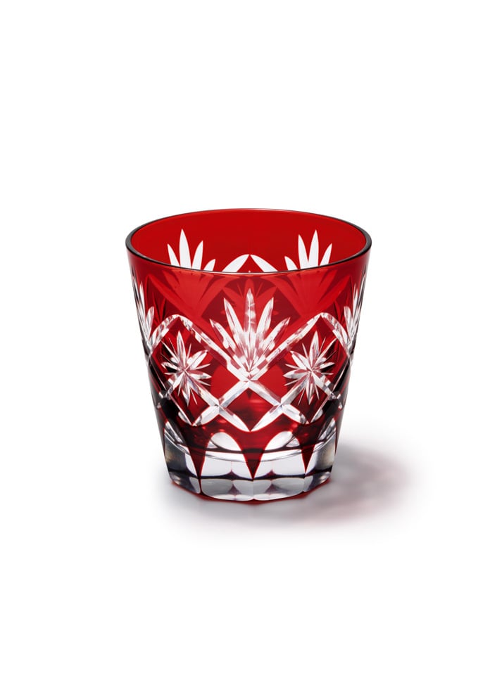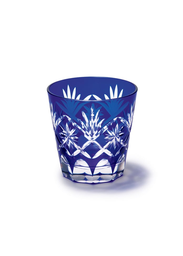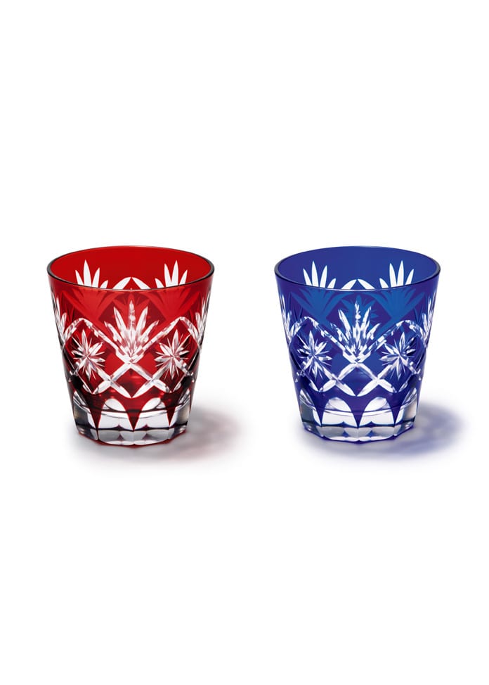 江戶刻面的製作方法是在透明玻璃上覆蓋一層薄薄的彩色玻璃,然後進行大膽的深度切割。通過切割這兩層玻璃,美麗的日本圖案,如麻葉、菊花和景泰藍就出現了。它有著悠久的歷史,自江戶時代早期以來一直作為普通人的餐具而流行。 切工精細,加工華麗。精緻的工藝在王道的藍色和紅色江戶刻面中體現得淋漓盡致。