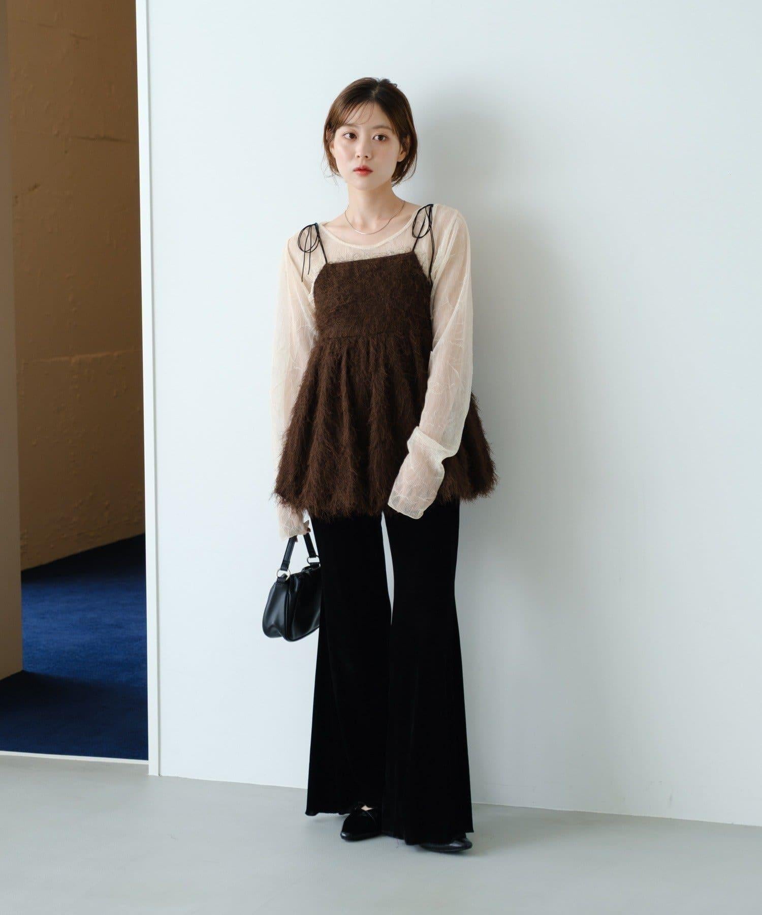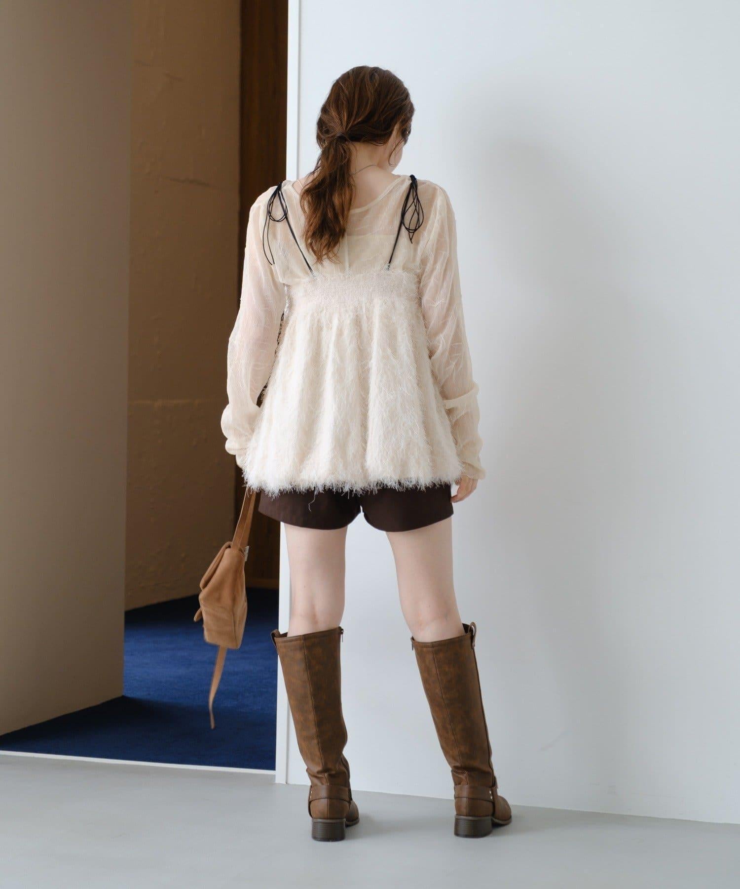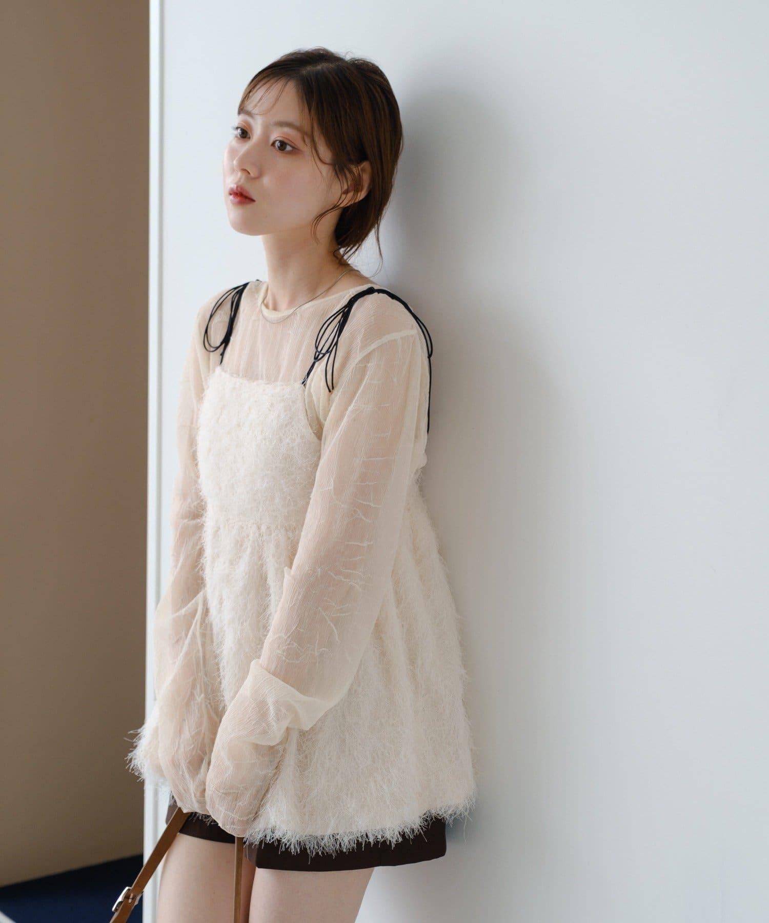 與透視上衣和高領毛衣疊穿,打造時髦造型。
