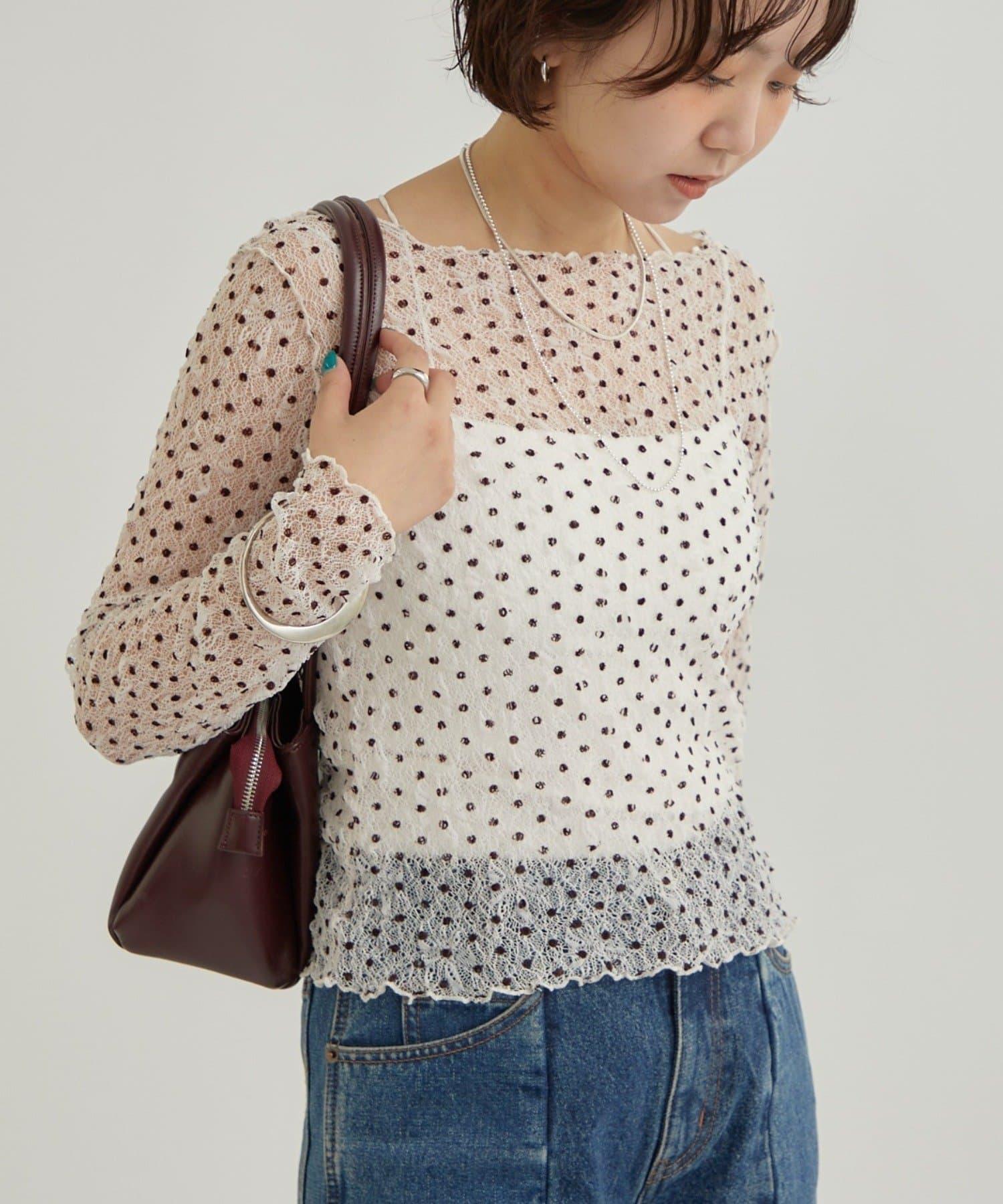 這件上衣有輕盈蓬鬆的圓點圖案。透視面料的透明度增加了輕盈感和舒適感。