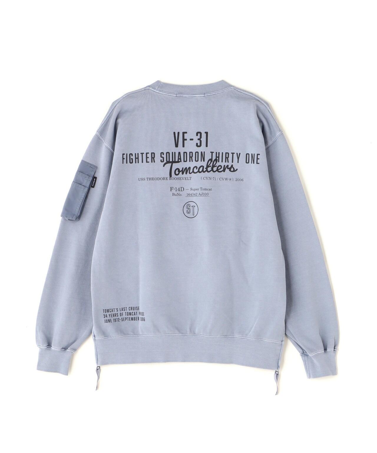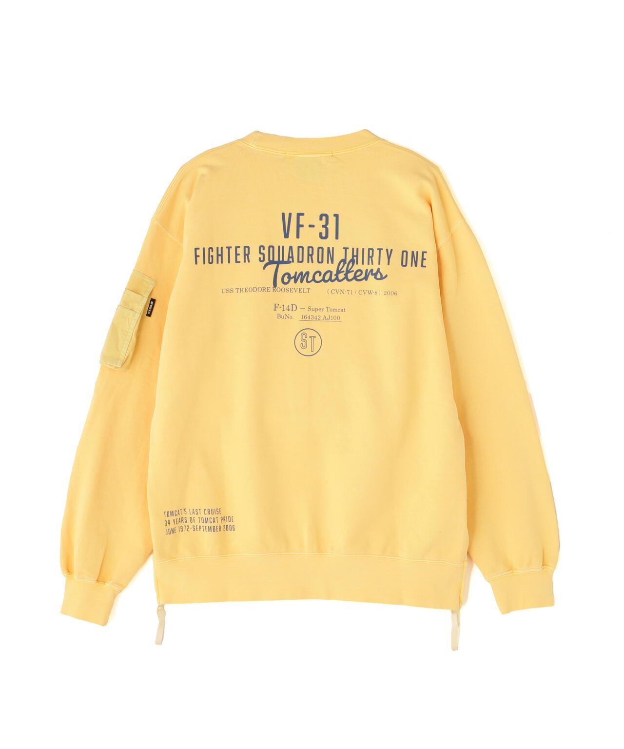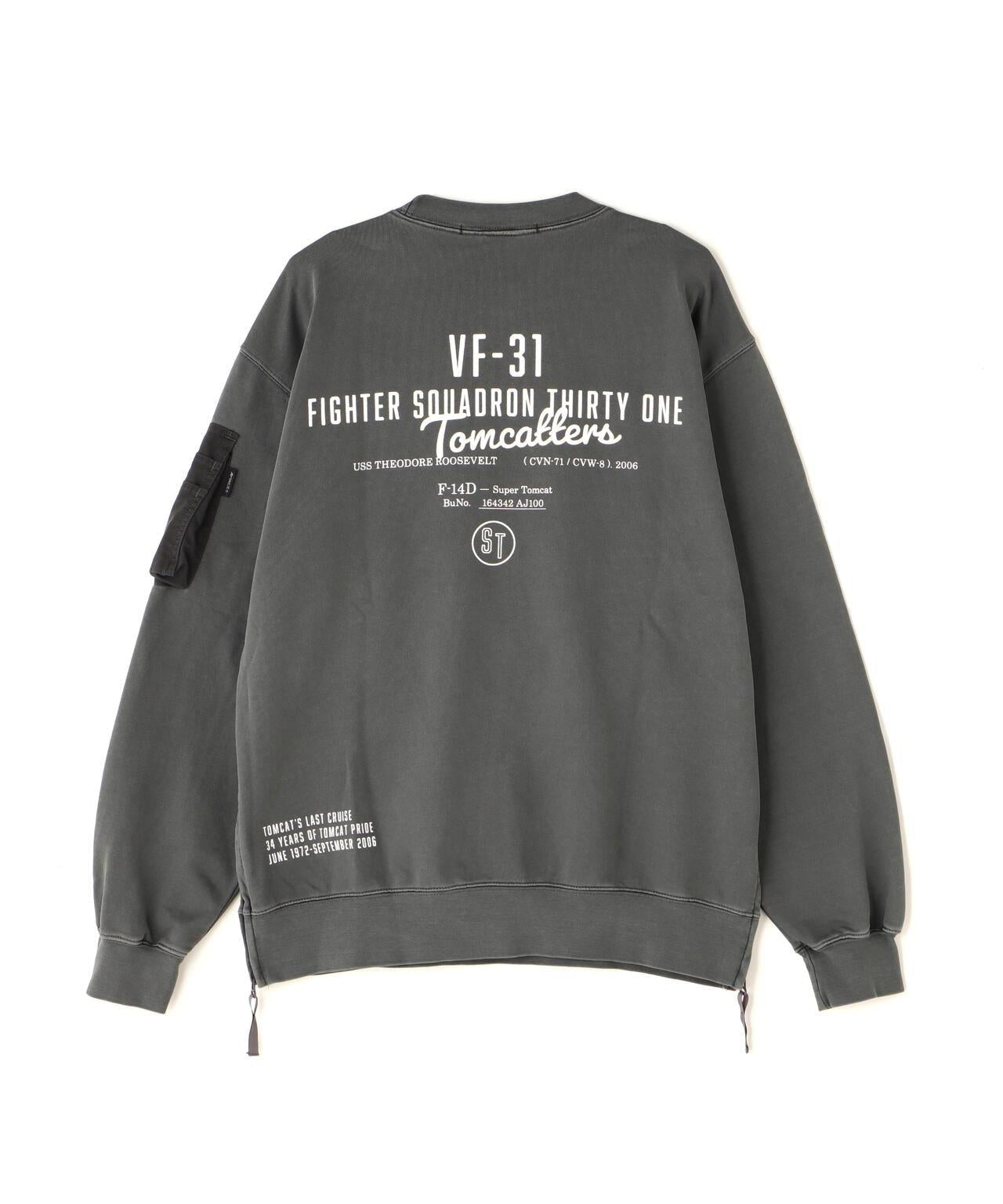POCKET SWEAT(口袋運動衫) 產品詳情 - 採用獨特色素染色法處理的平領運動衫 - 左袖軍裝口袋和左右下襬側扣具特色 - 通過開合扣可改變輪廓 - 兼具透氣功能的設計 - VF-31 "TOMCATTERS "圖案印花 - 面料採用手感舒適的絲質襯裡。設計和 VF-31 "TOMCATTERS "印花圖案兼具透氣功能,面料採用質感良好的絲質襯裡毛髮,沉穩的軍旅風味飾面,勻稱的廓形 [AVIREX / AVIREX] 1975 年。它作為美國空軍的承包商而成立,並通過提供飛行夾克而大大提高了知名度。軍事淵源。