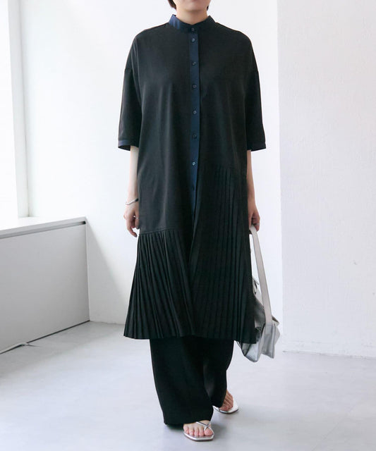 由不同材質製成的連身裙,結合了具有合身感的羅紋材質和抗皺彈性材質。肩帶可以拆卸,因此您既可以將其作為裸露連體褲穿,也可以將其作為吊帶連體褲穿。兩種不同高度的尺寸也是一個吸引人的特點。您可以根據搭配的內搭和單品改變連衣裙的氛圍。