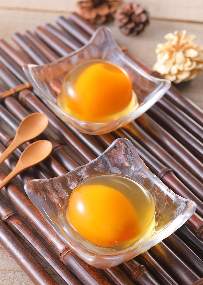 美麗的琥珀色果凍具有堅實的質地和光滑的感覺。果肉結實的枇杷有一種優雅、清爽的味道。果凍和大枇杷的味道平衡得很好,是一種兒童和成人都能享用的果凍精品。