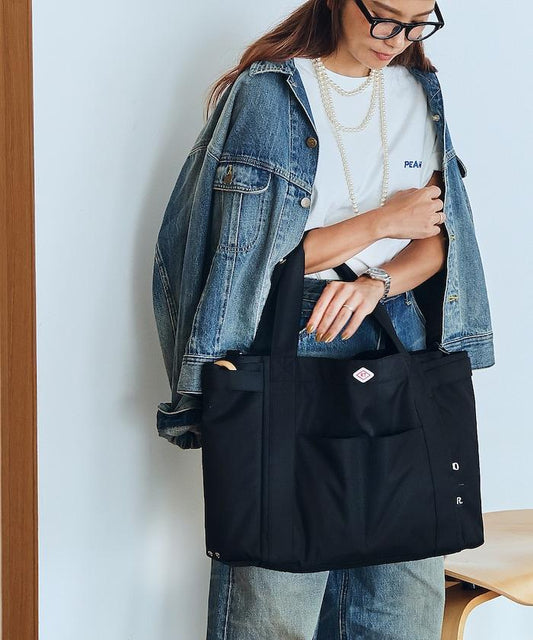 箱形多功能包,可橫向放置長錢包。包口寬大,視野開闊,內袋可存放小件物品。通過附帶的揹帶,它還可用作斜挎包。採用尼龍混合材料與棉和人造絲交織而成。該系列手袋兼具輕便和耐用性,同時再現了天然稻草材料的質感和外觀。
