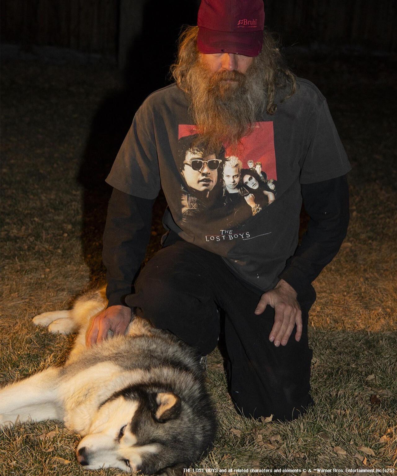 SAINT MICHAEL 與《迷失男孩》的合作款。這款產品的圖案設計來自以吸血鬼為題材的美國恐怖電影《迷失男孩》(The Lost Boys)的醒目海報。標誌性的表面處理與電影中骯髒的世界相得益彰,同時又散發出聖麥可獨有的真實復古氣息。製造商商品編號:SM-HR8-0000-C51
