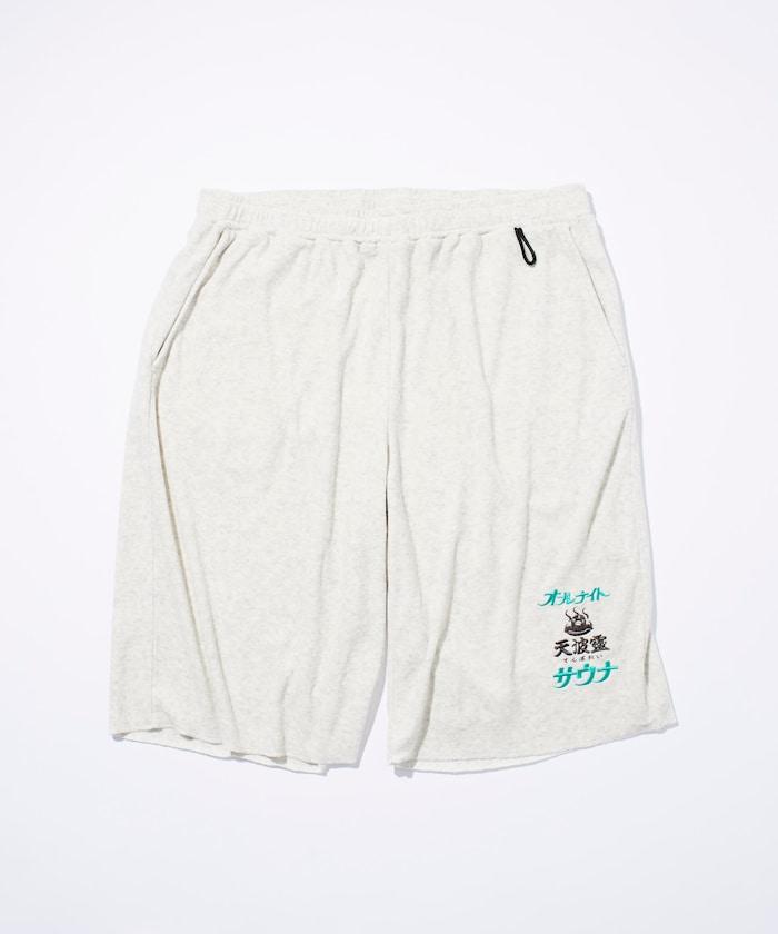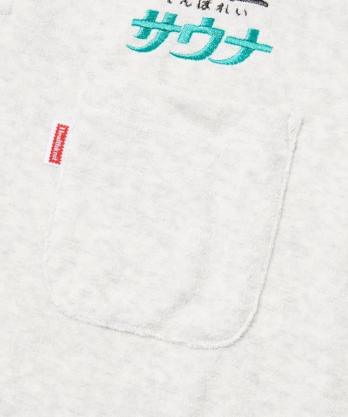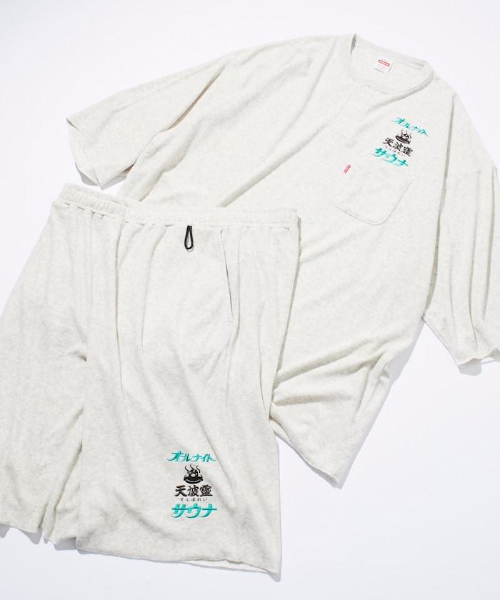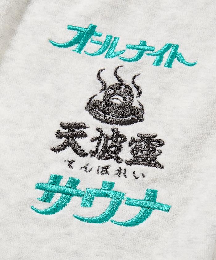 這款內衣的設計靈感來自膠囊酒店和超級公共浴室中常見的 "Kannai gi",上面繡有 SAUVENIR 標誌性的 "All Night Sauna "標識。