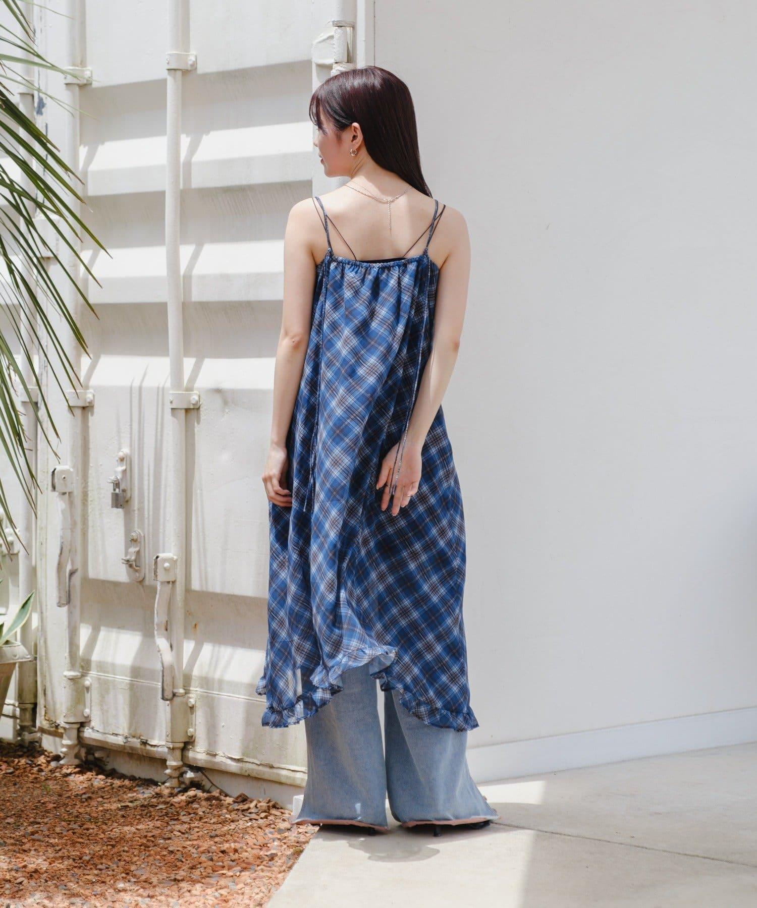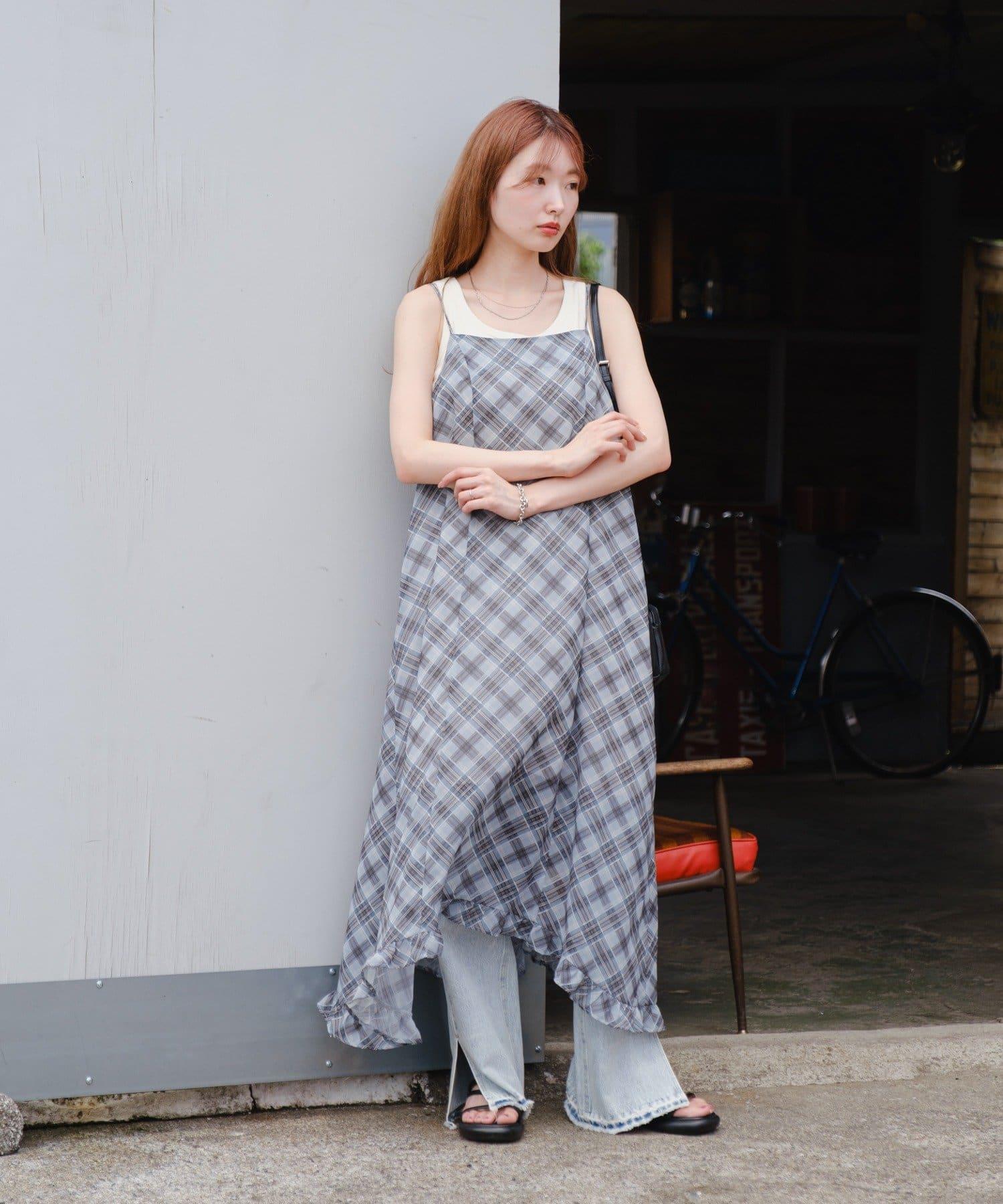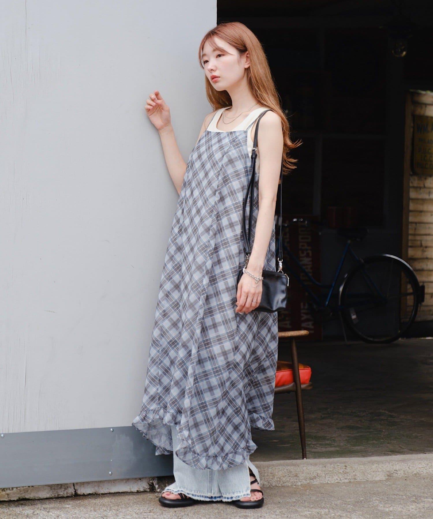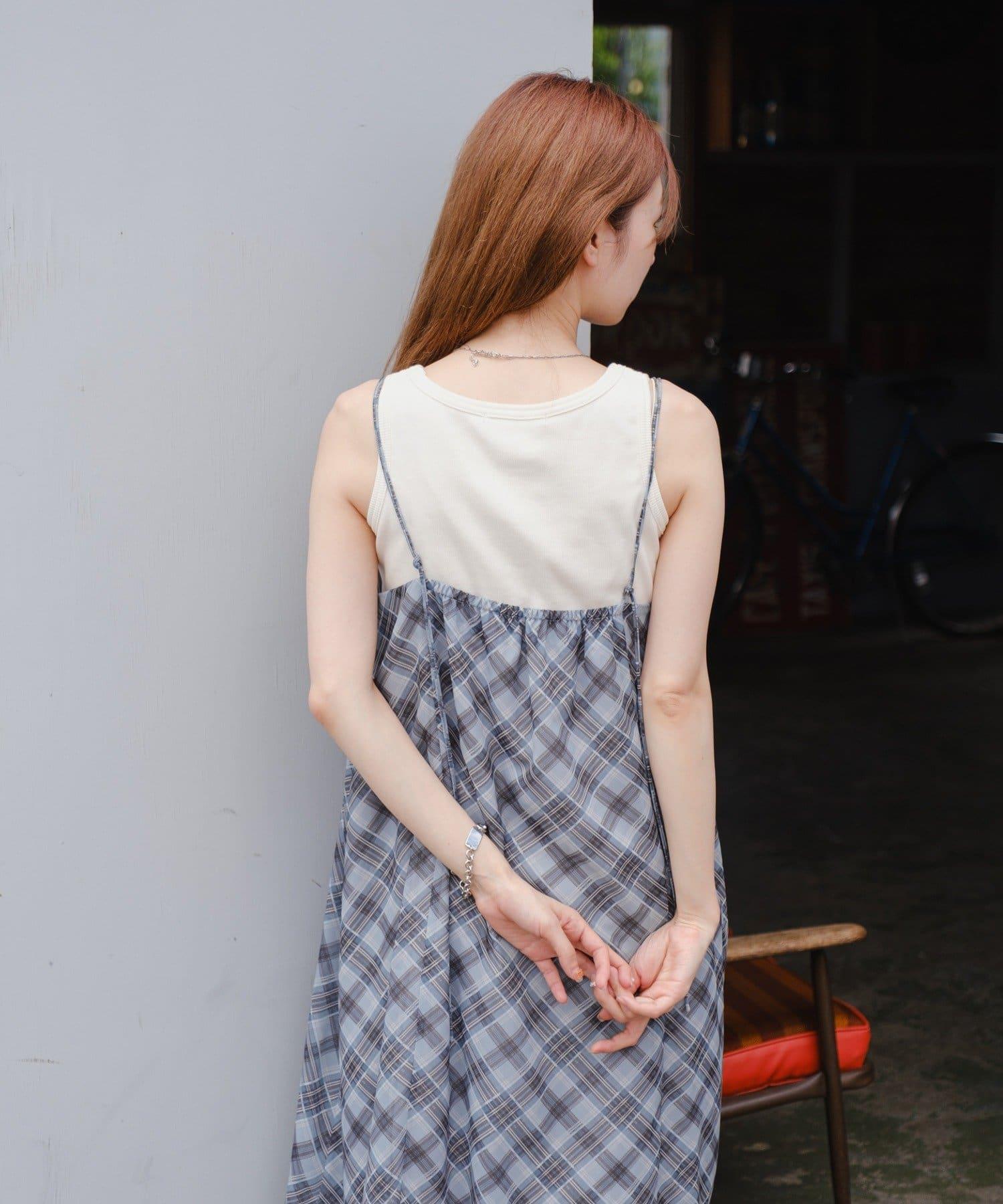 【肩帶可調節/內襯附】透視格紋不對稱連衣裙