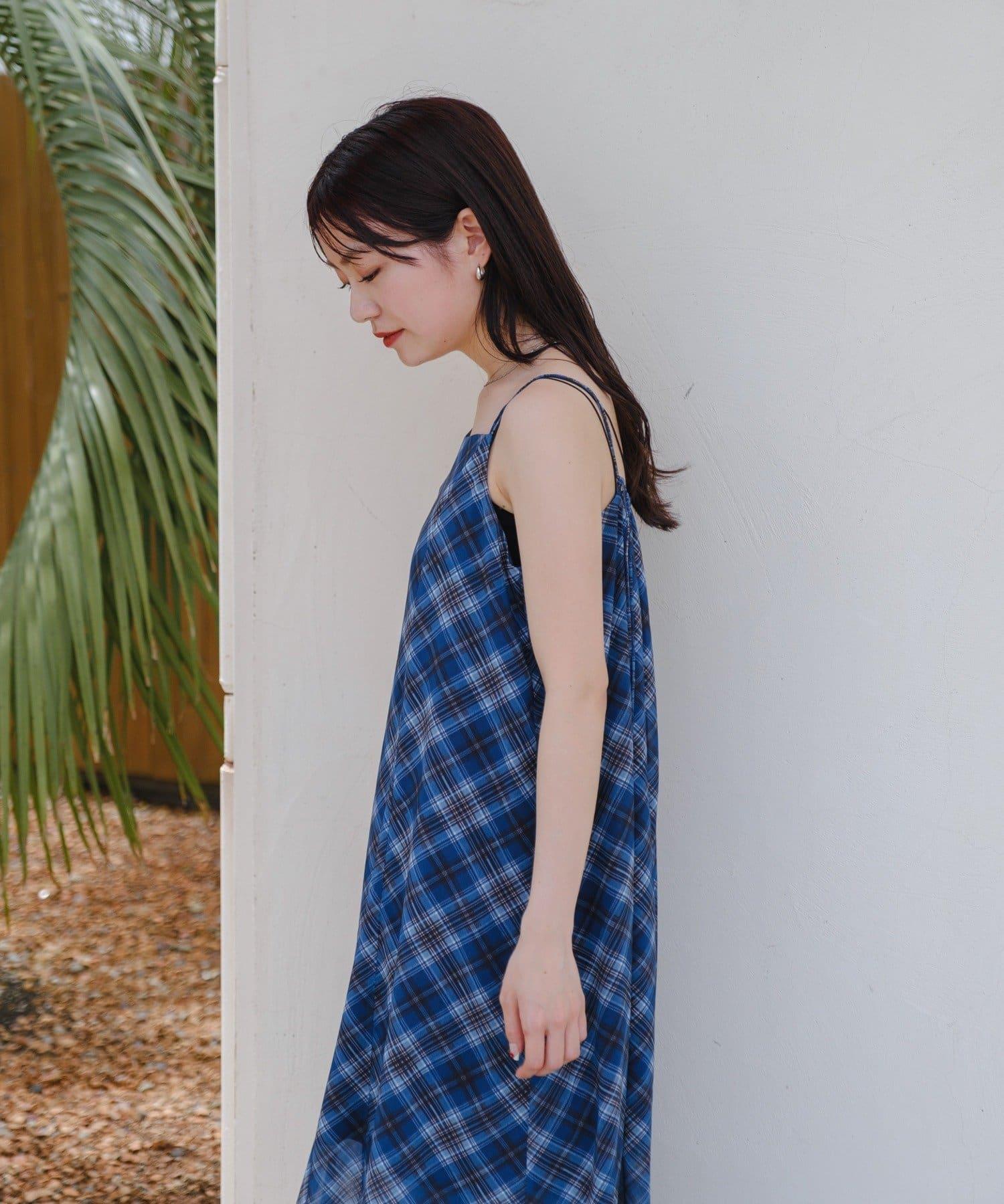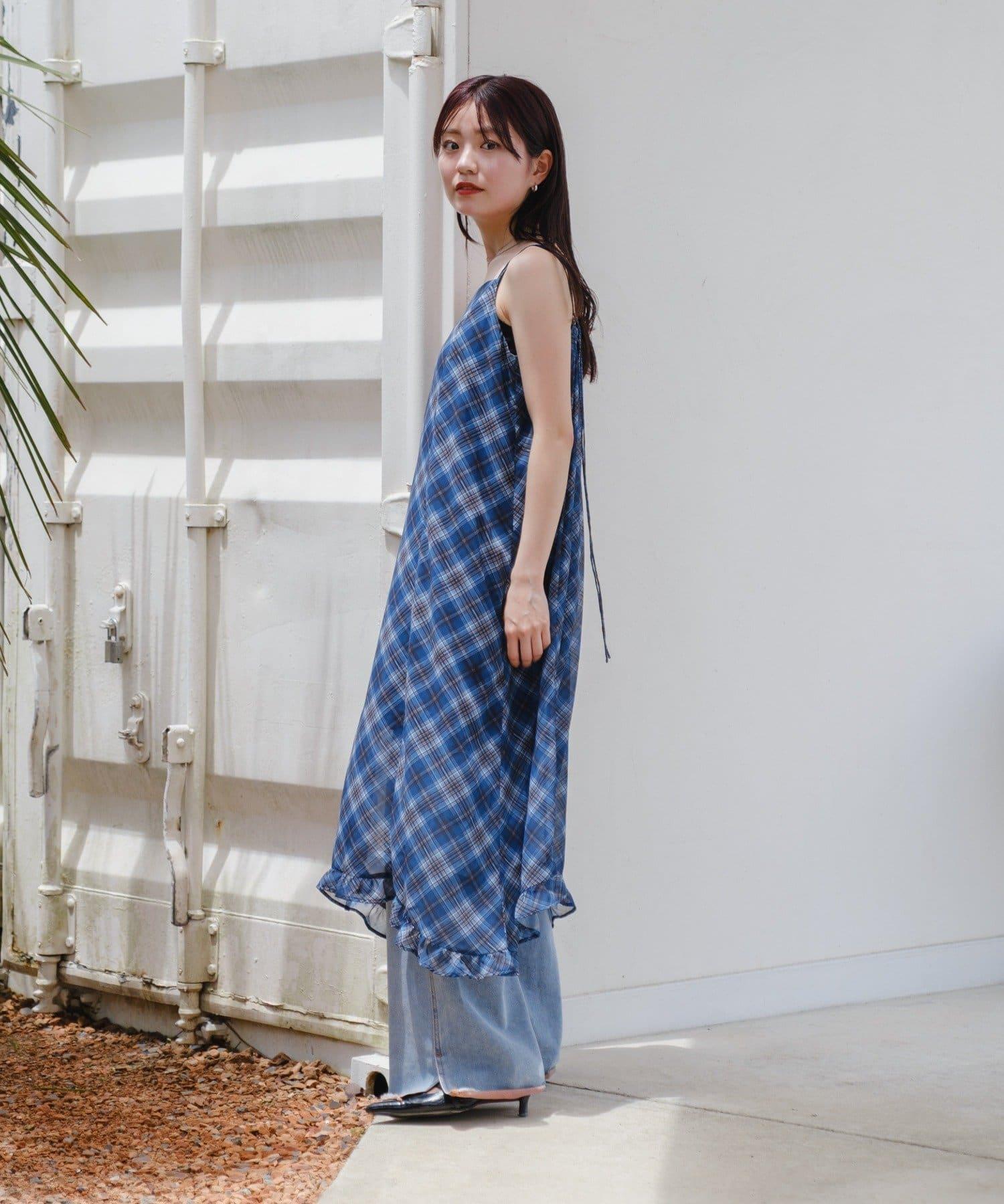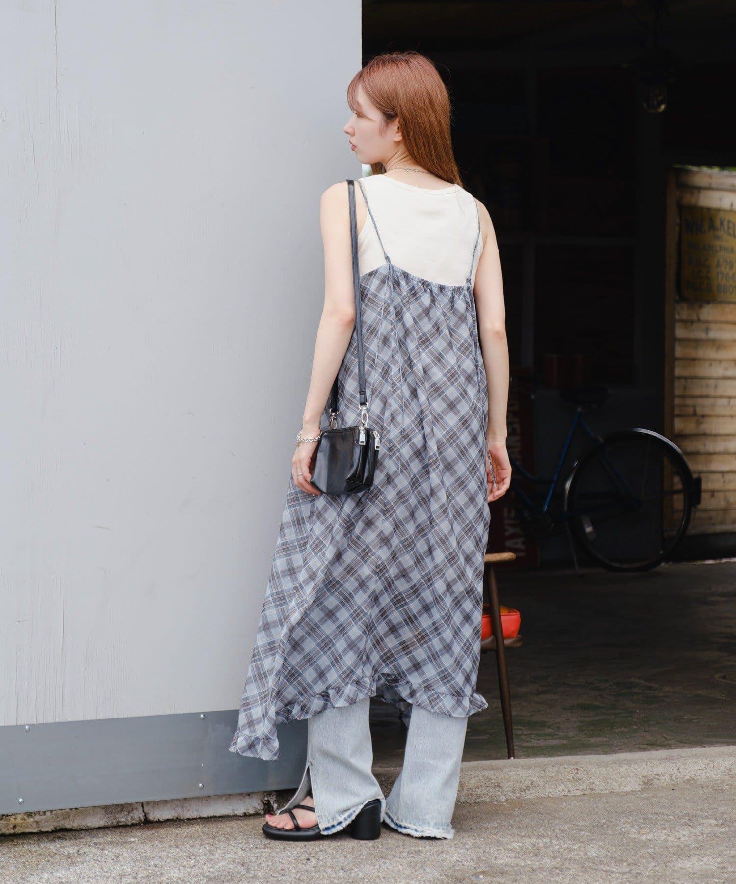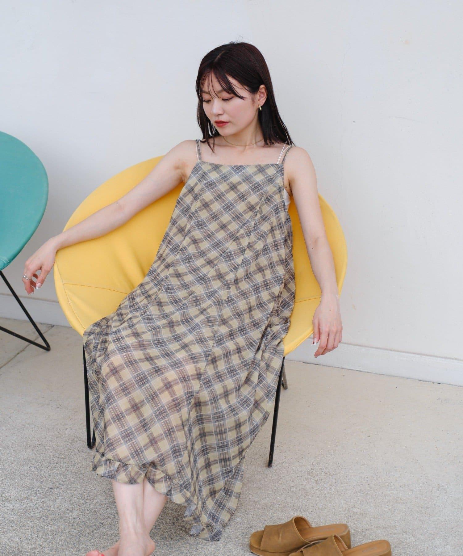 【肩帶可調節/內襯附】透視格紋不對稱連衣裙