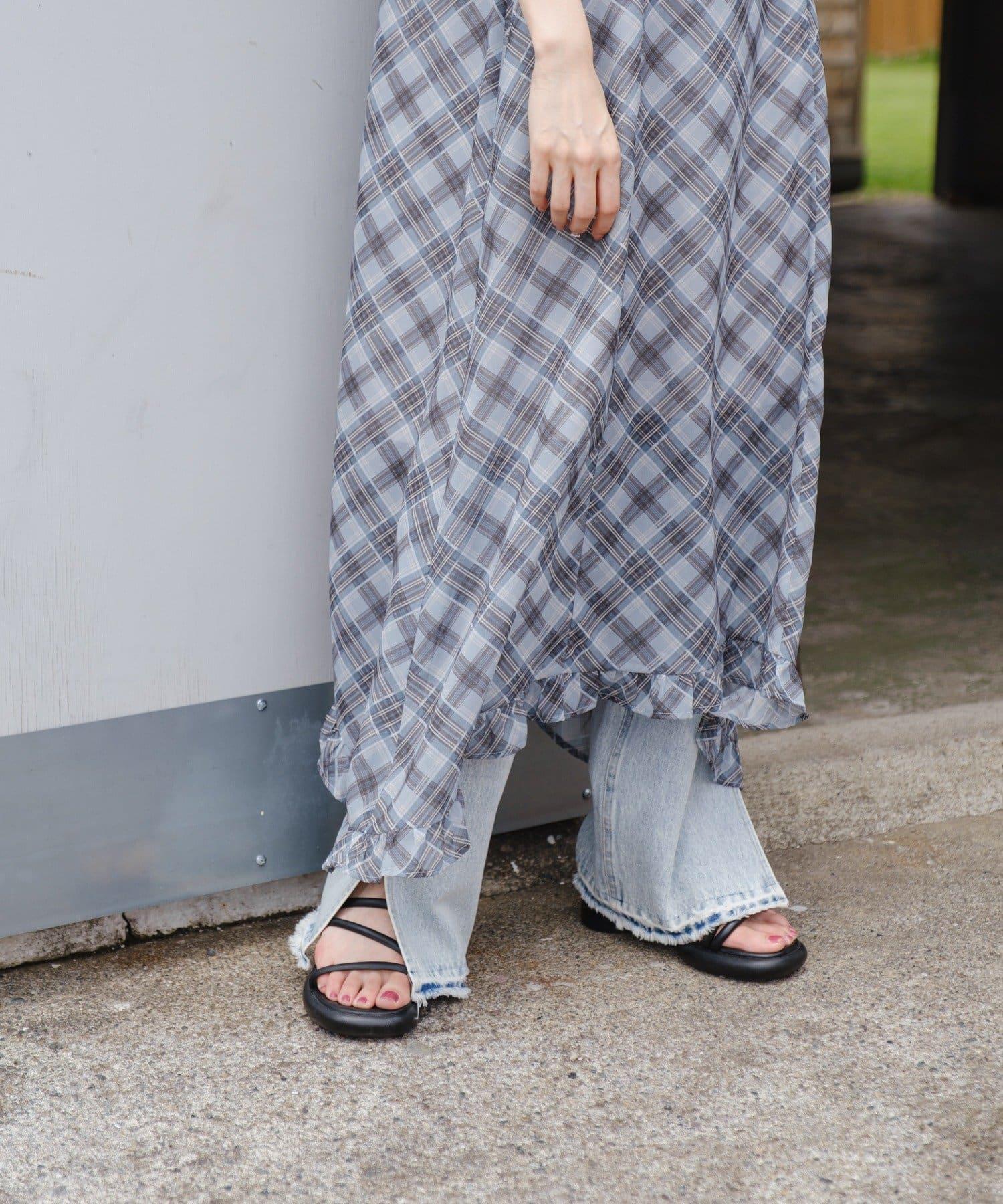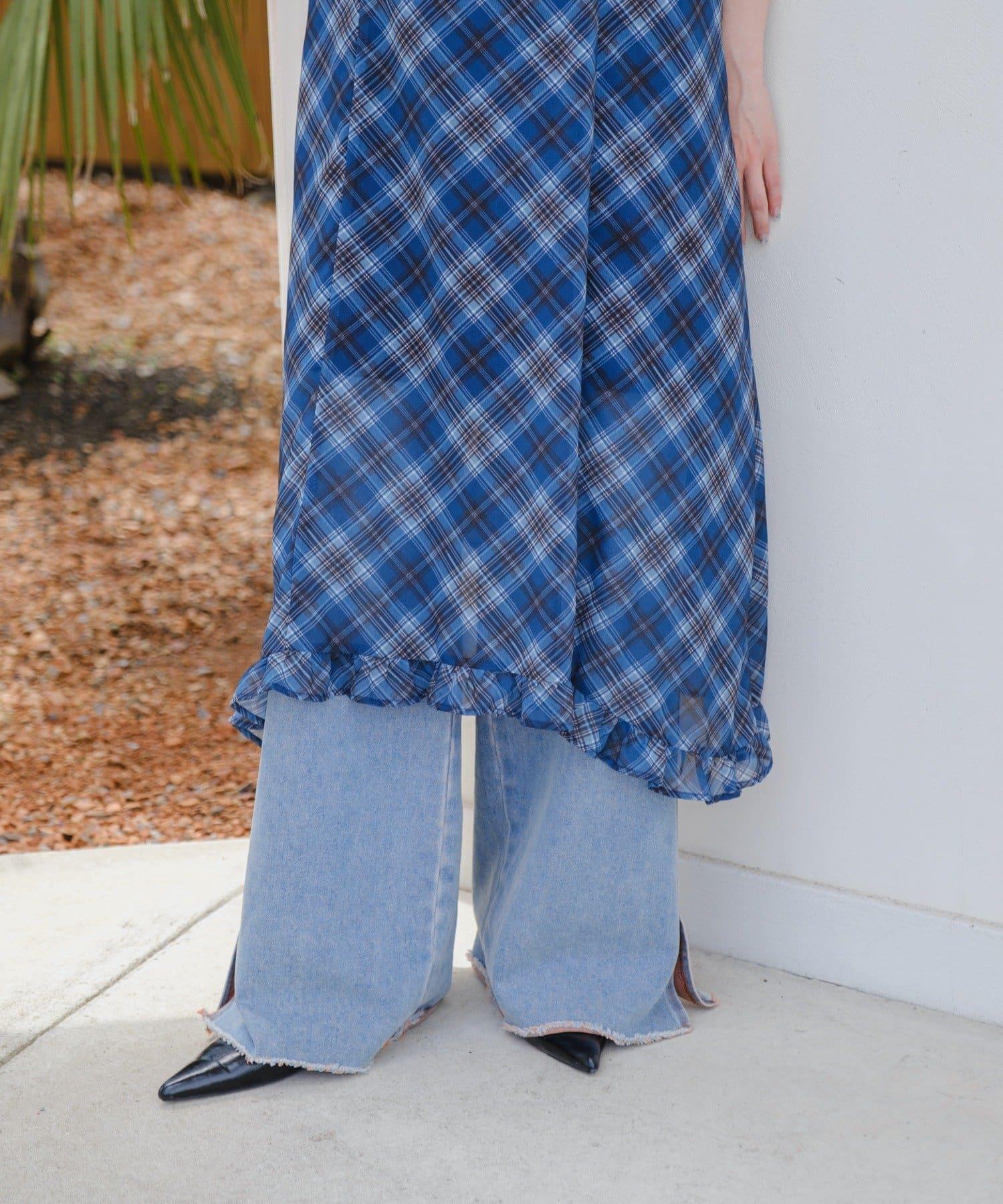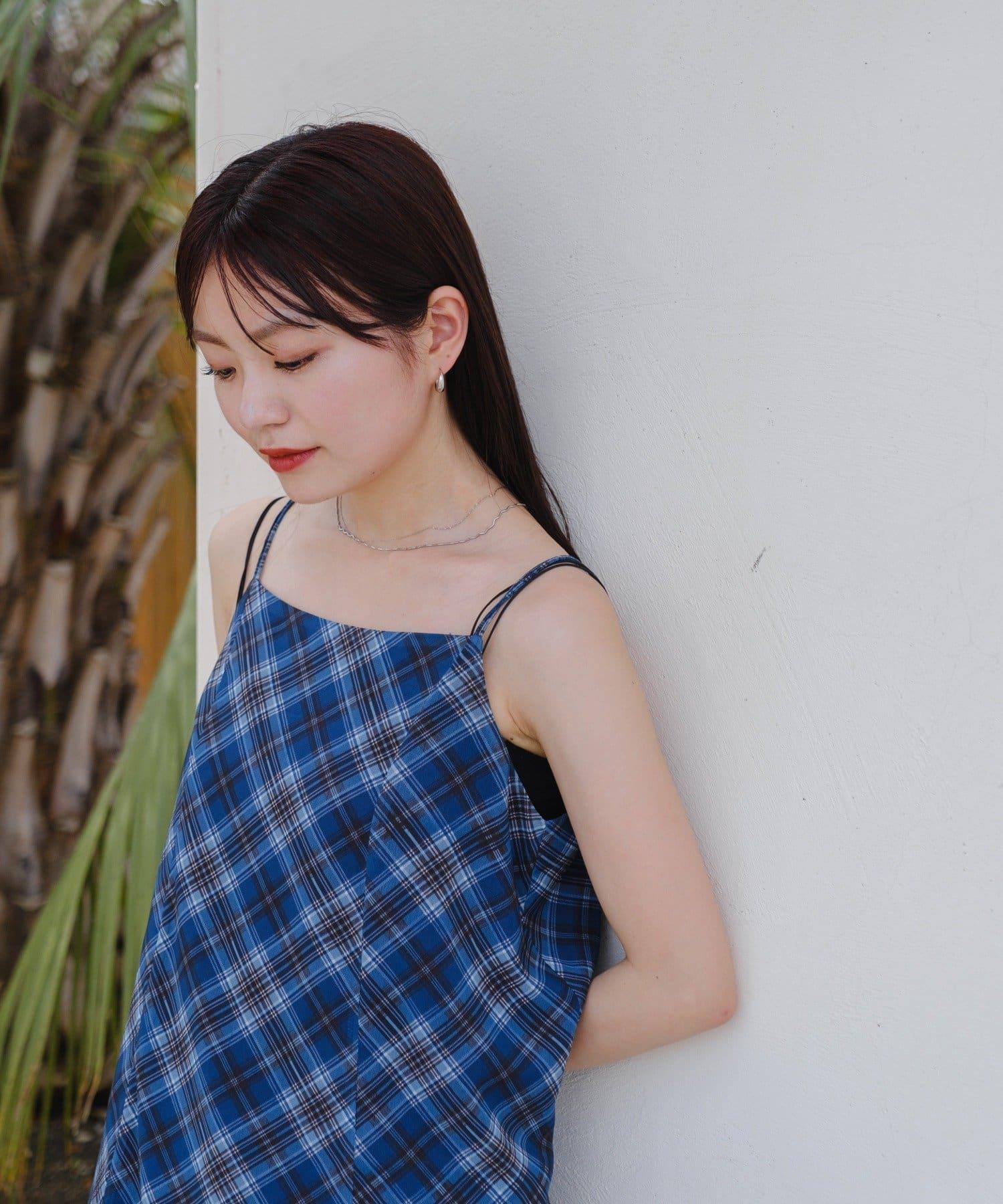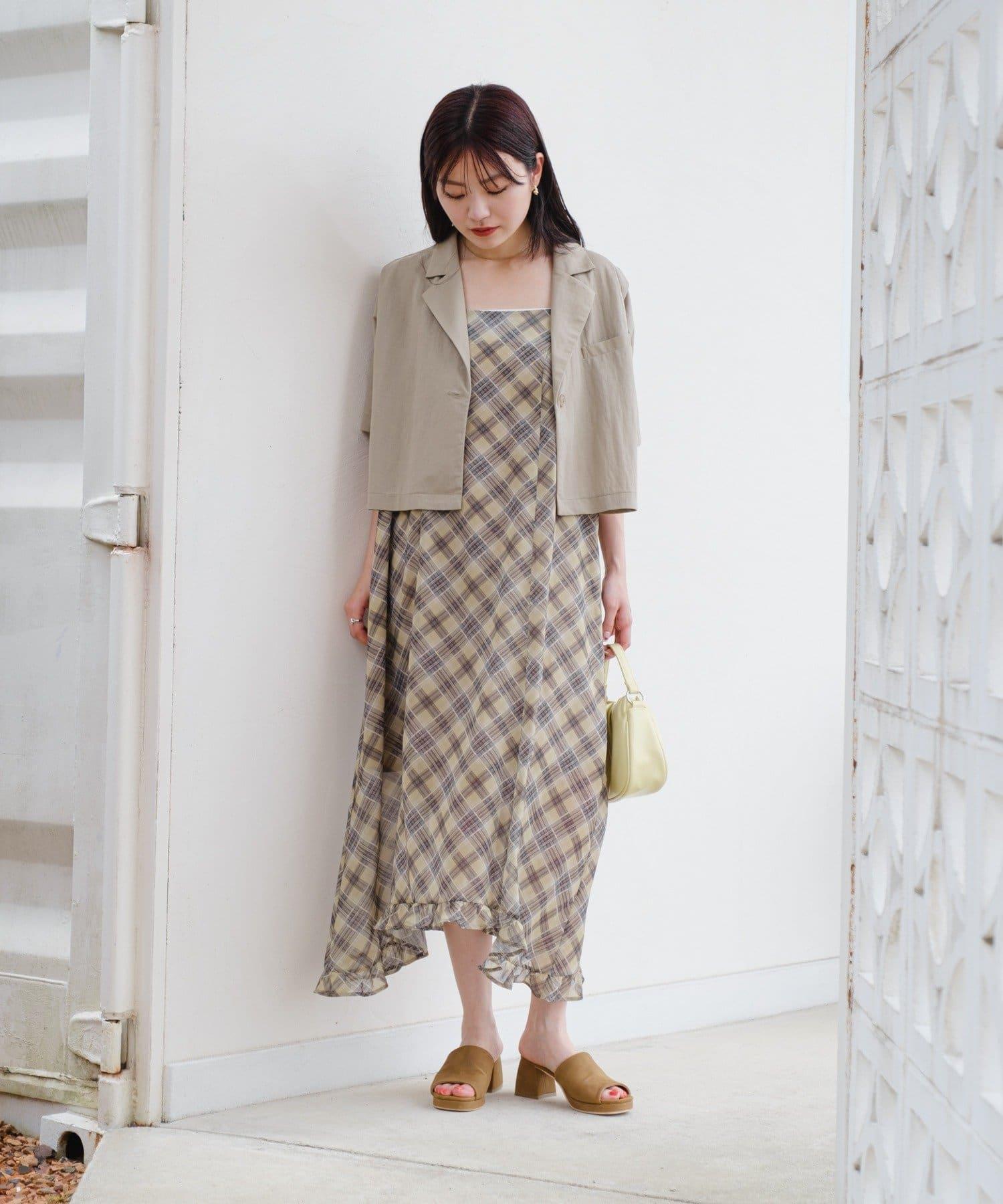 【肩帶可調節/內襯附】透視格紋不對稱連衣裙