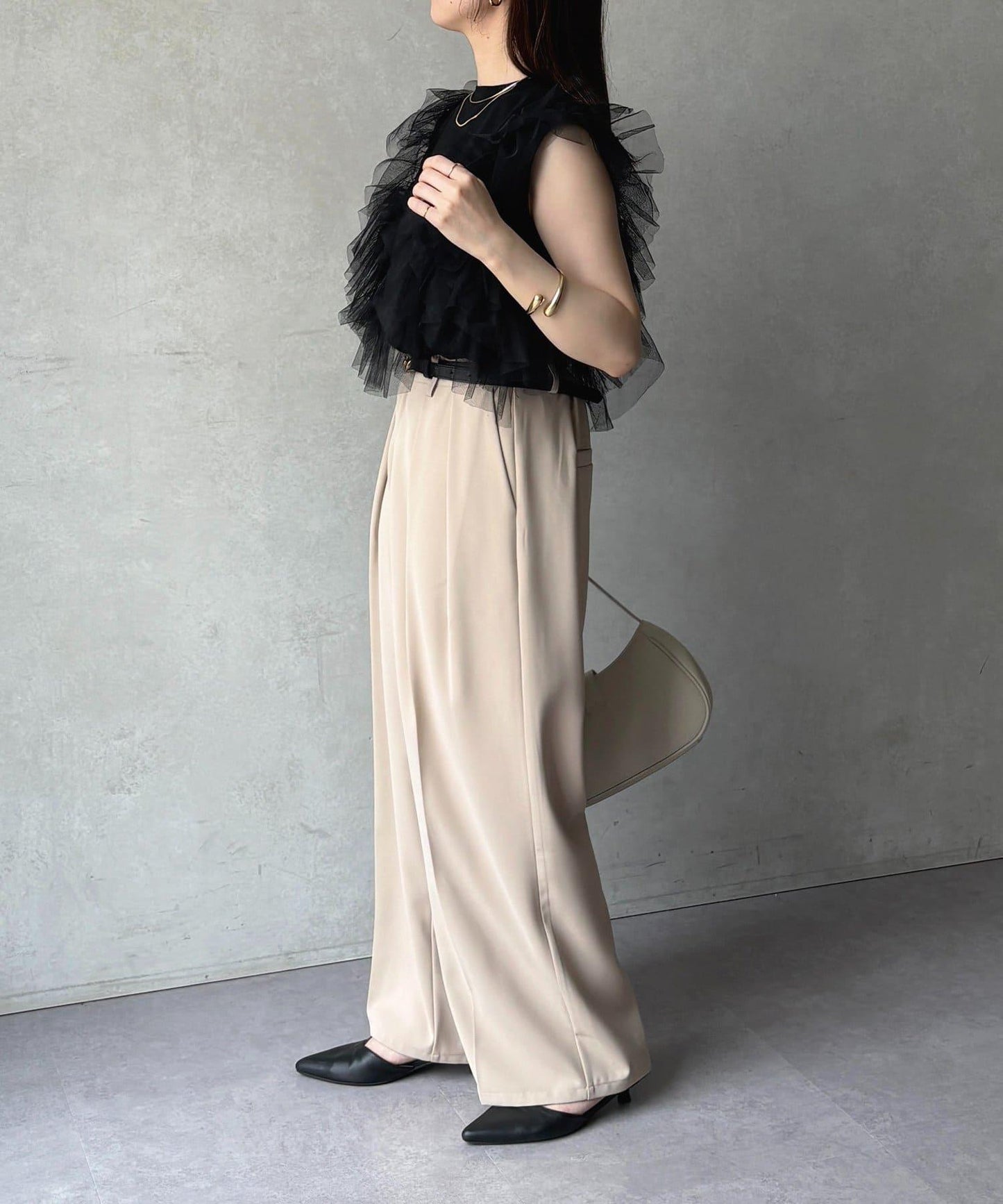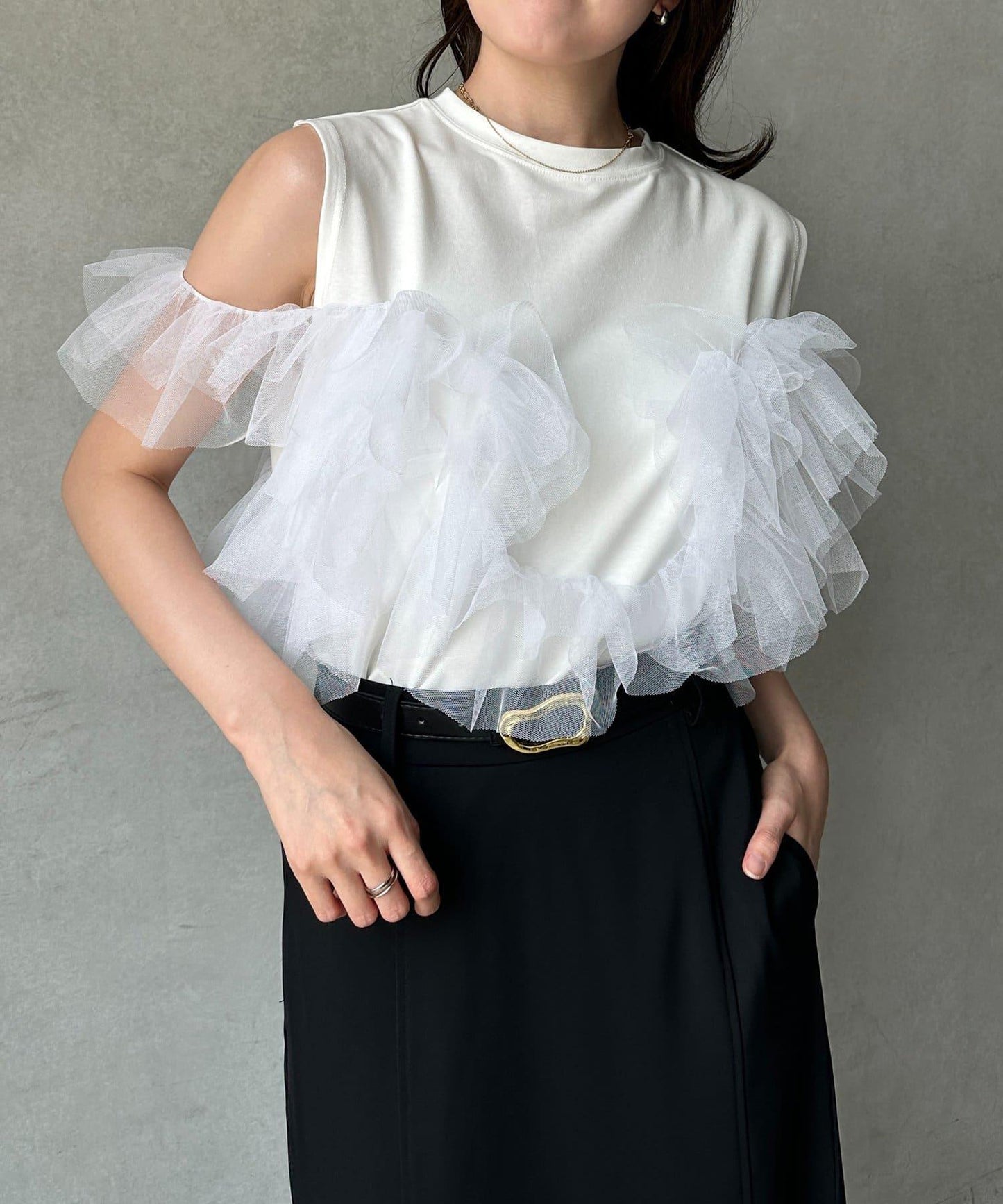 肩部荷葉邊可拉至手臂處,讓你看起來更輕鬆。