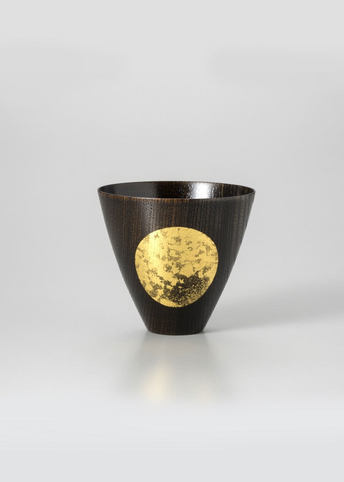 金澤箔小白杯(小)這款餐具的設計不僅僅是為了美,也是為了在現代生活環境中使用,有一種溫暖而清爽的感覺。木材的紋理被利用起來,通過添加 "金箔 "oborozuki,使木材的紋理成為一道風景,從而創造出一種美麗的餐具。這個容器是工藝組合的結果。熟練的木工將木材切得很薄,然後上漆,以凸顯木材的美感,而月亮則是由貼金箔的工匠僅用金箔就表現為天空中的風景。