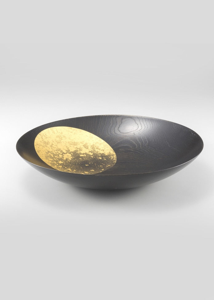 這款餐具的設計不僅僅是為了美,也是為了在現代生活環境中使用,具有溫暖而又鮮明的設計。木材的紋理被利用起來,通過添加 "金箔 "oborozuki,使木材的紋理成為一道風景,從而創造出一種美麗的餐具。這個器皿是一種工藝組合的結果。熟練的木工將木材切得很薄,然後上漆,以凸顯木材的美感,而月亮則由貼金工藝師僅用金箔就表現為天空中的風景。