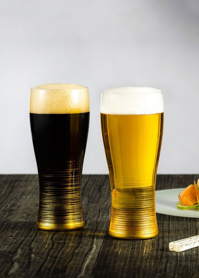 玻璃杯的形狀像一個口杯,裝飾有精緻的金箔千壽寺圖案。這種設計可以增強啤酒的氣泡,保持啤酒的醇厚口感。一直以來,千壽寺圖案作為一種小圖案深受人們喜愛,例如用於焙燒漆器上。在 Foilichi,我們使用金箔來表現這種圖案,為每個人帶來愉悅的體驗。建議飲用啤酒。