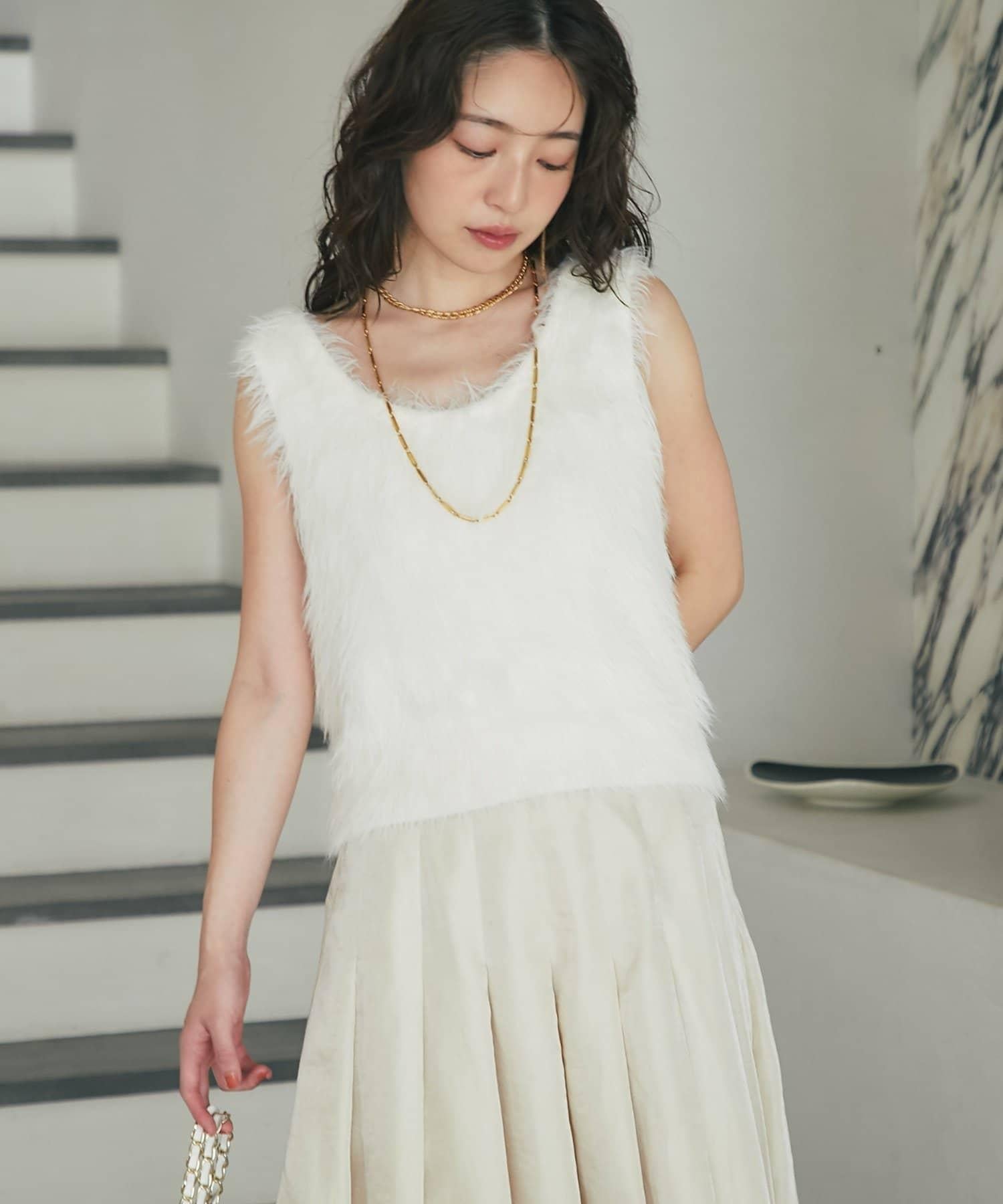 柔軟蓬鬆的針織馬甲,採用搶眼的長毛羽毛材質。