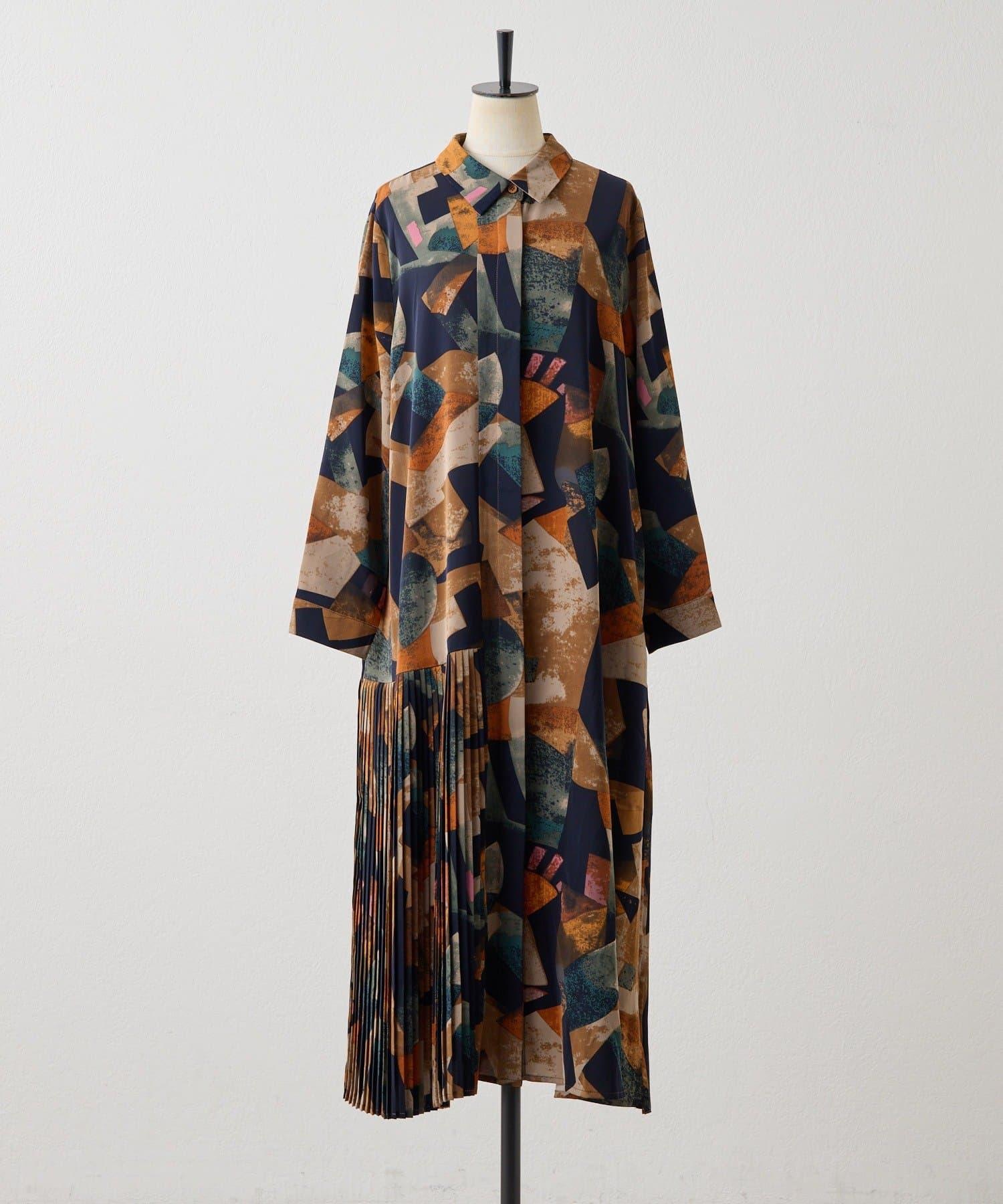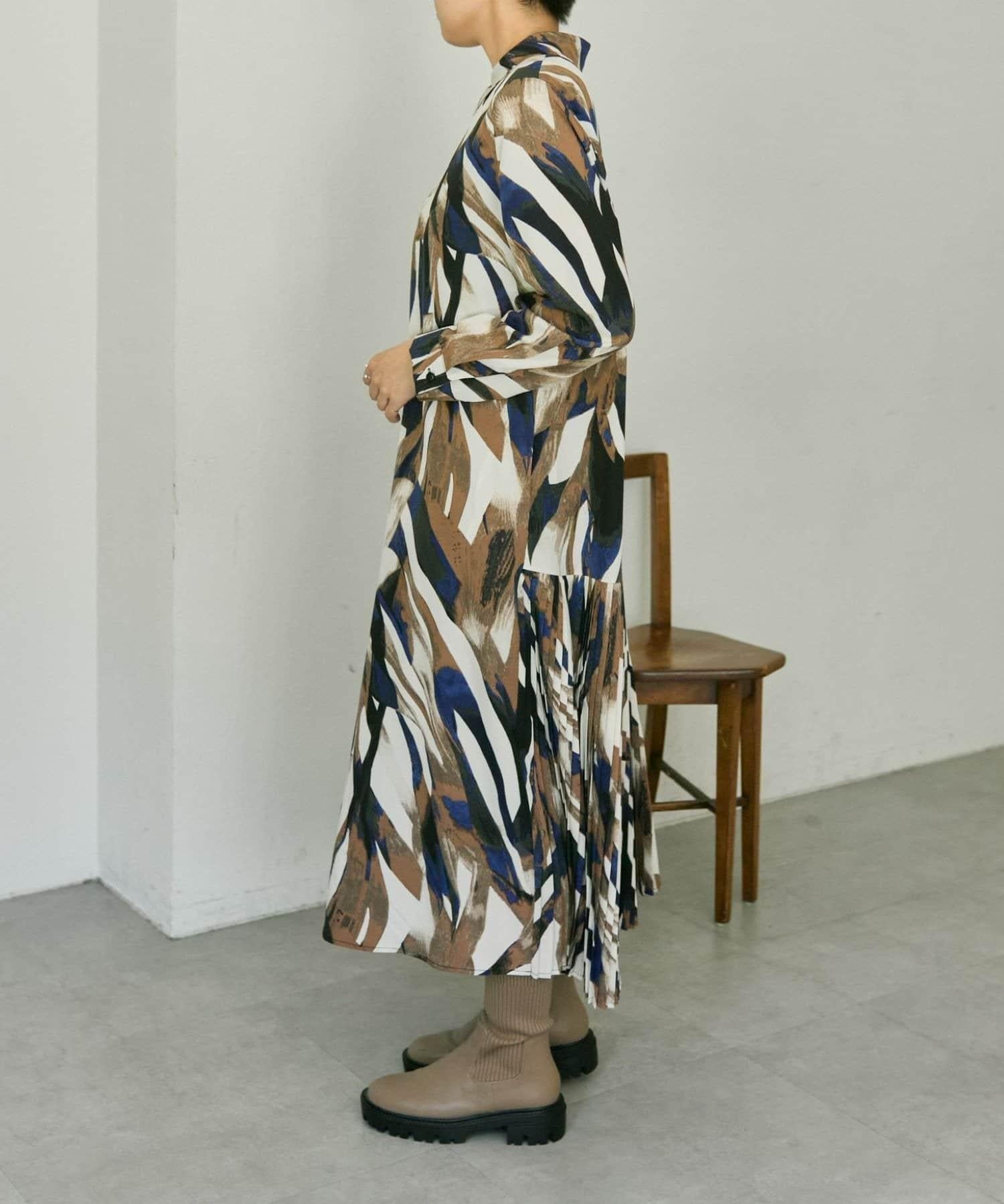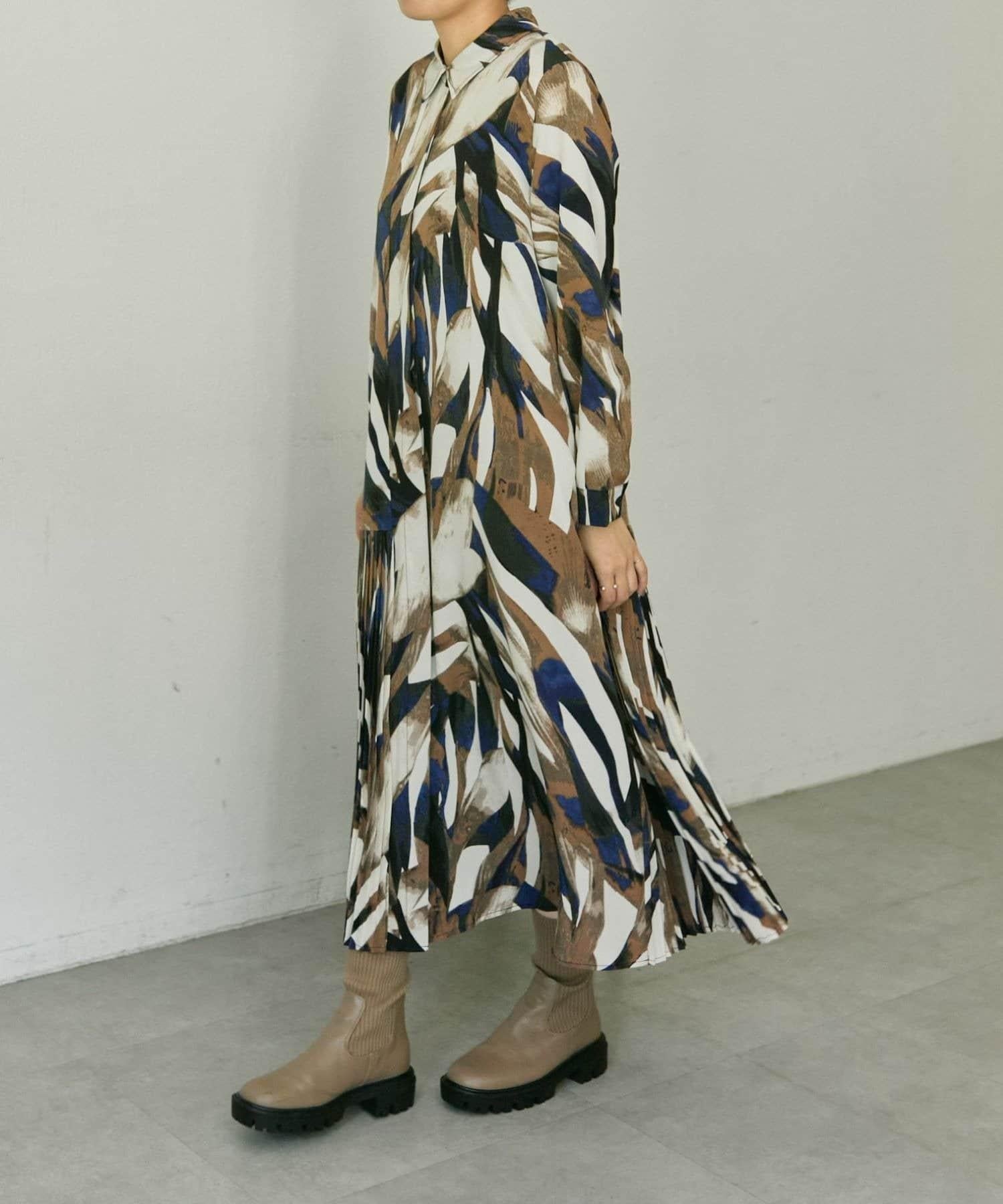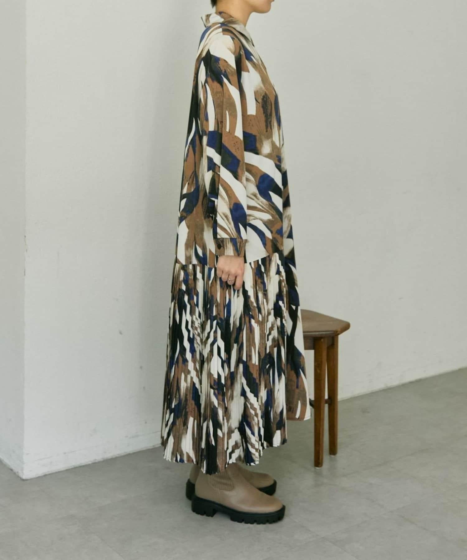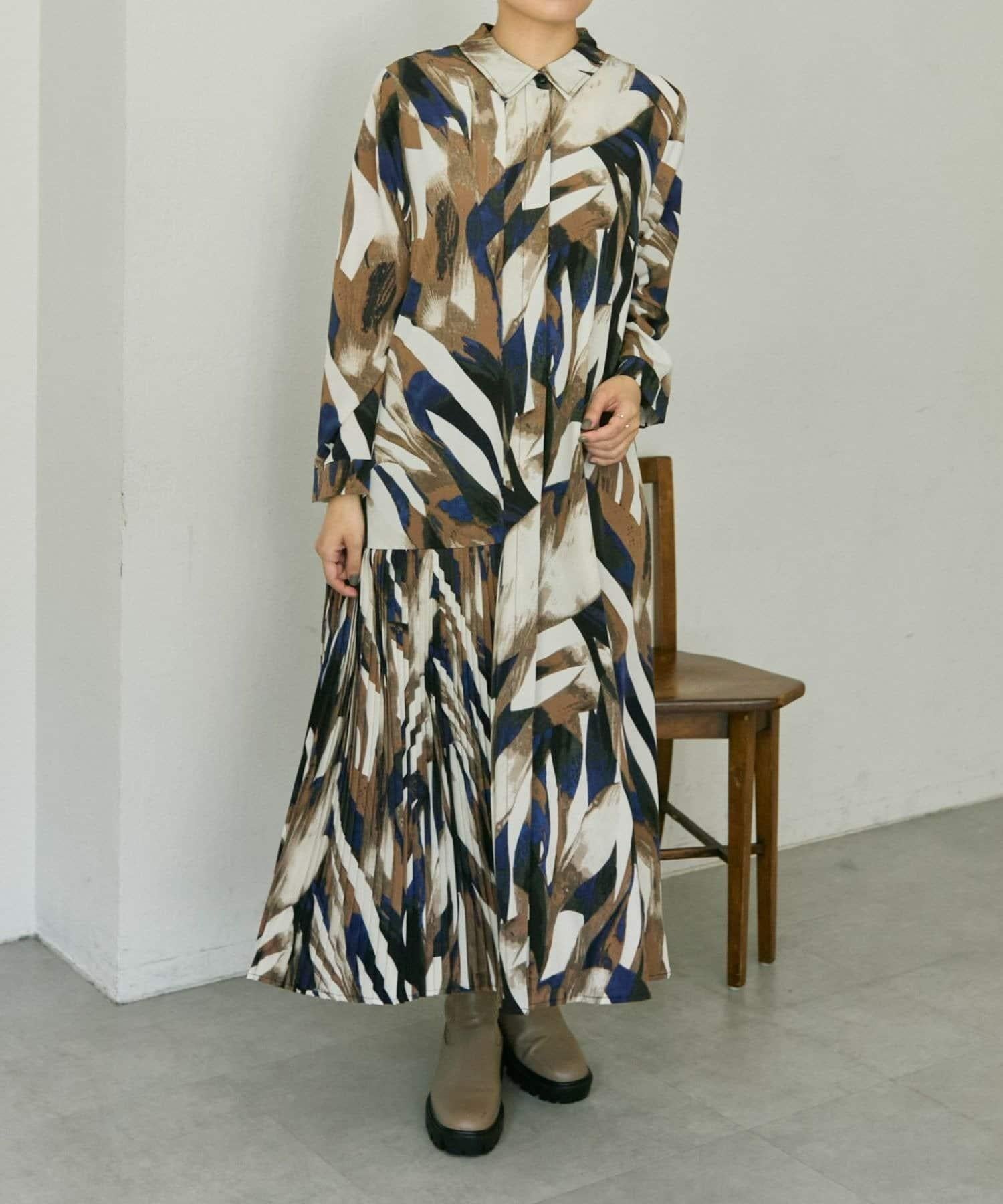 《1枚定型/全印花》帶領褶皺連衣裙【SUM1 STYLE(スミスタイル)】