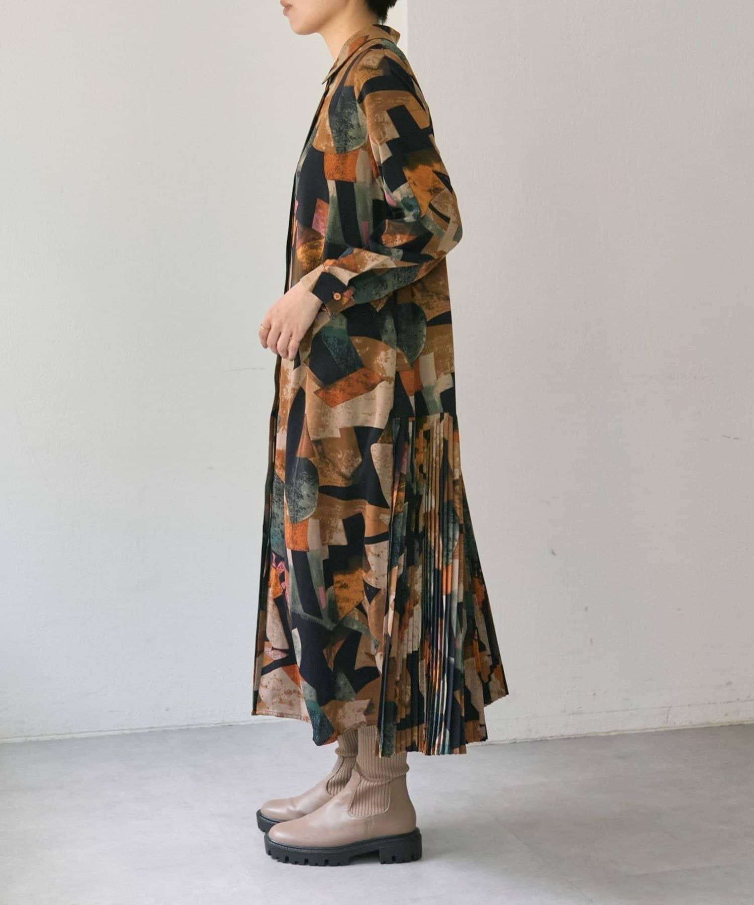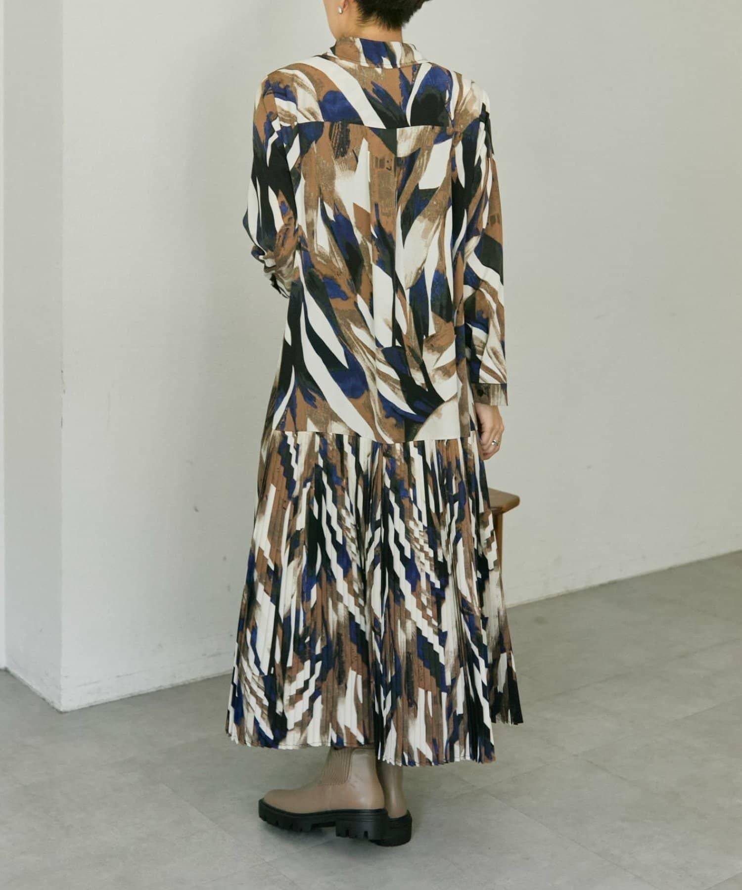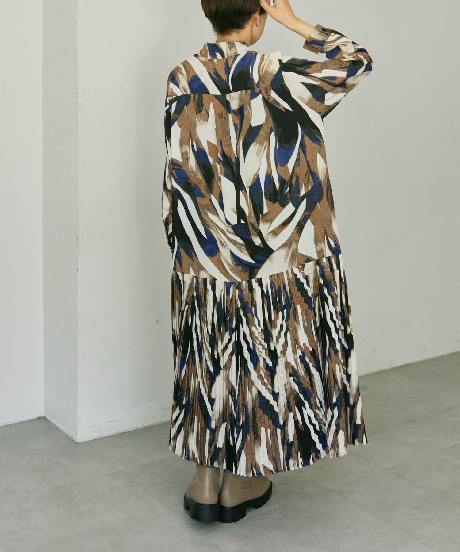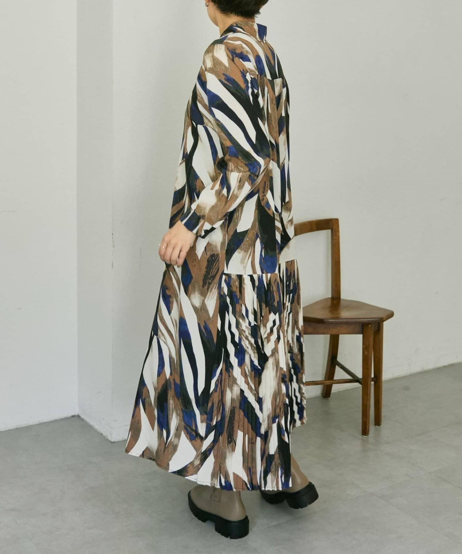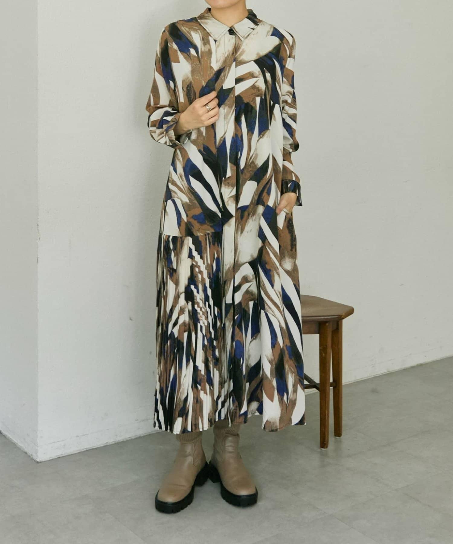 《1枚定型/全印花》帶領褶皺連衣裙【SUM1 STYLE(スミスタイル)】