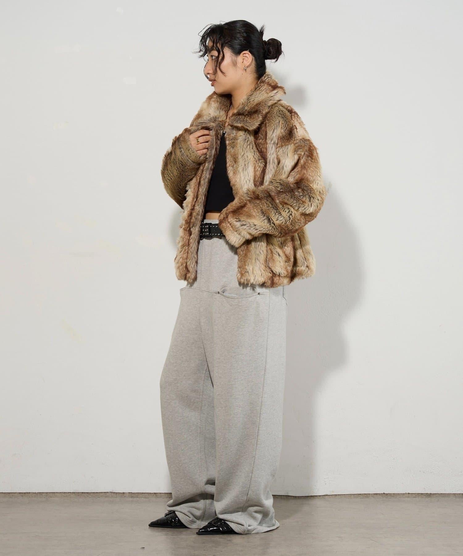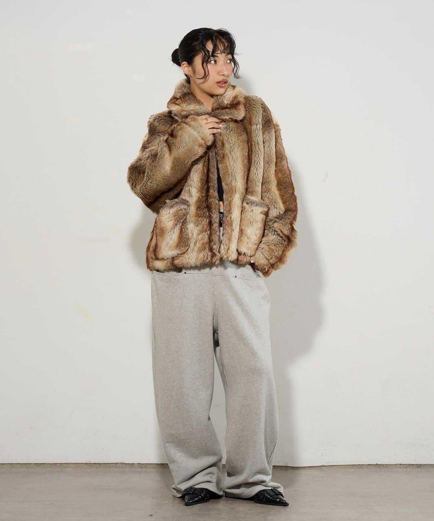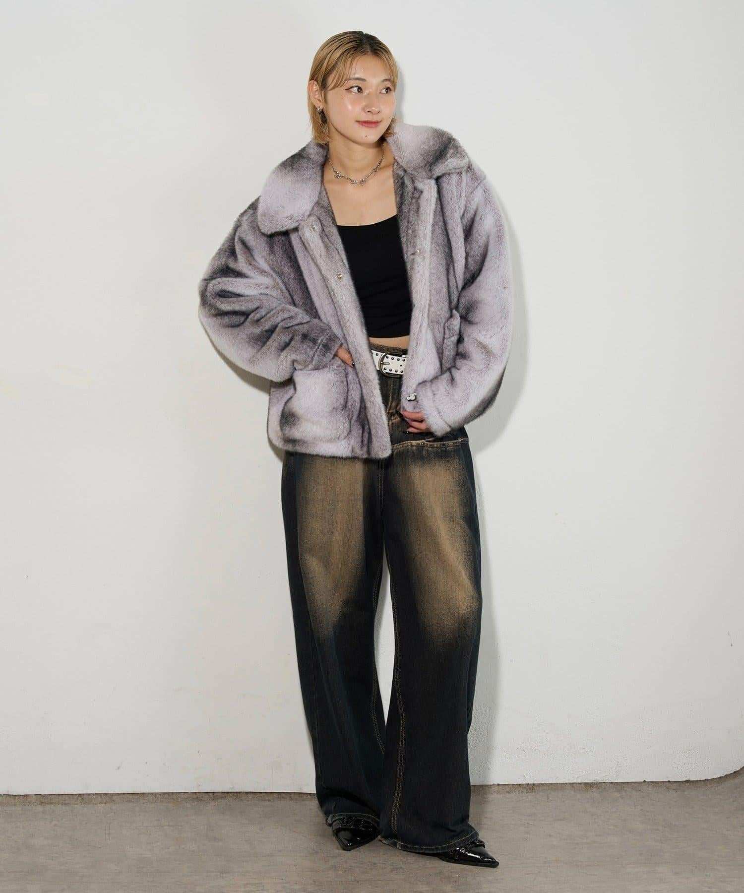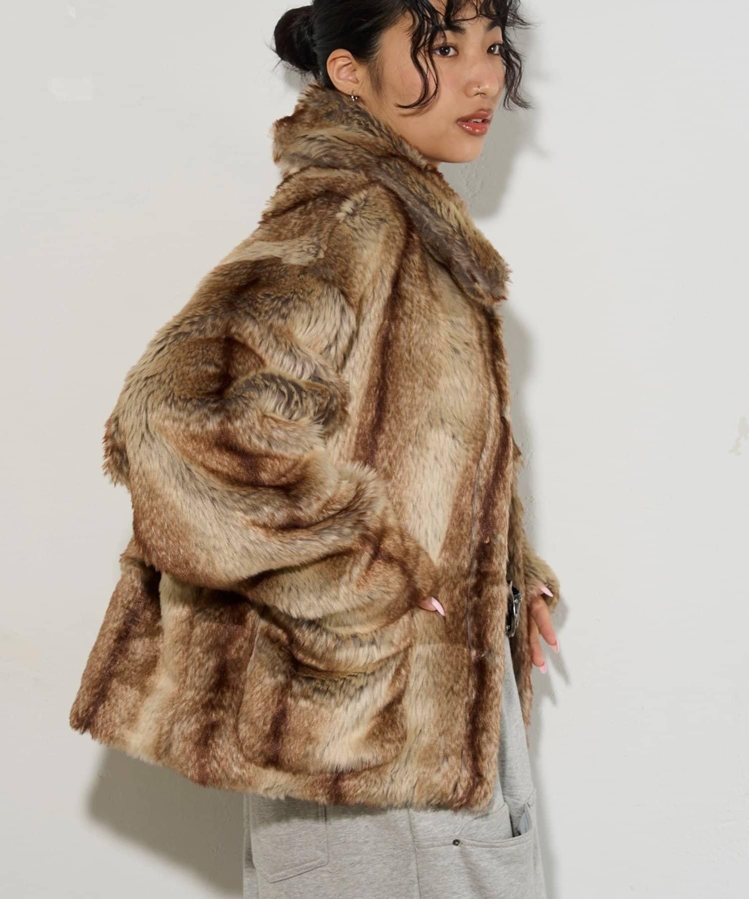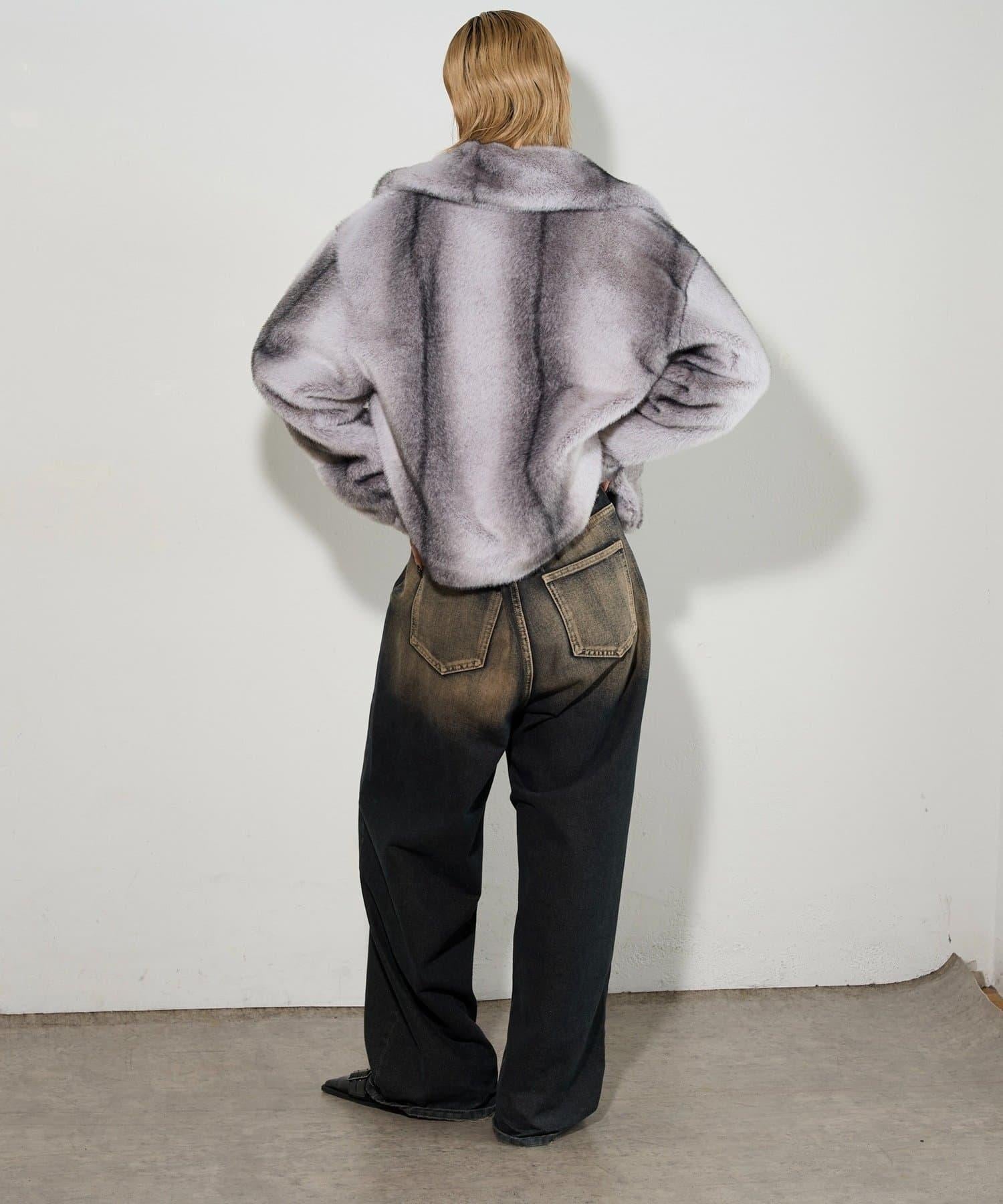 皮草夾克圖案獨特,搭配具有加工感的牛仔褲,看起來簡直酷斃了。