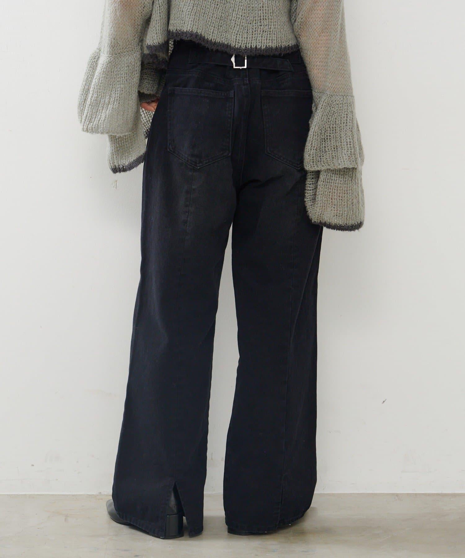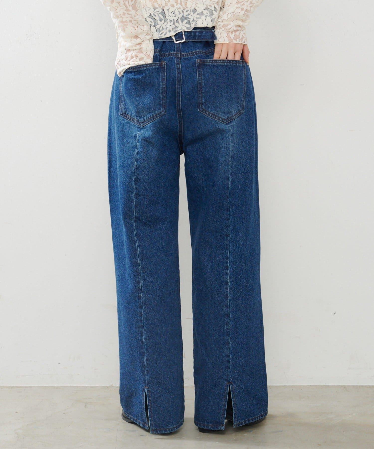 直筒牛仔褲,配有可調節腰帶,背部設計可愛。