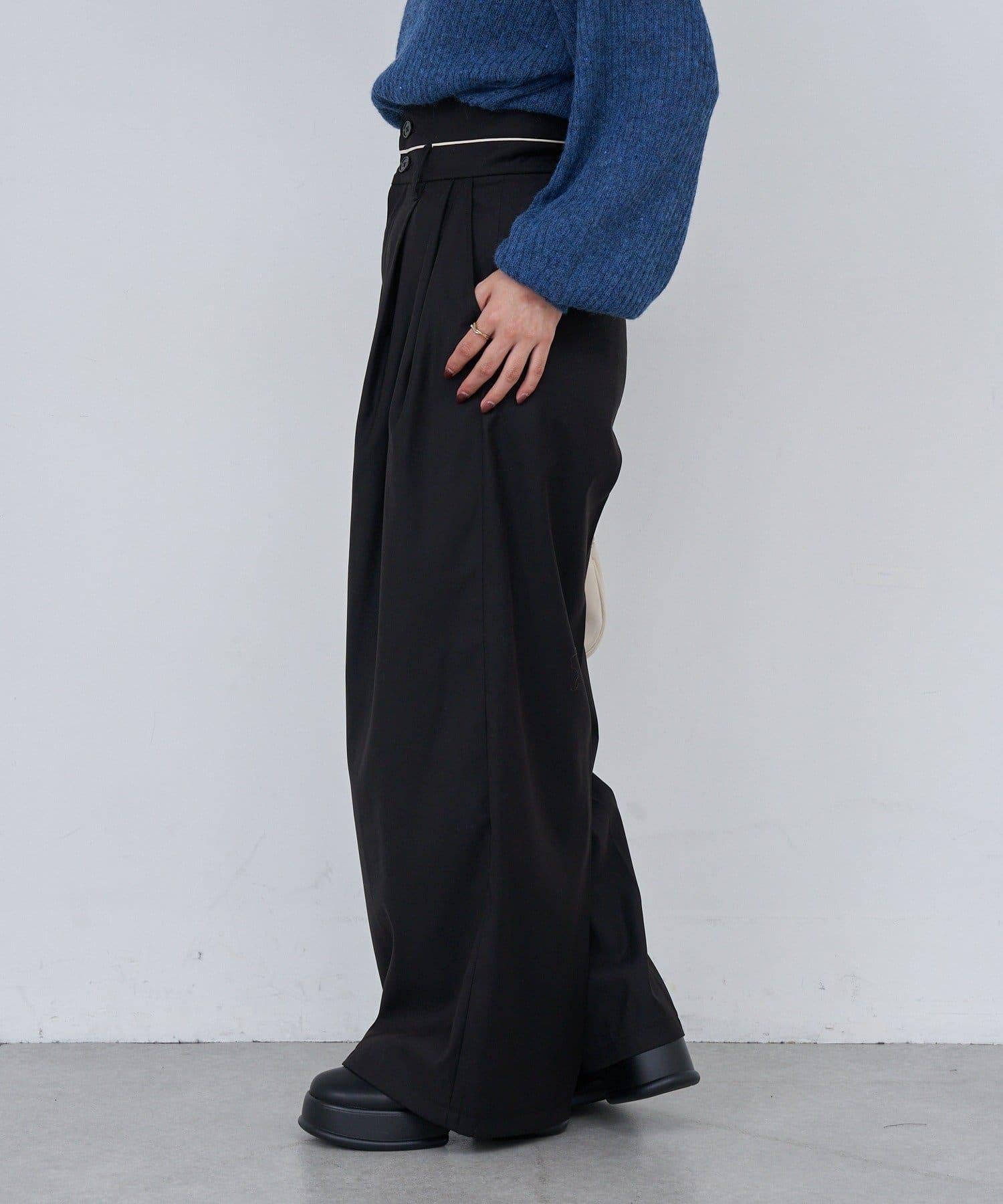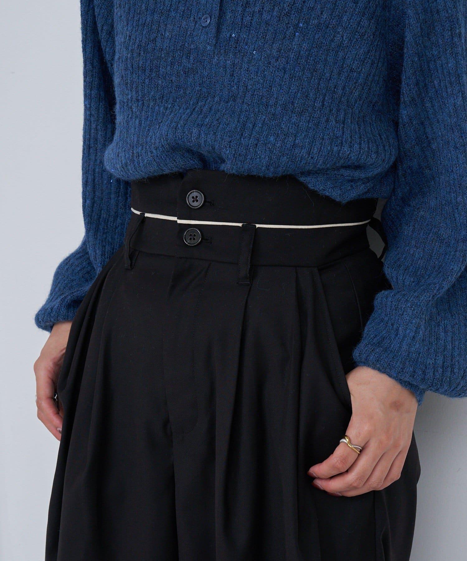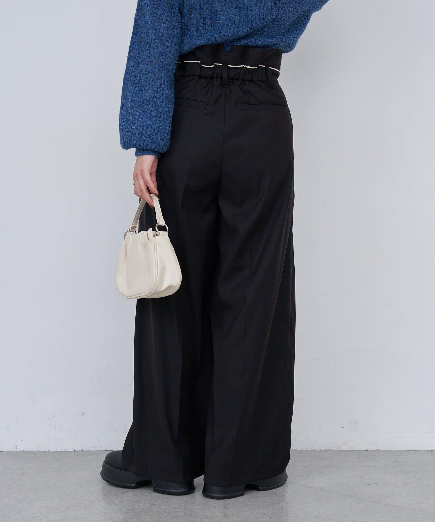 這款高腰長褲的腰部採用滾邊設計。