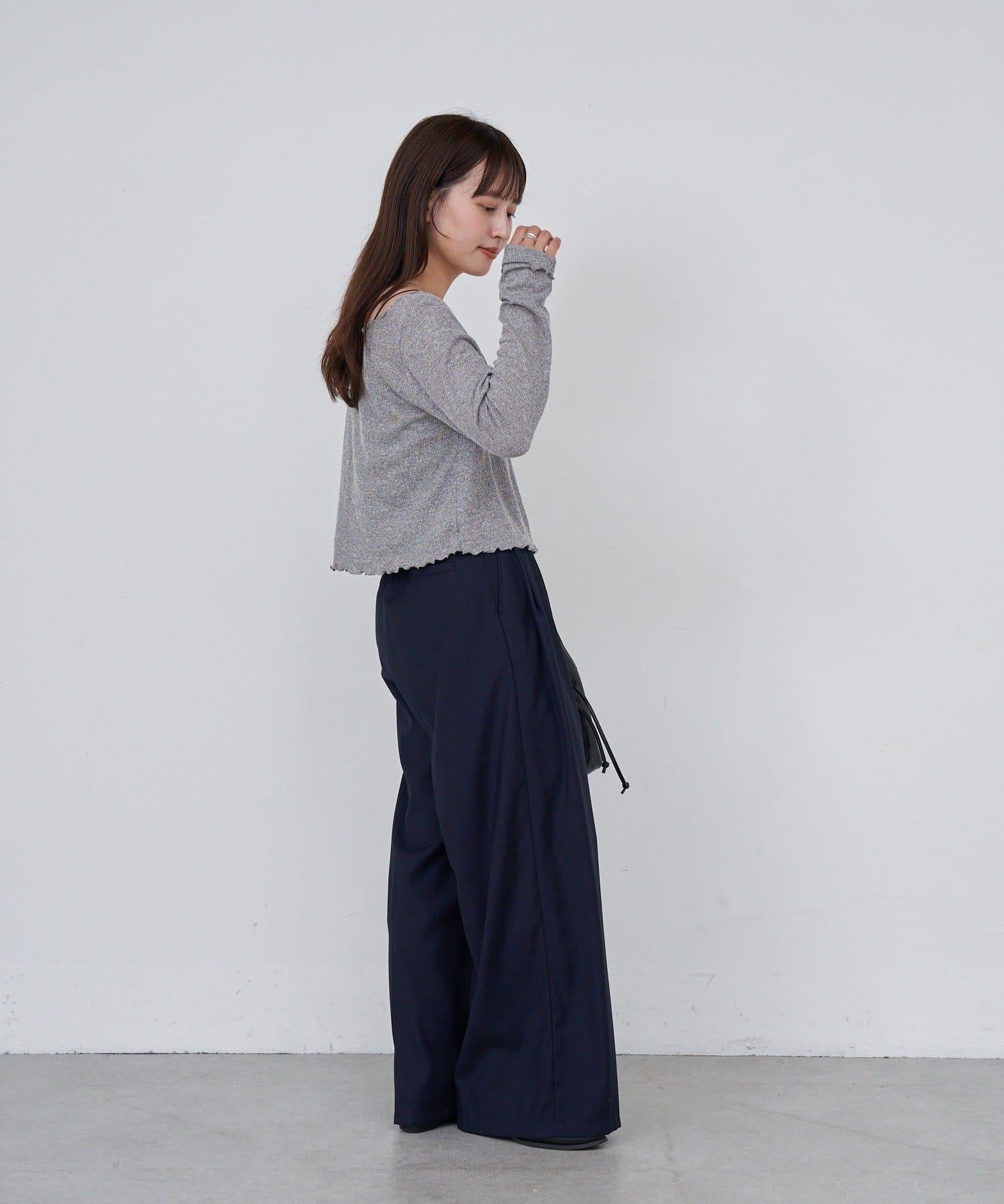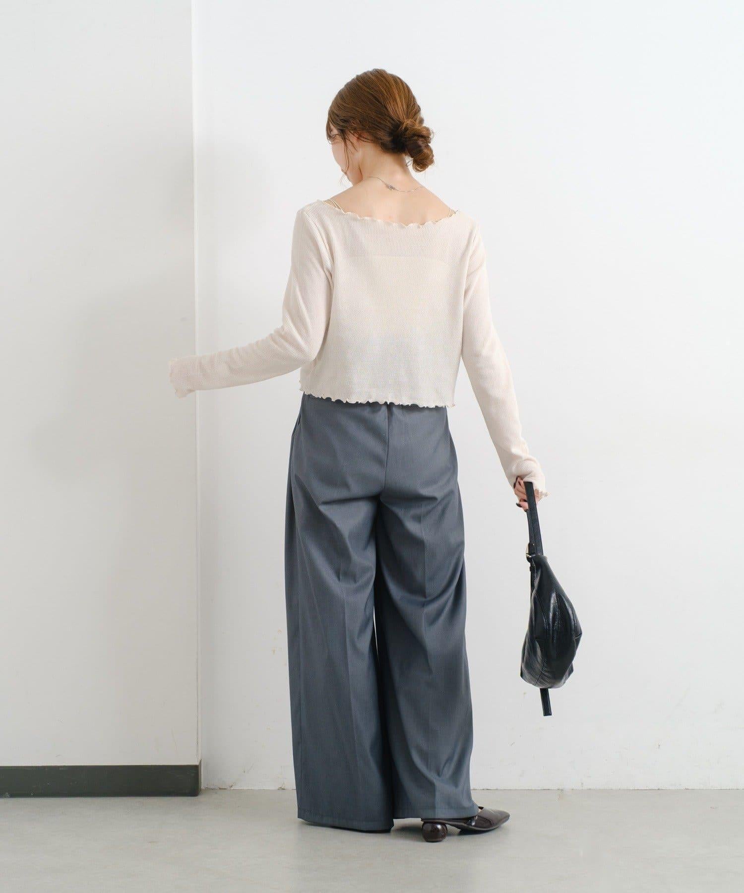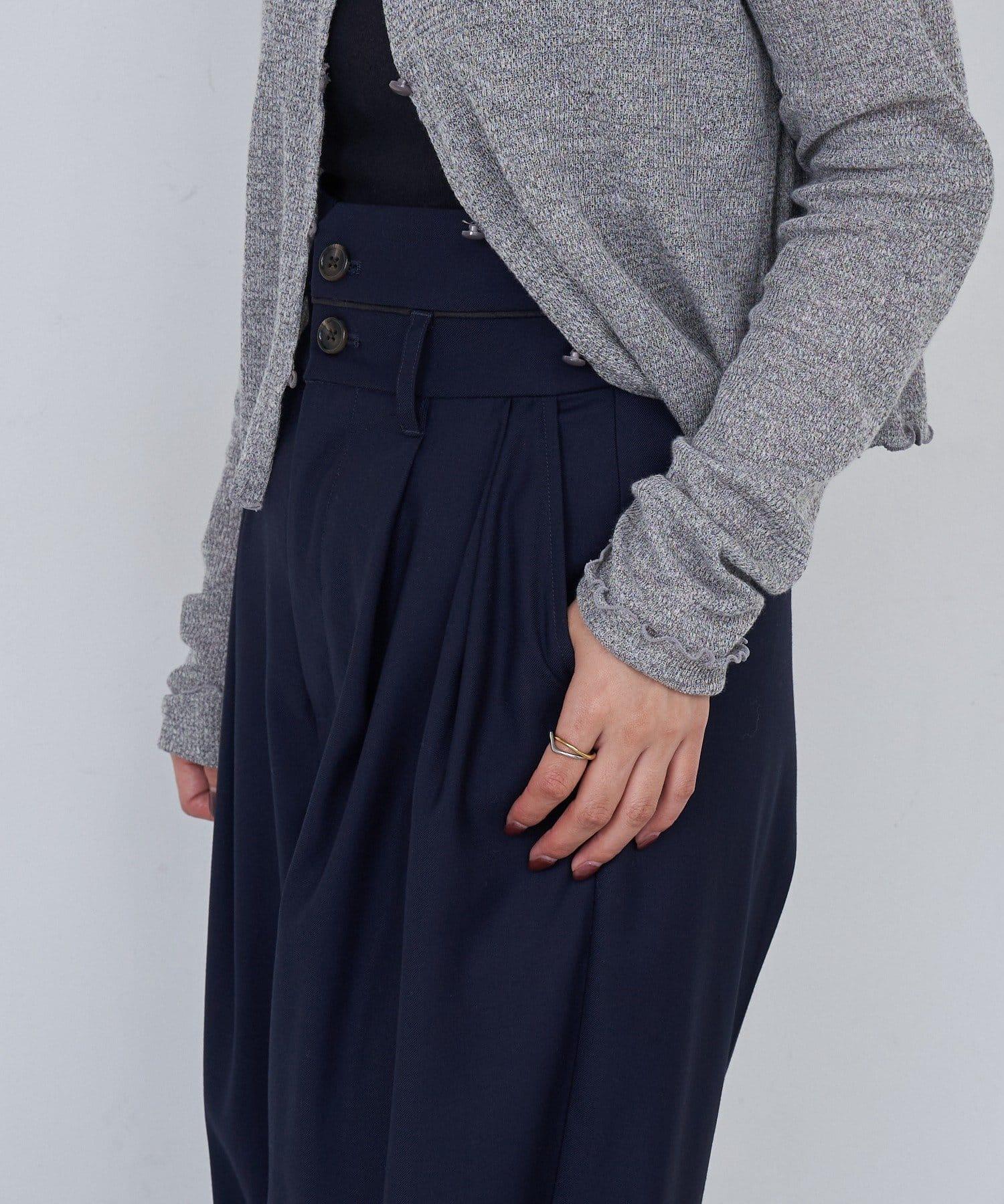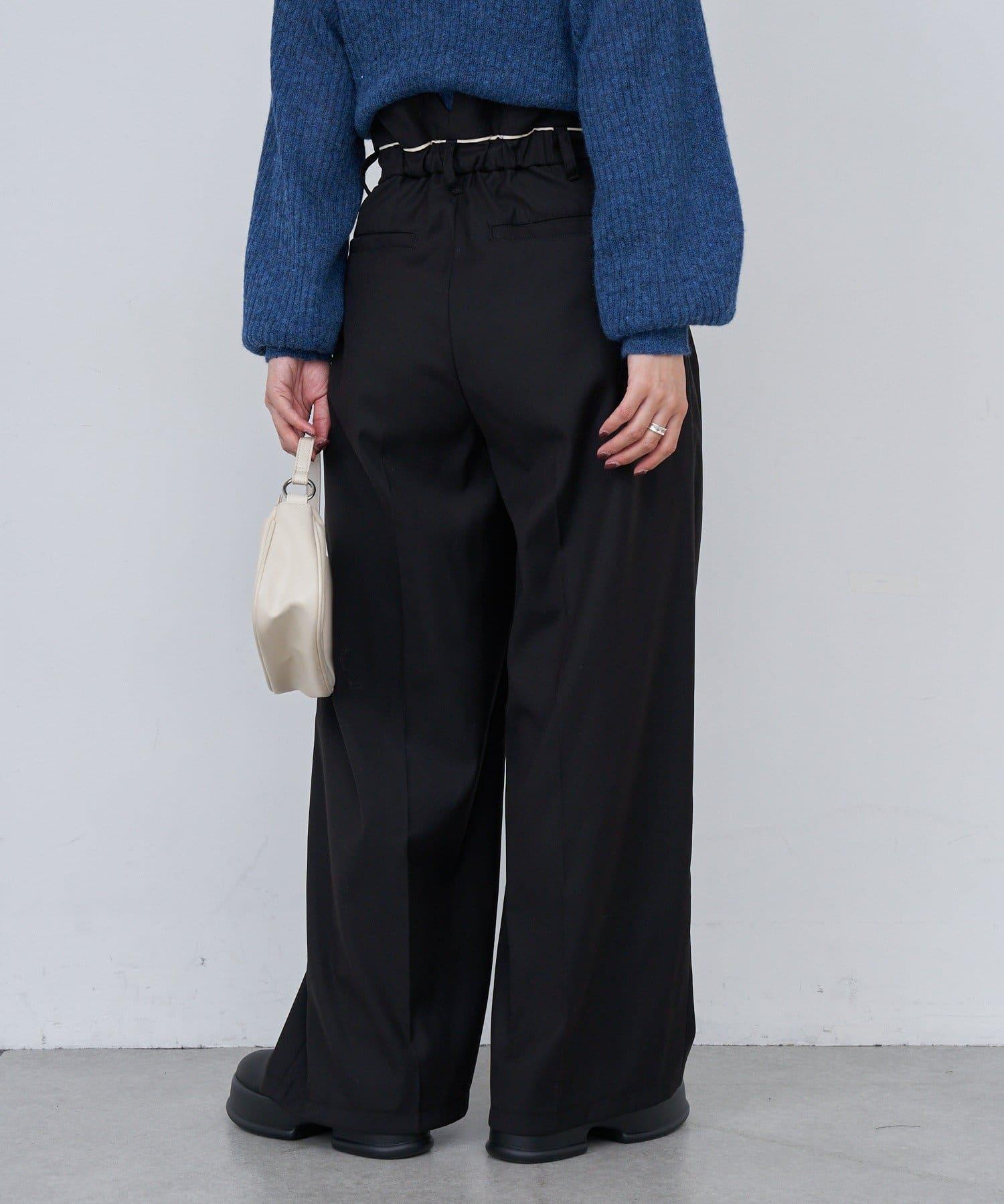 這款高腰長褲的腰部採用滾邊設計。