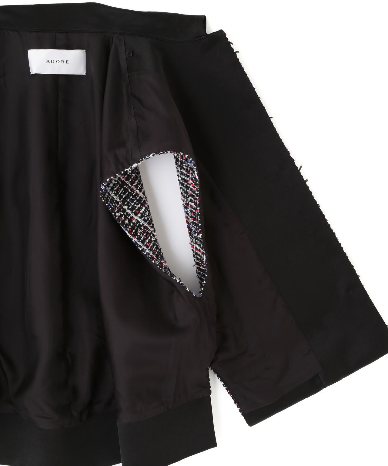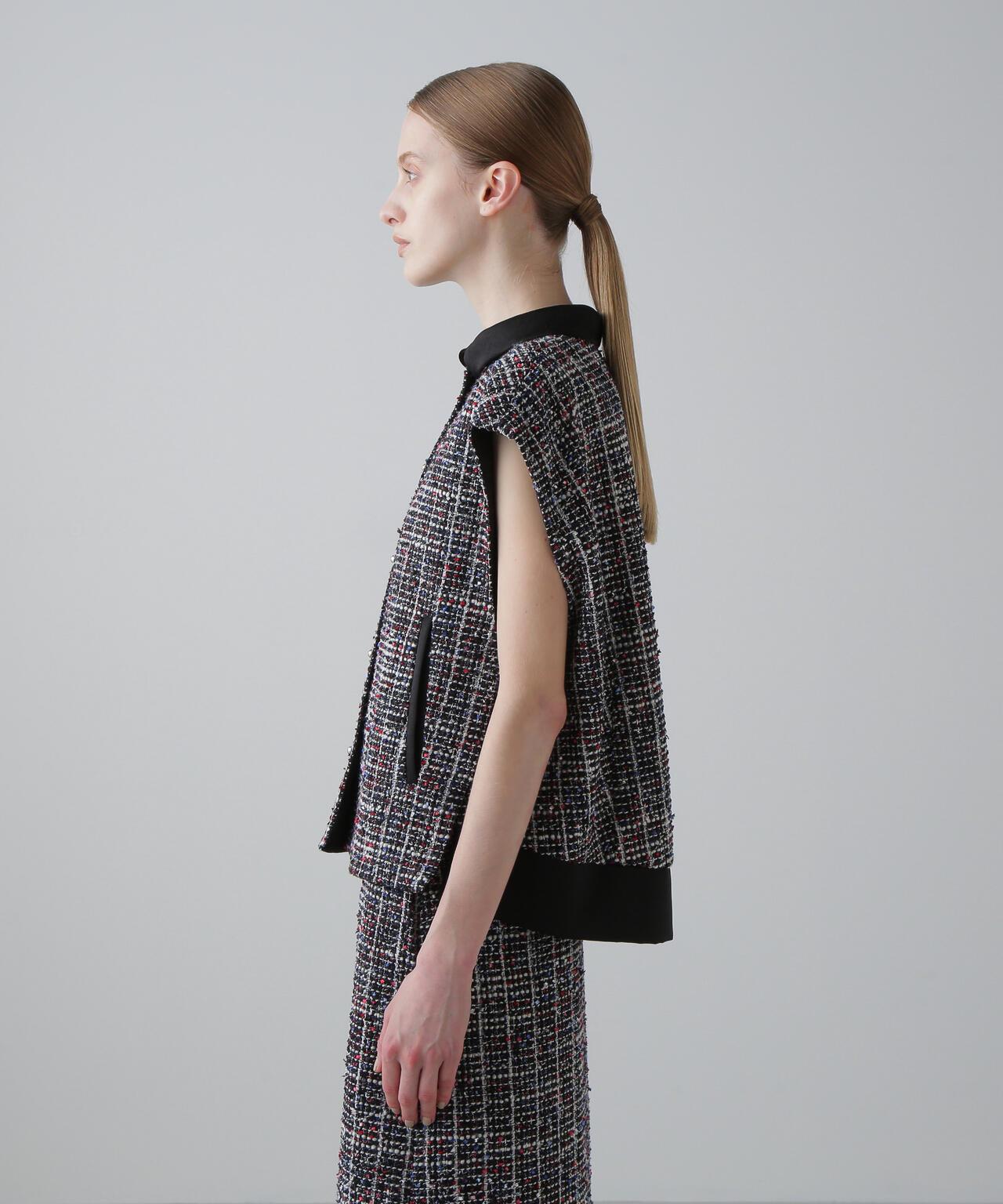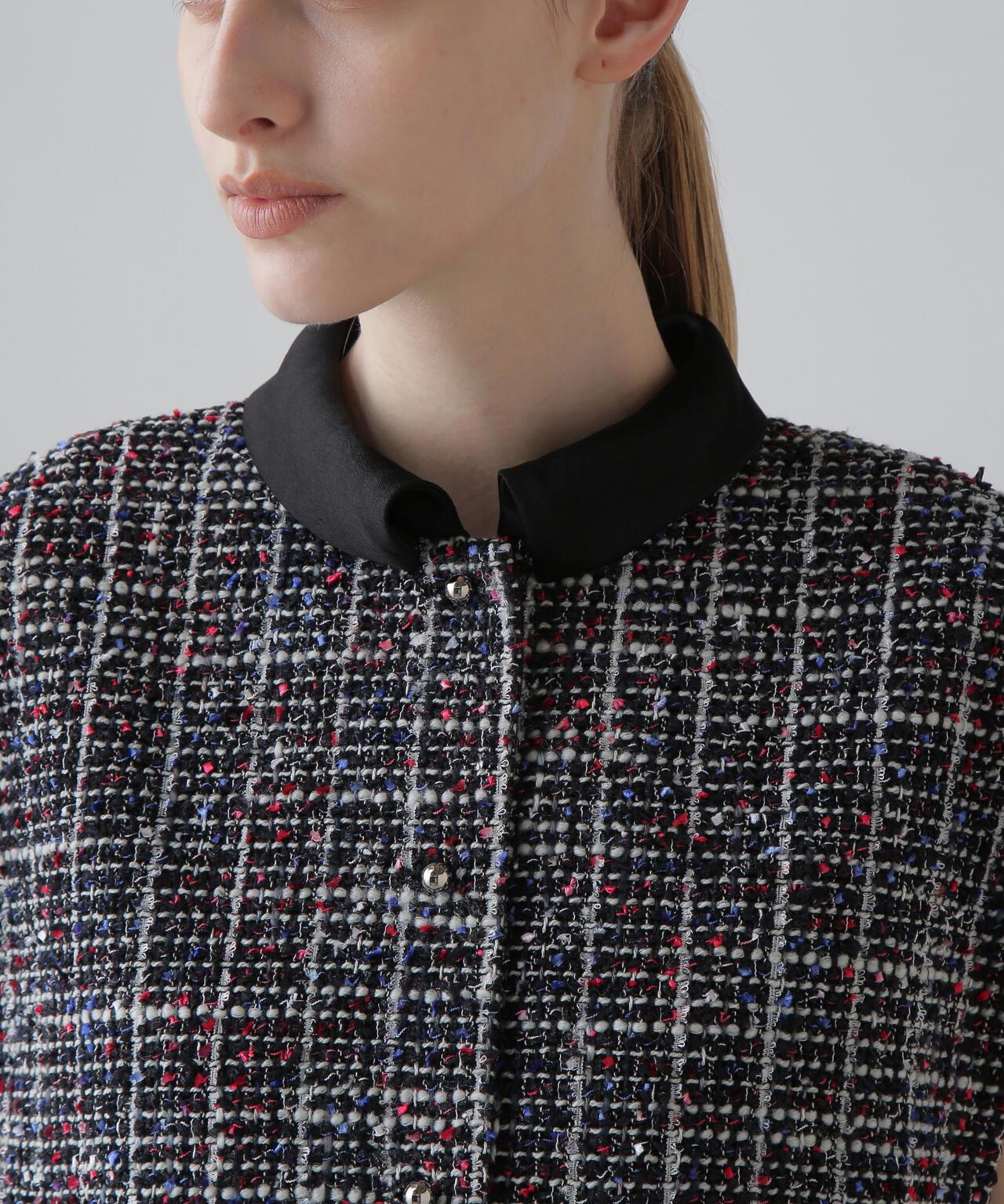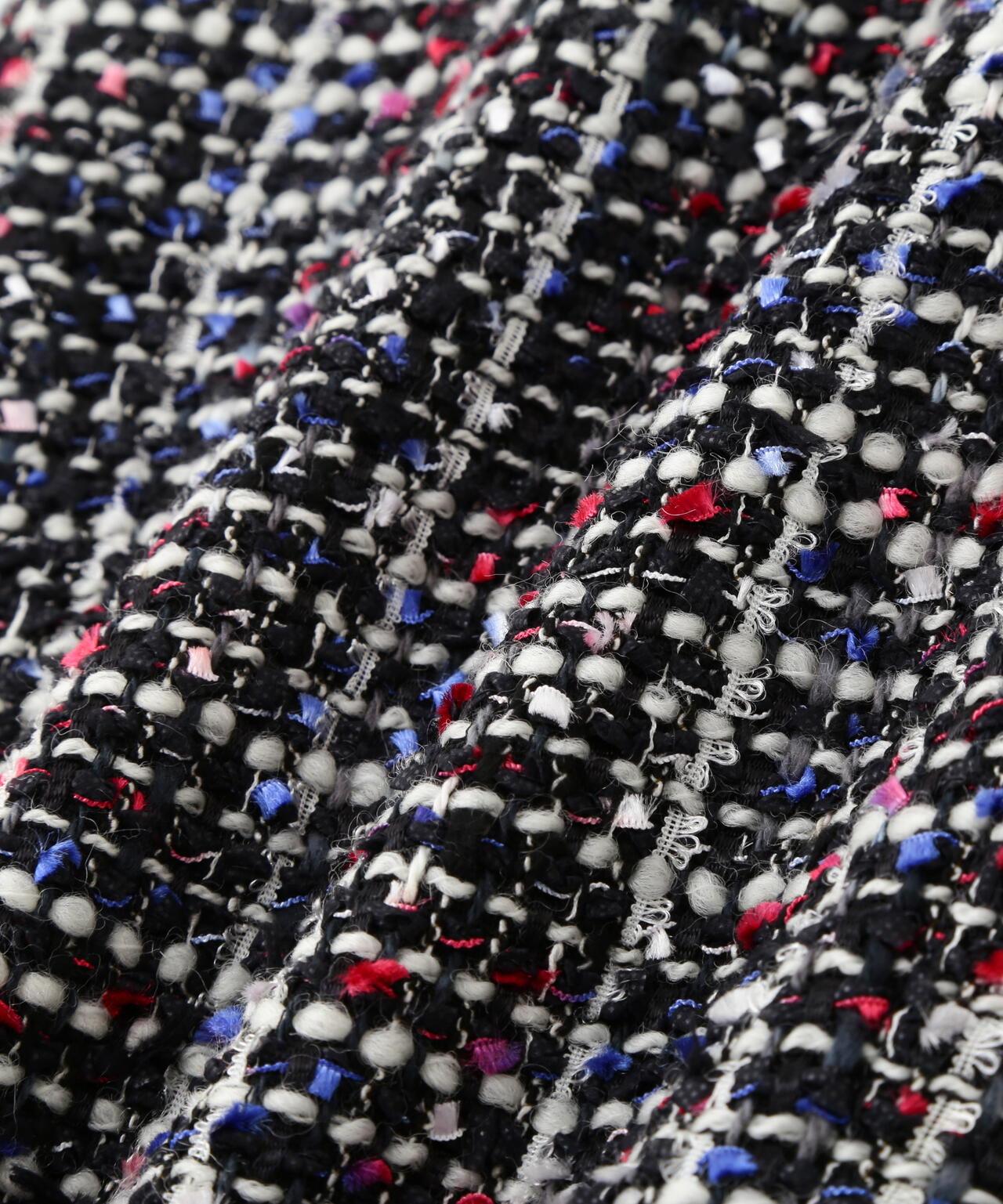 三色花式斜紋軟呢外套寬鬆剪裁的花式斜紋軟呢外套。衣領和後襬採用綢緞製成。衣領沿頸部呈柔和的圓形。可與同款裙裝(貨號:531-5220812)搭配穿著,採用 "kasuri dyeing "染色技術,將一根紗線染成紅、藍、白三種不同的顏色。採用表面富有表現力的斜紋軟呢面料製成。
