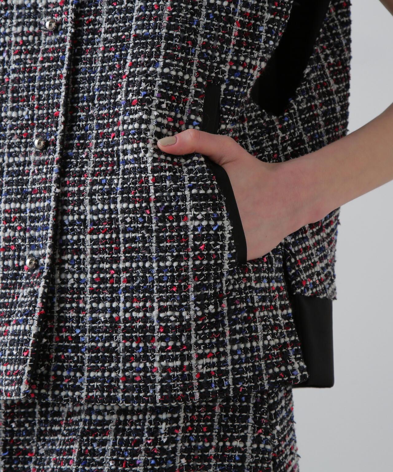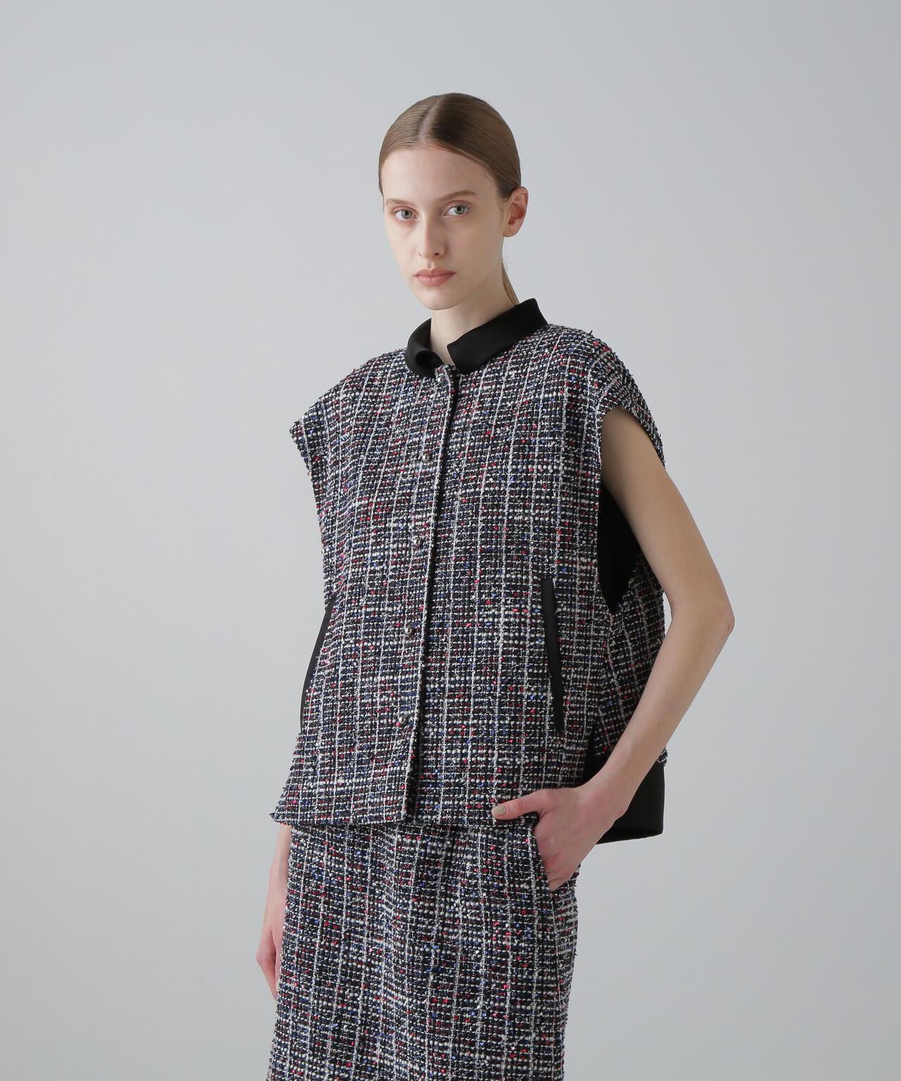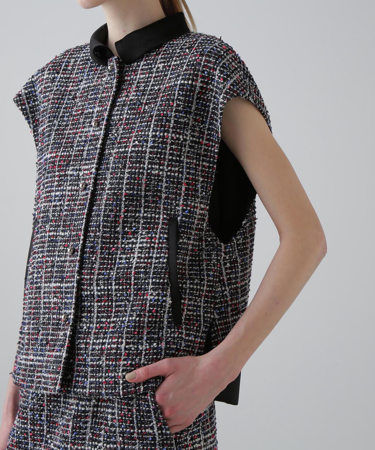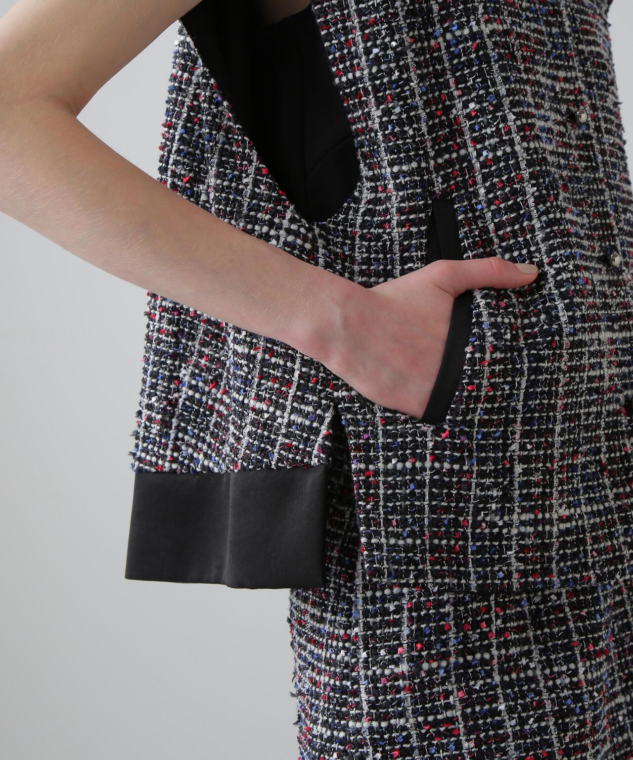 三色花式斜紋軟呢外套寬鬆剪裁的花式斜紋軟呢外套。衣領和後襬採用綢緞製成。衣領沿頸部呈柔和的圓形。可與同款裙裝(貨號:531-5220812)搭配穿著,採用 "kasuri dyeing "染色技術,將一根紗線染成紅、藍、白三種不同的顏色。採用表面富有表現力的斜紋軟呢面料製成。