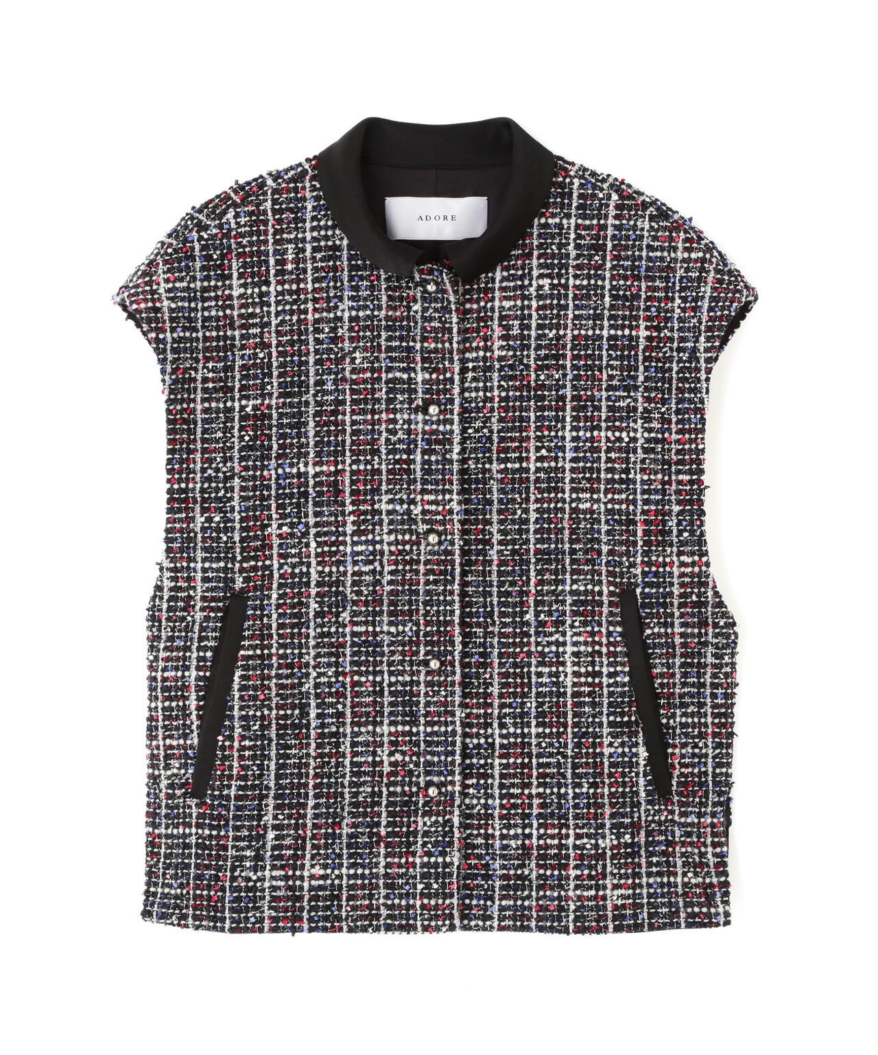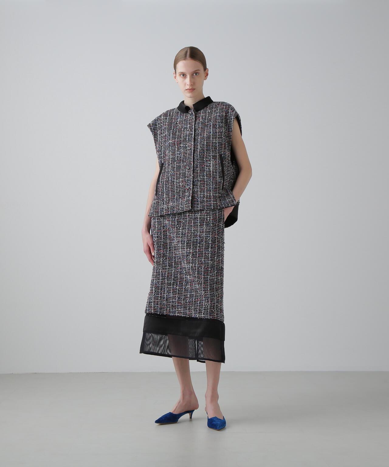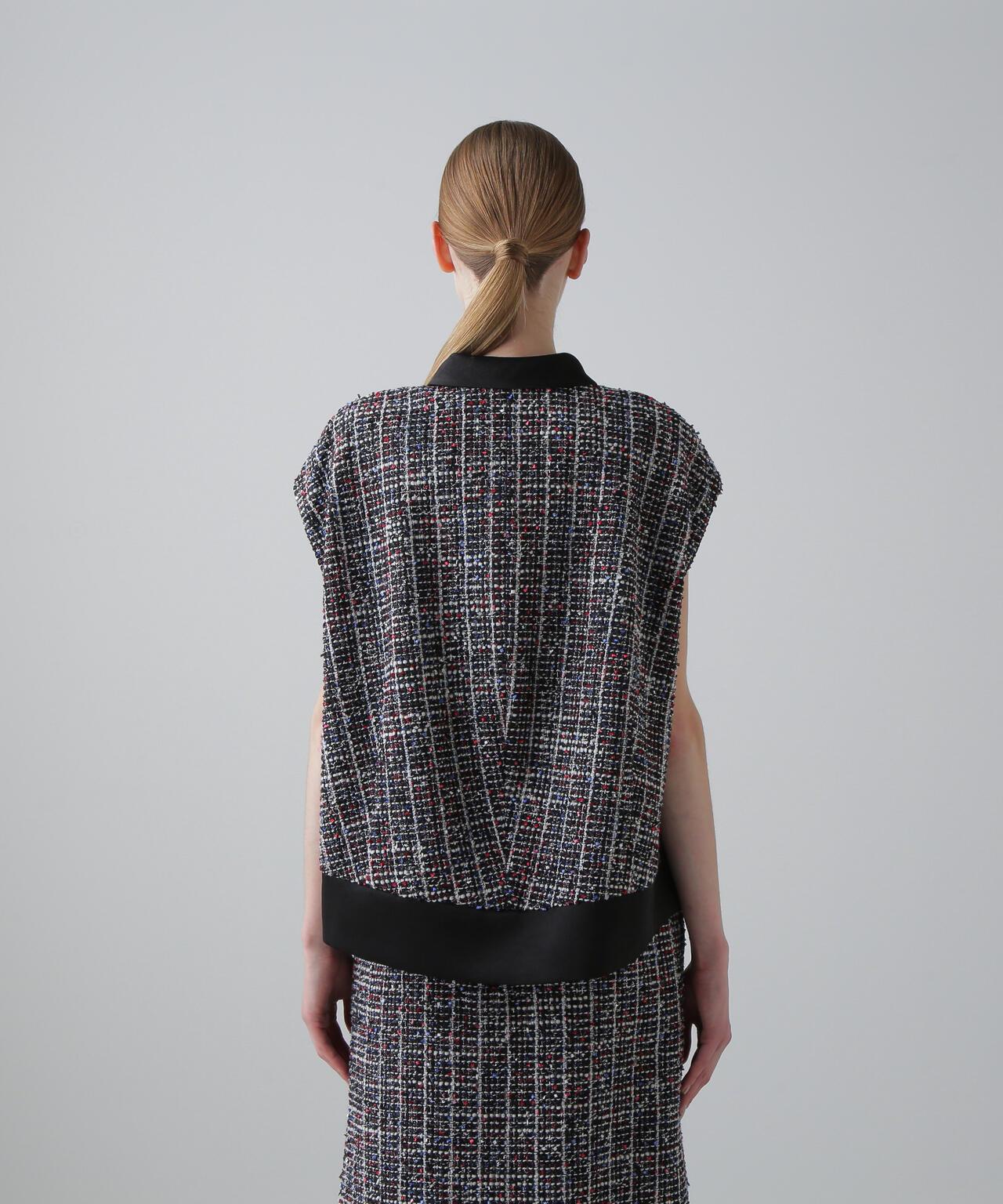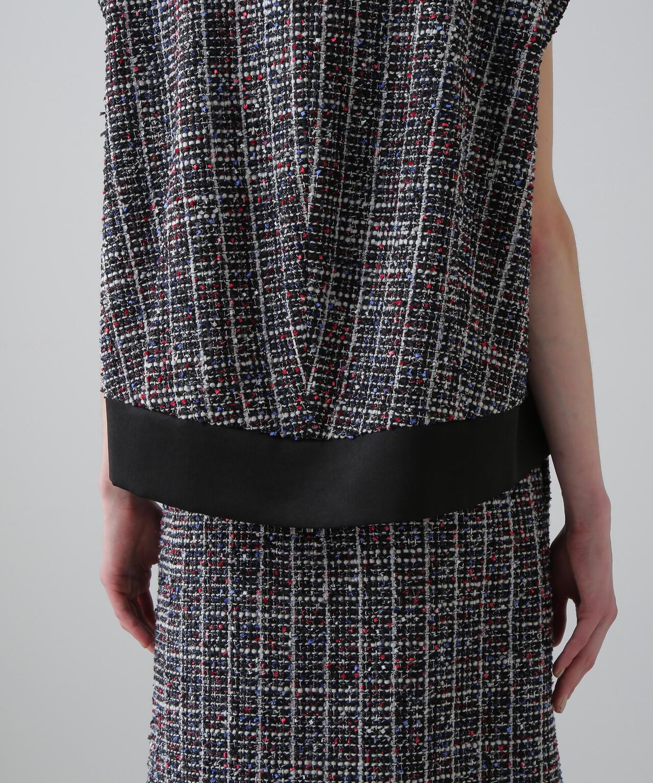 三色花式斜紋軟呢外套寬鬆剪裁的花式斜紋軟呢外套。衣領和後襬採用綢緞製成。衣領沿頸部呈柔和的圓形。可與同款裙裝(貨號:531-5220812)搭配穿著,採用 "kasuri dyeing "染色技術,將一根紗線染成紅、藍、白三種不同的顏色。採用表面富有表現力的斜紋軟呢面料製成。