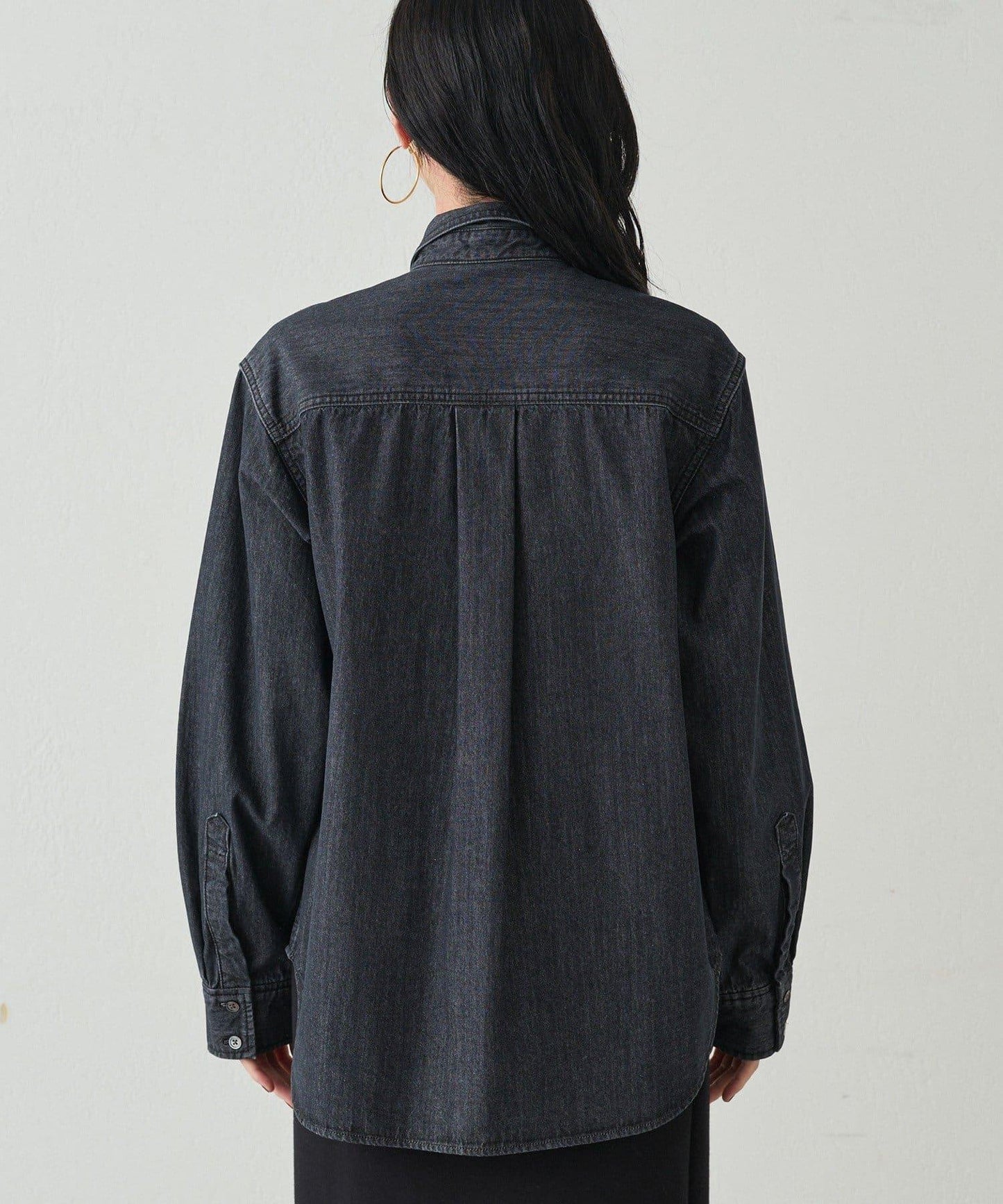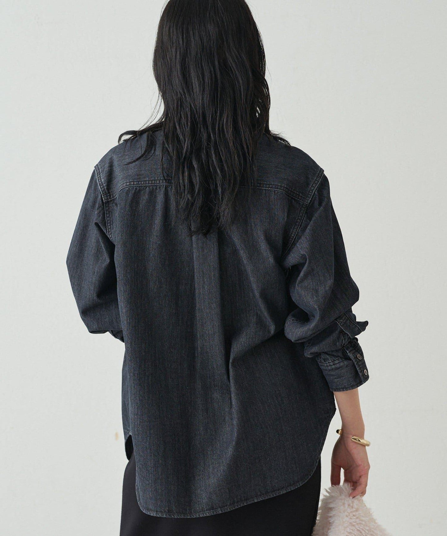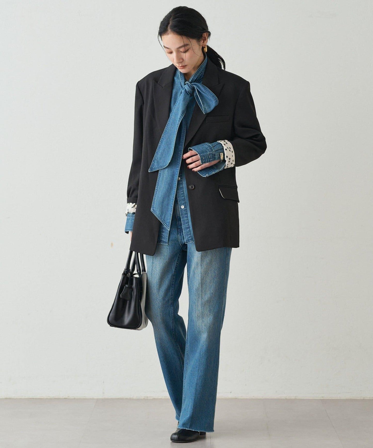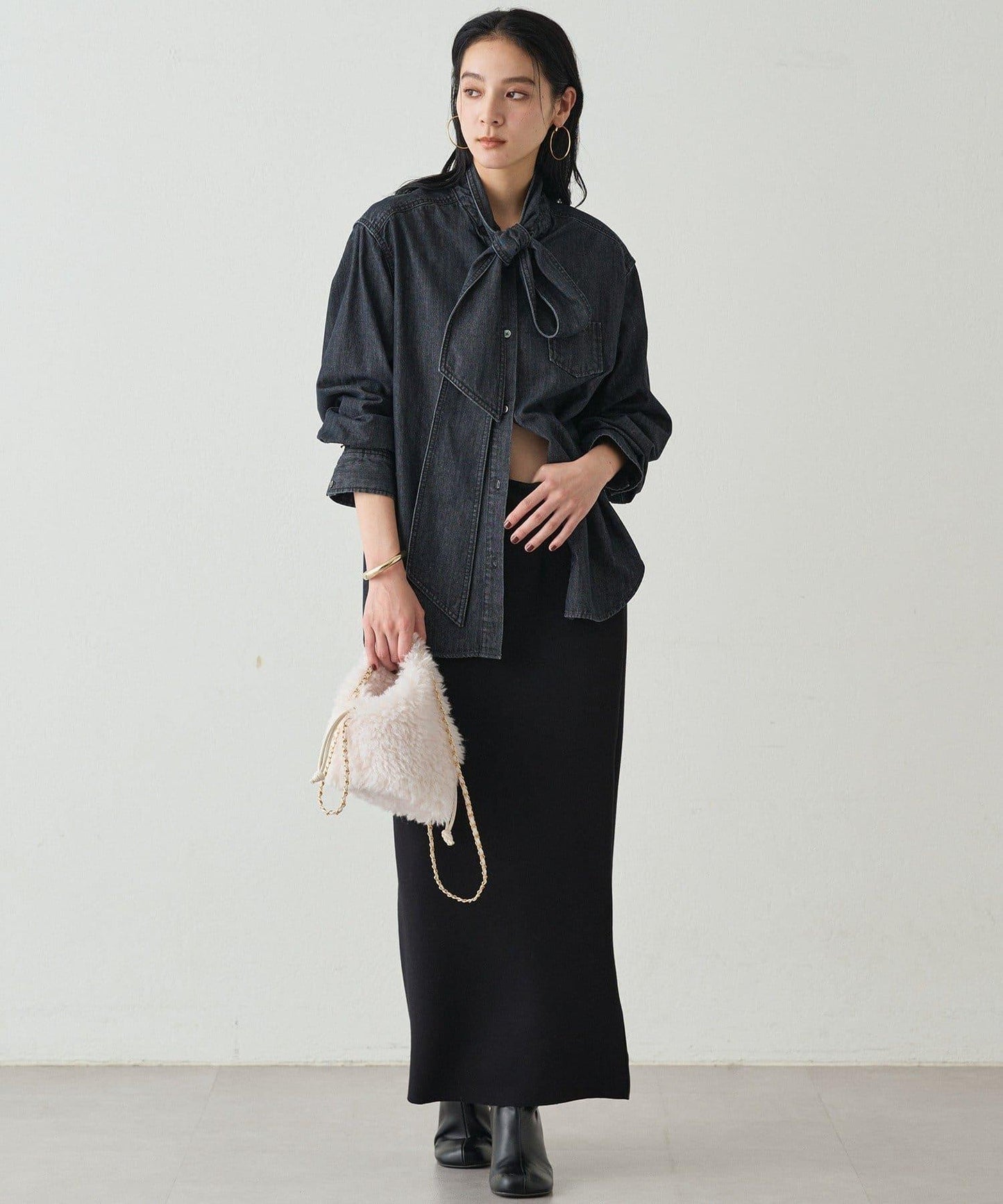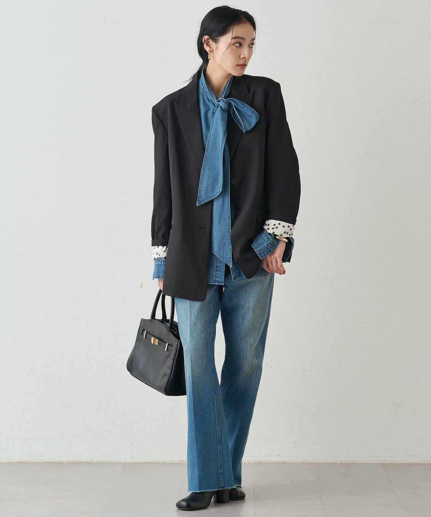 成熟俏皮的黑色牛仔領結襯衫。