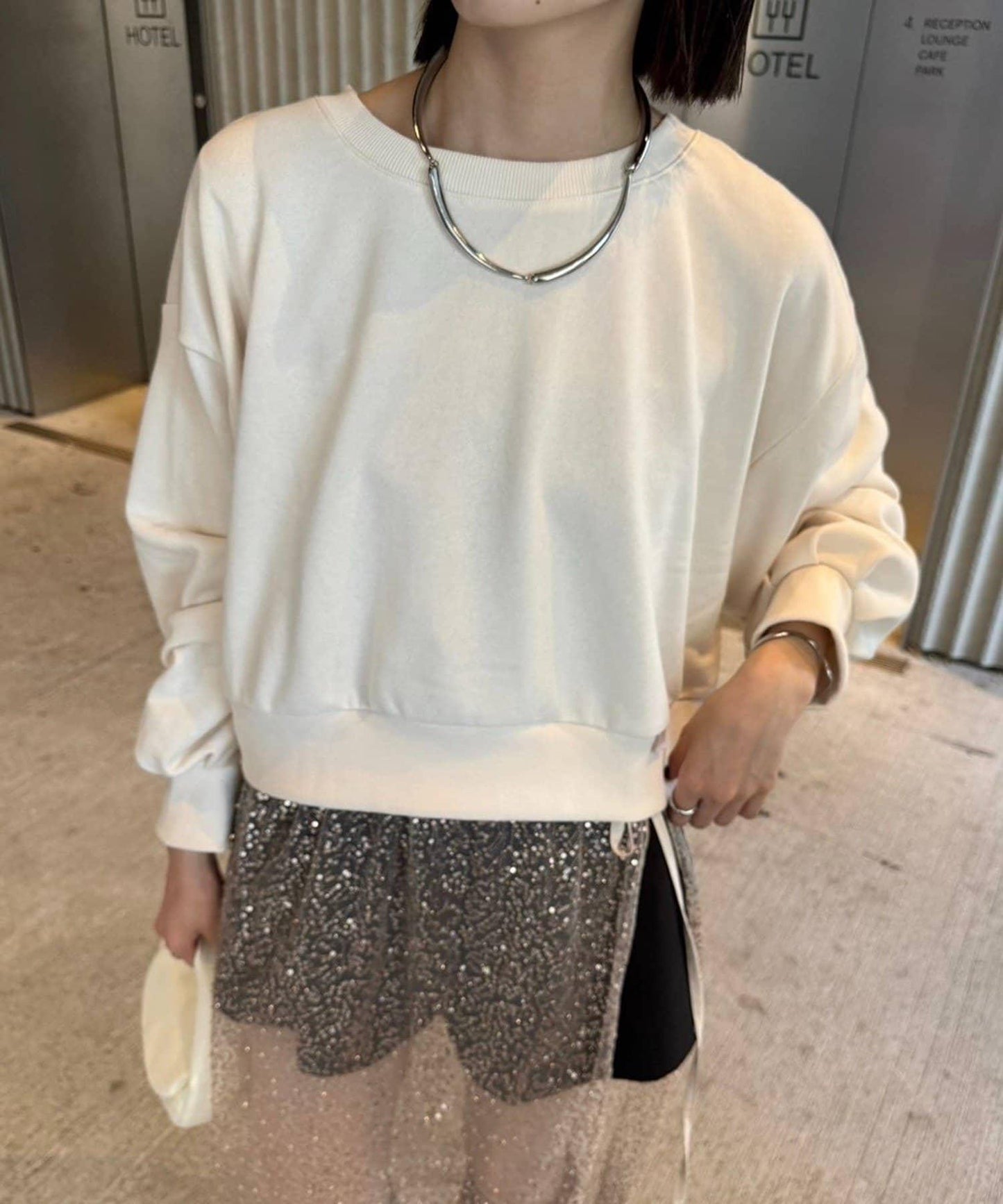 這件上衣也可單肩穿著,肩部向下。