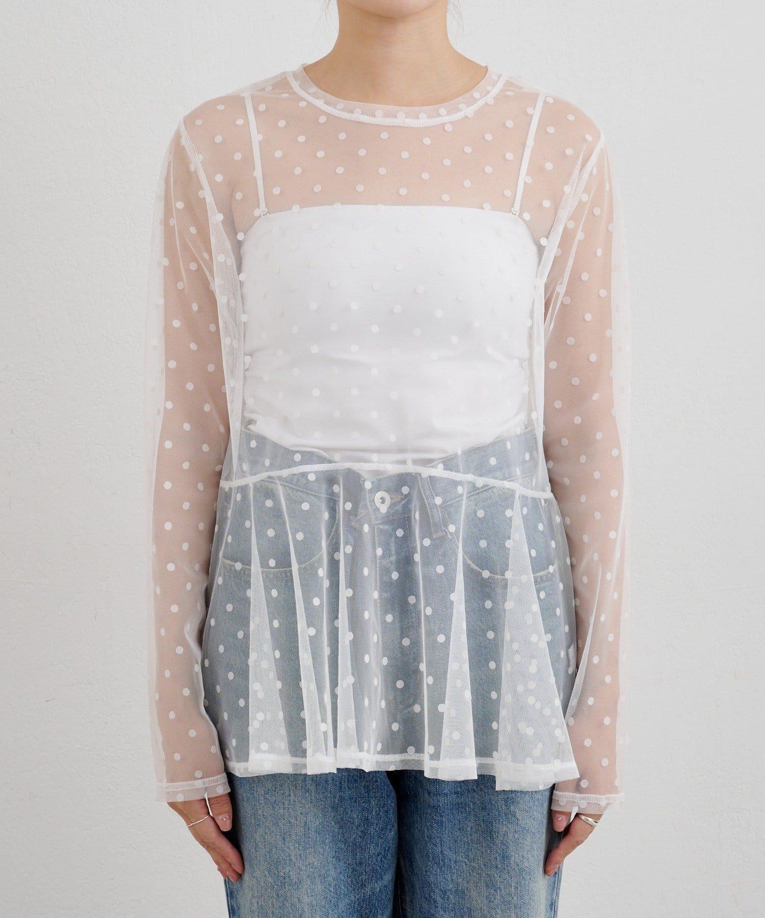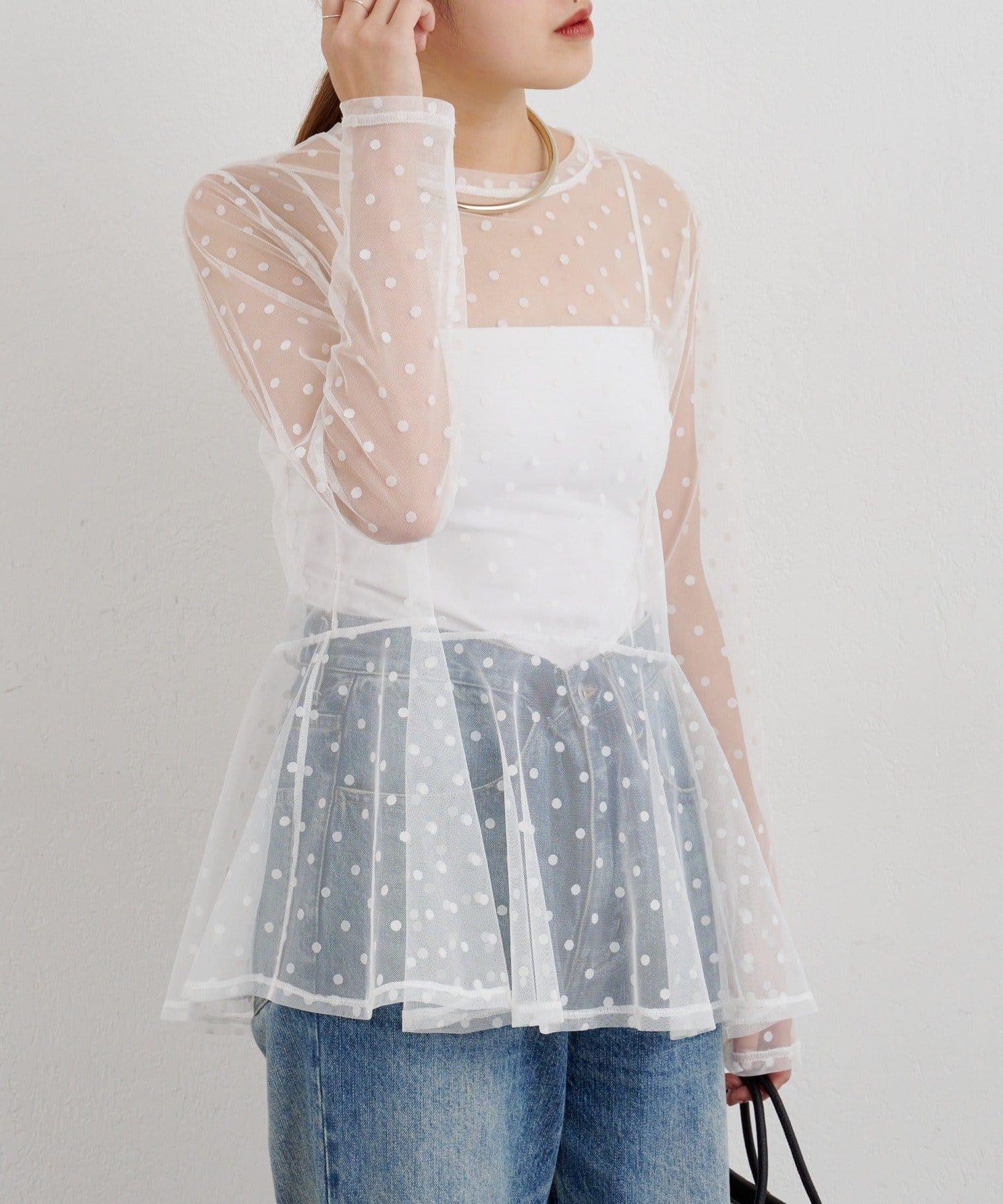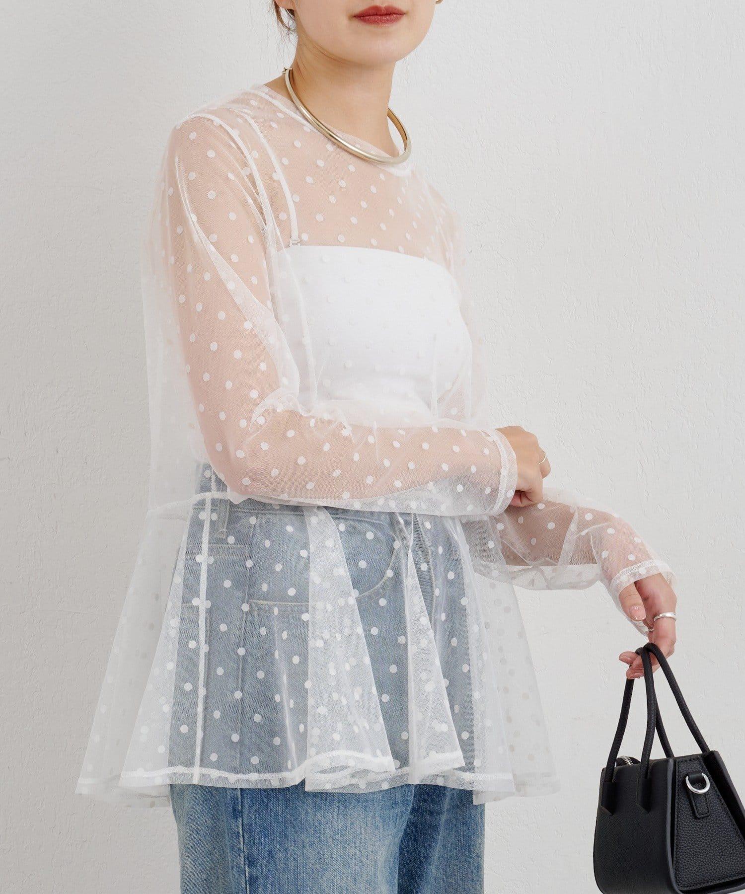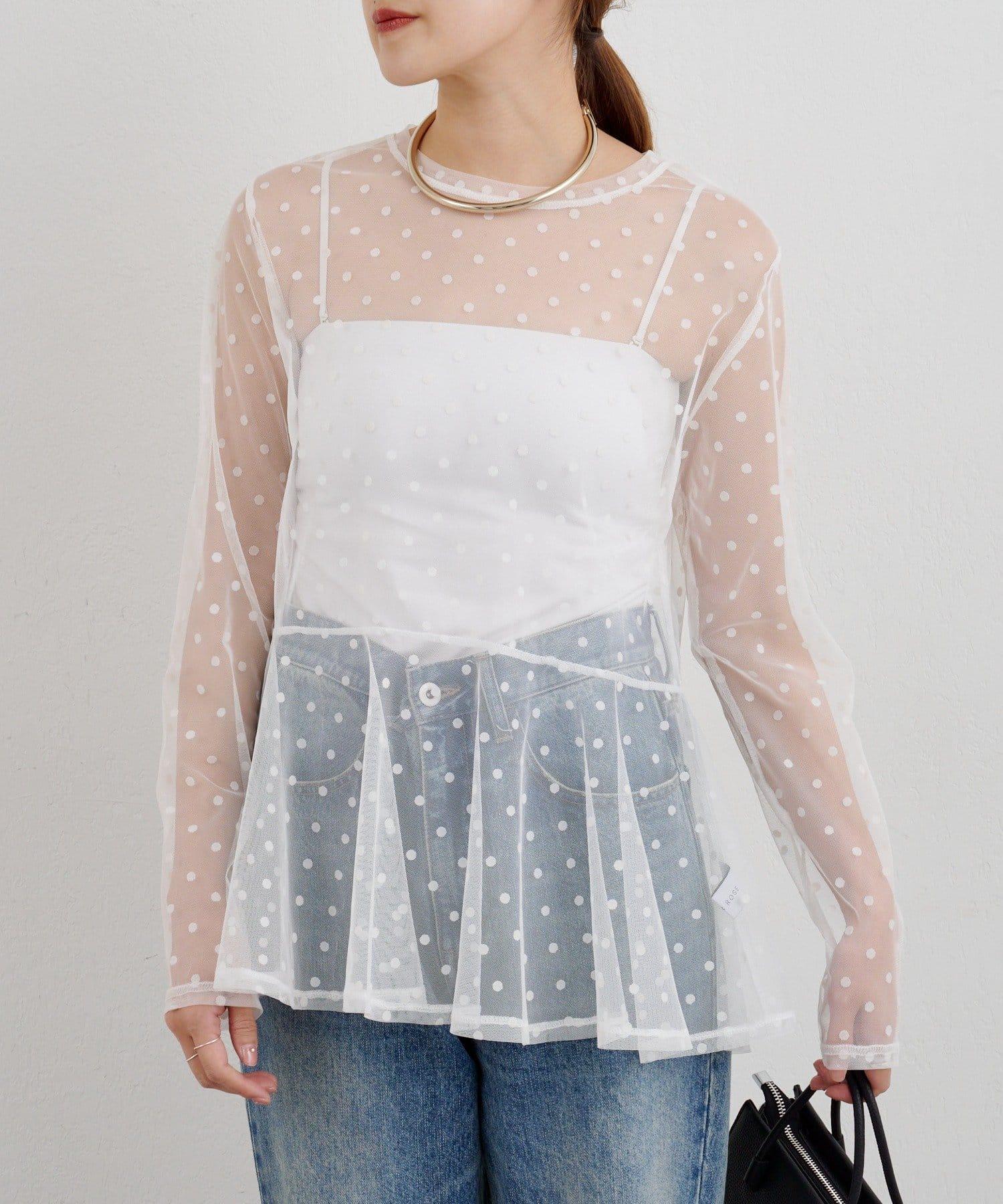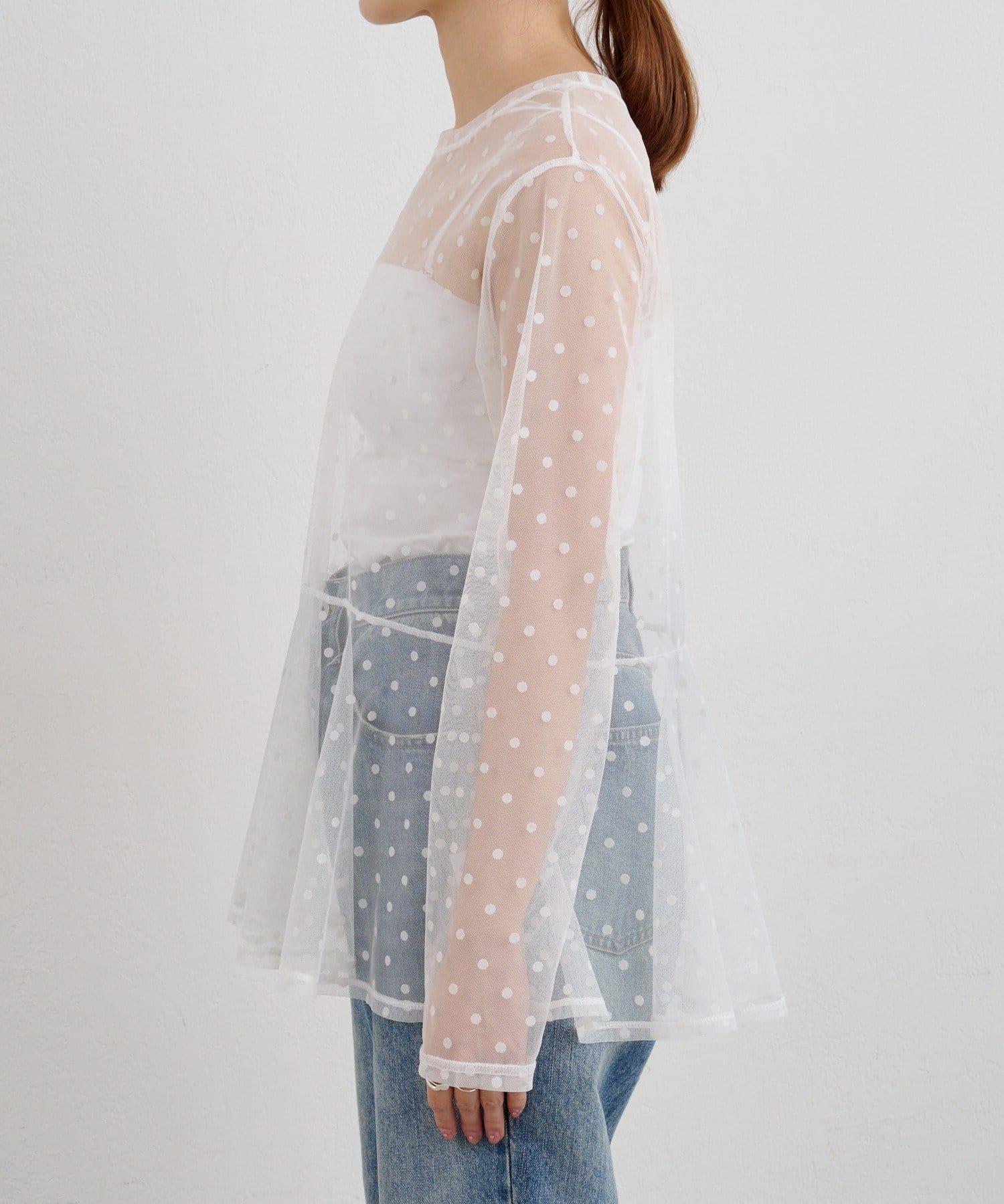 透視薄紗材質的上衣,配以植絨圓點印花。