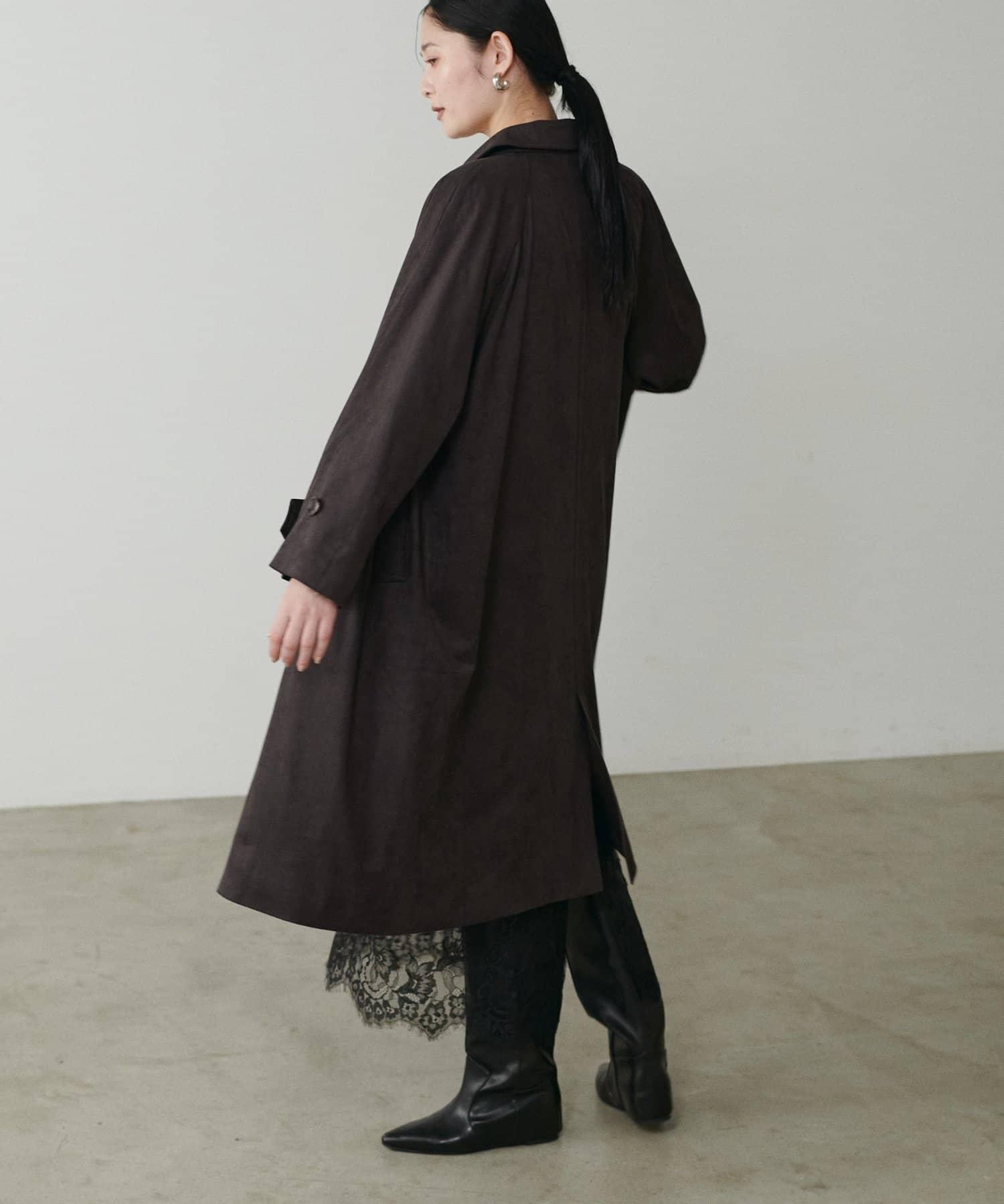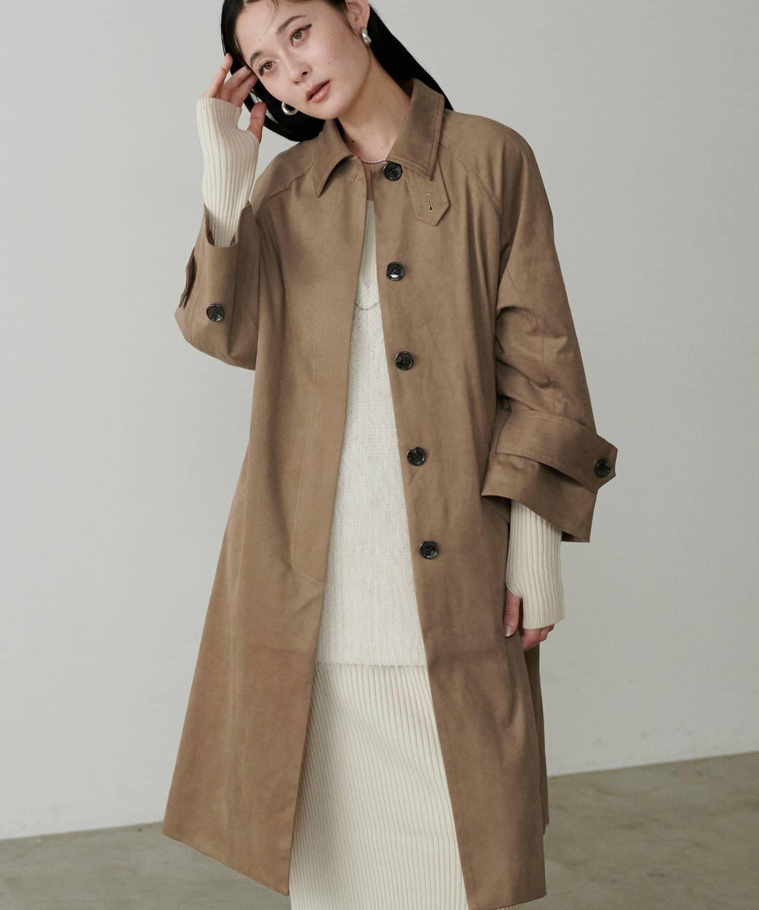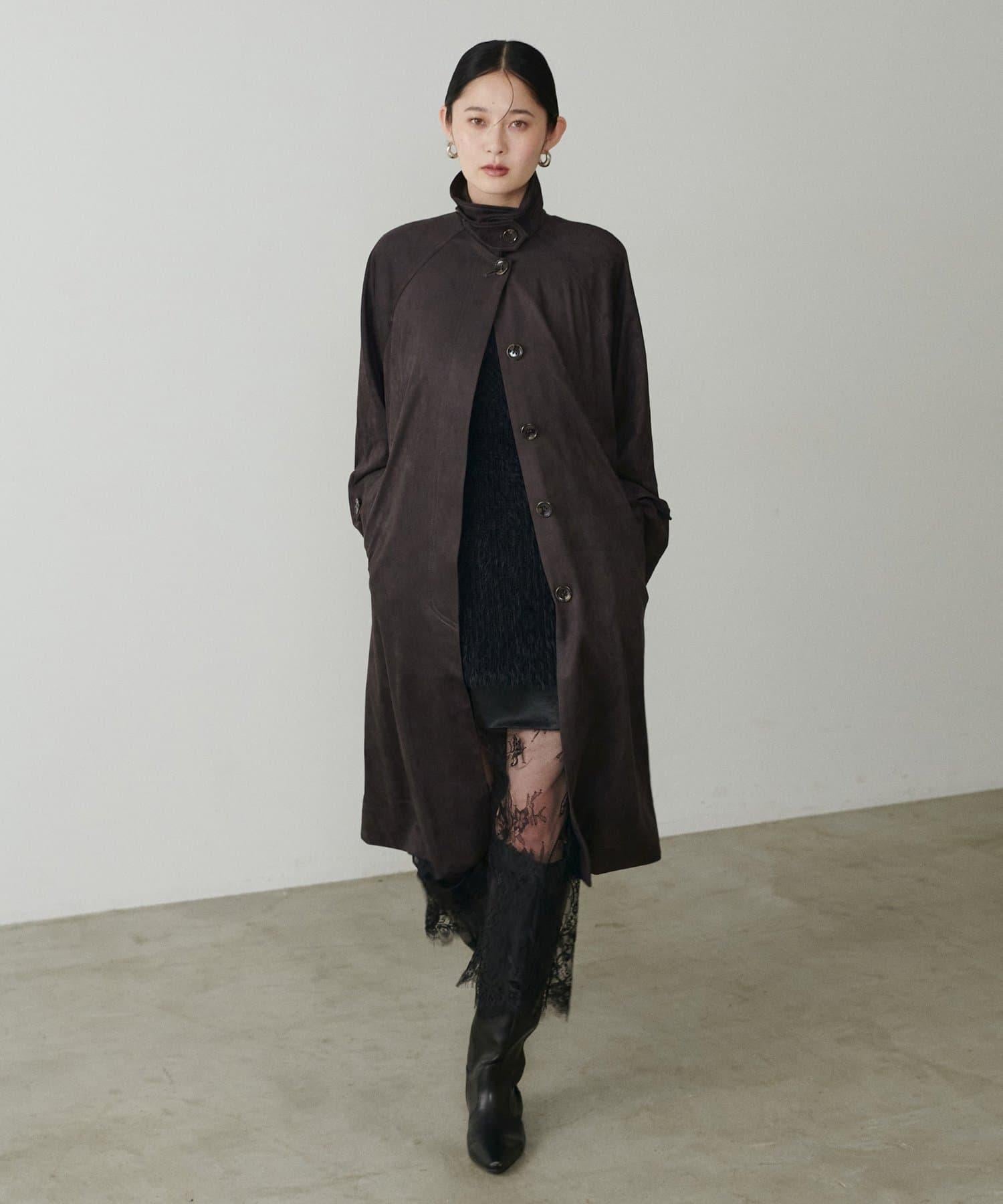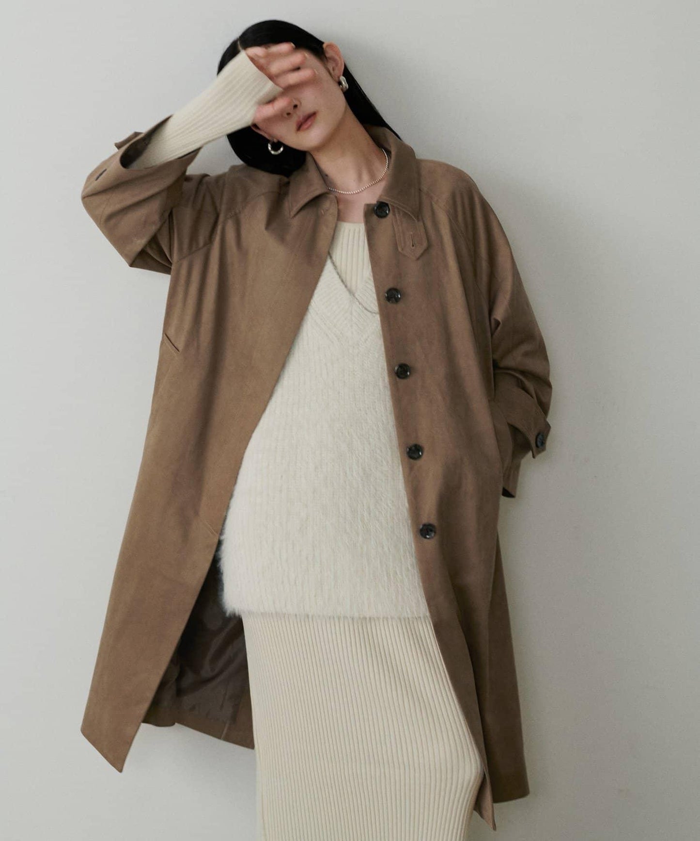 麂皮絨啞光質感的長款大衣,提升了秋冬季的協調性。