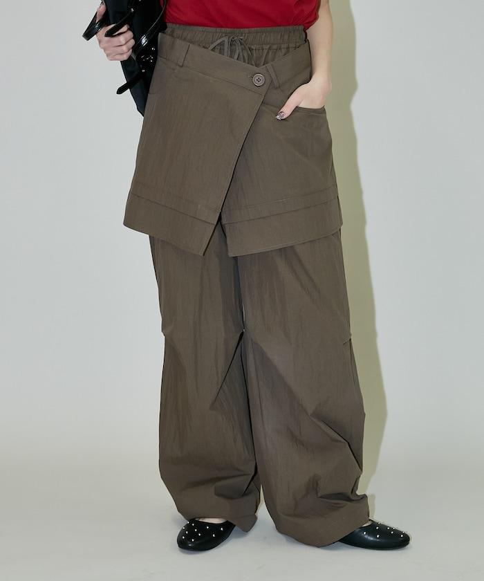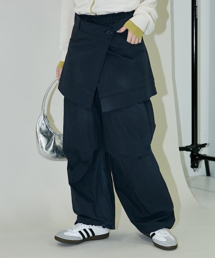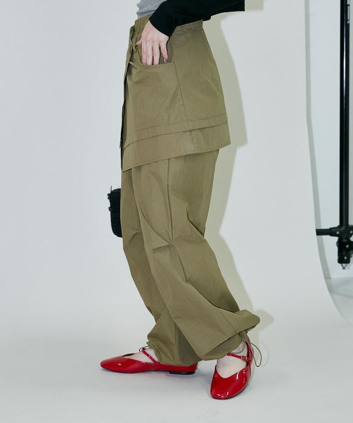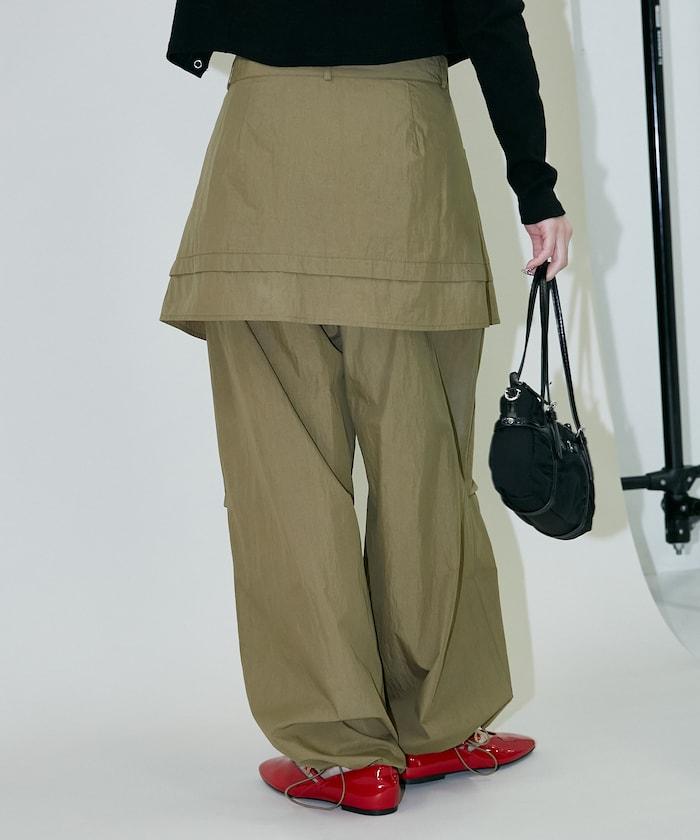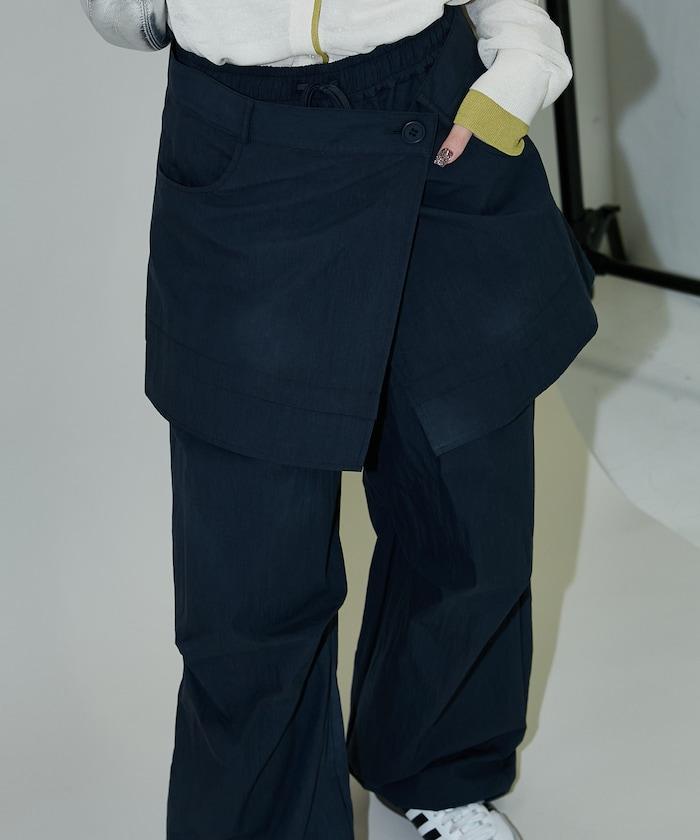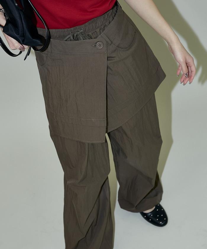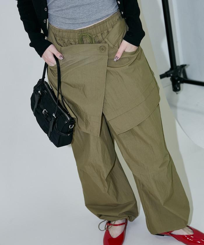尼龍簡易長褲搭配裹身裙,層疊設計與眾不同。