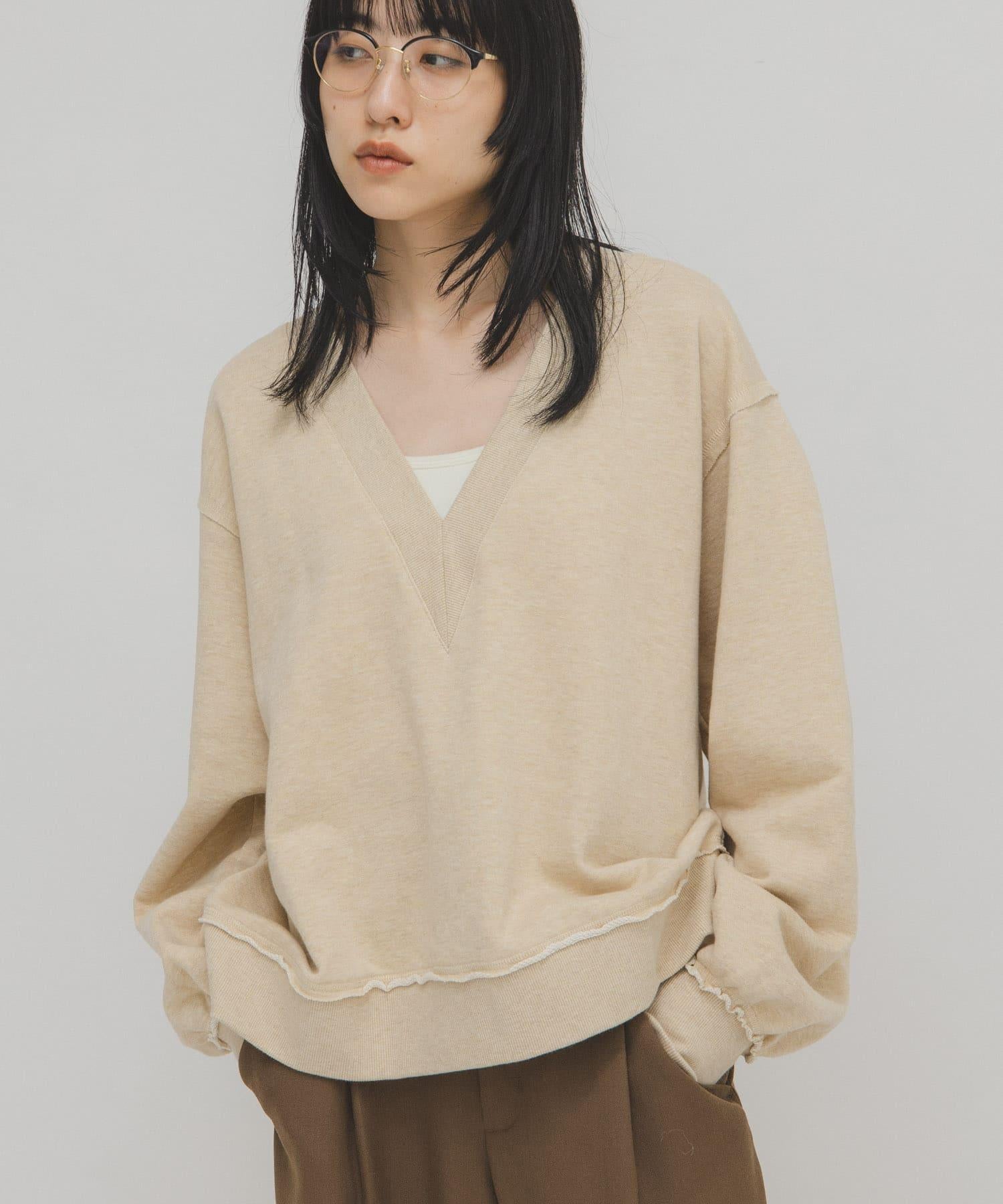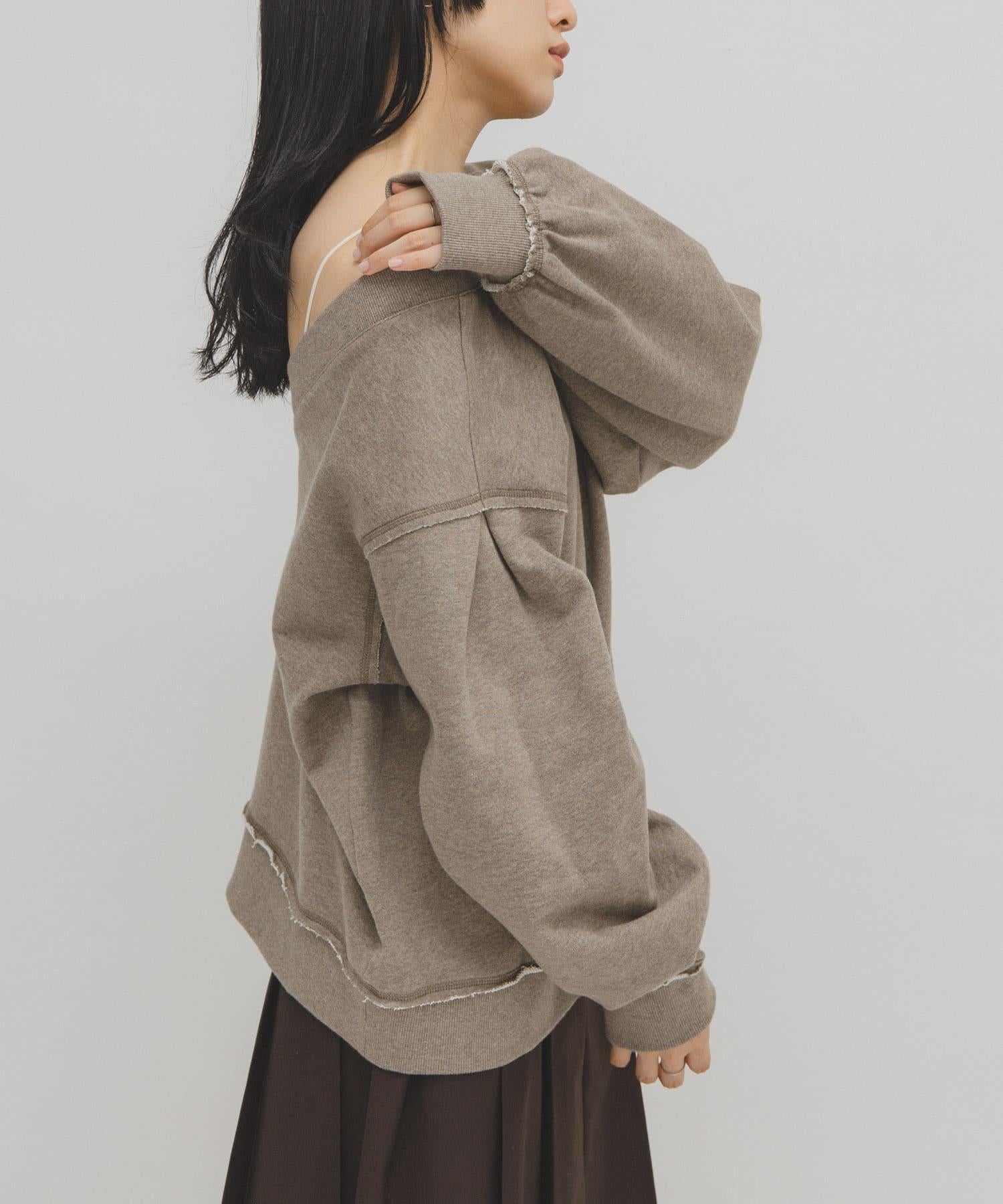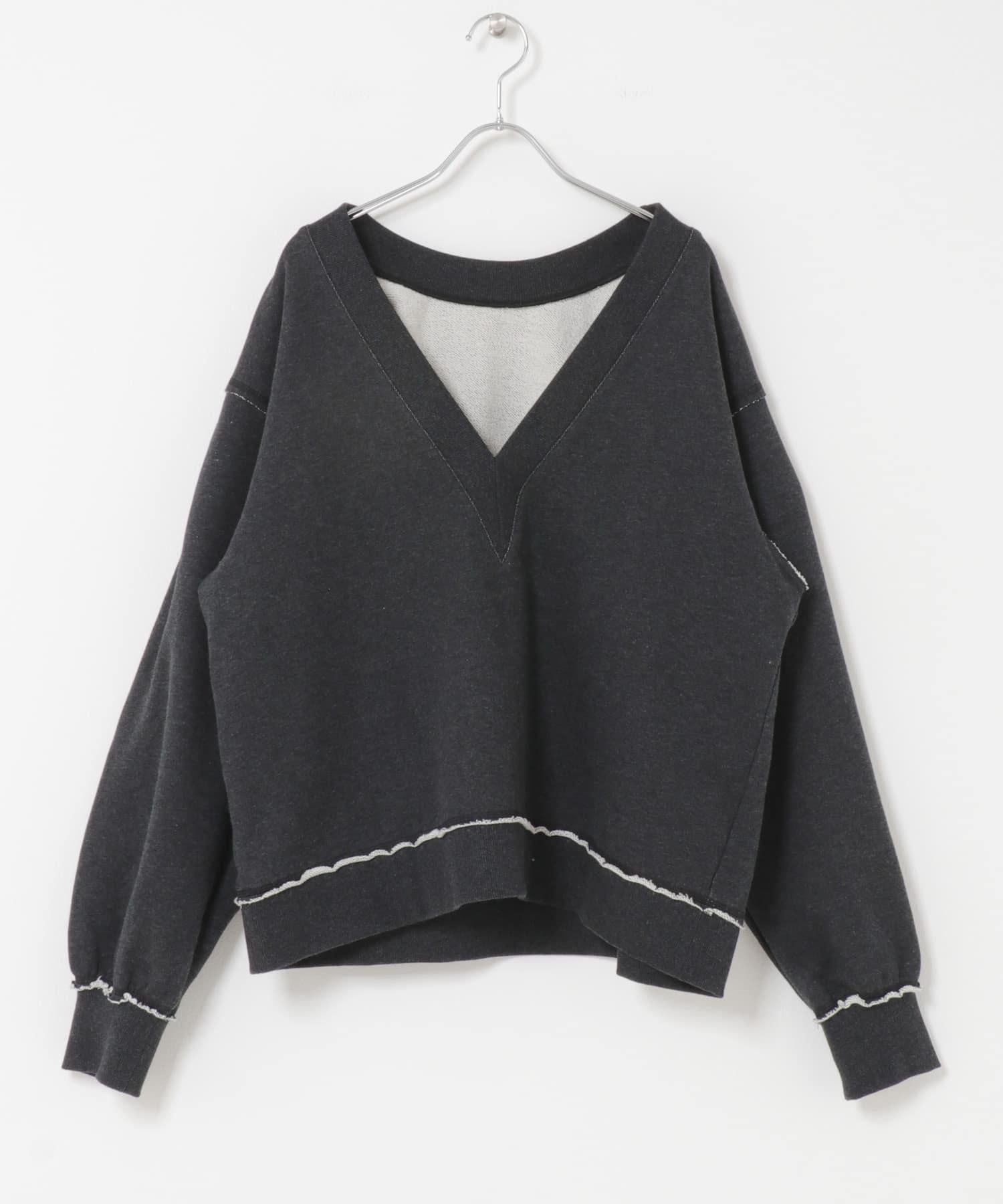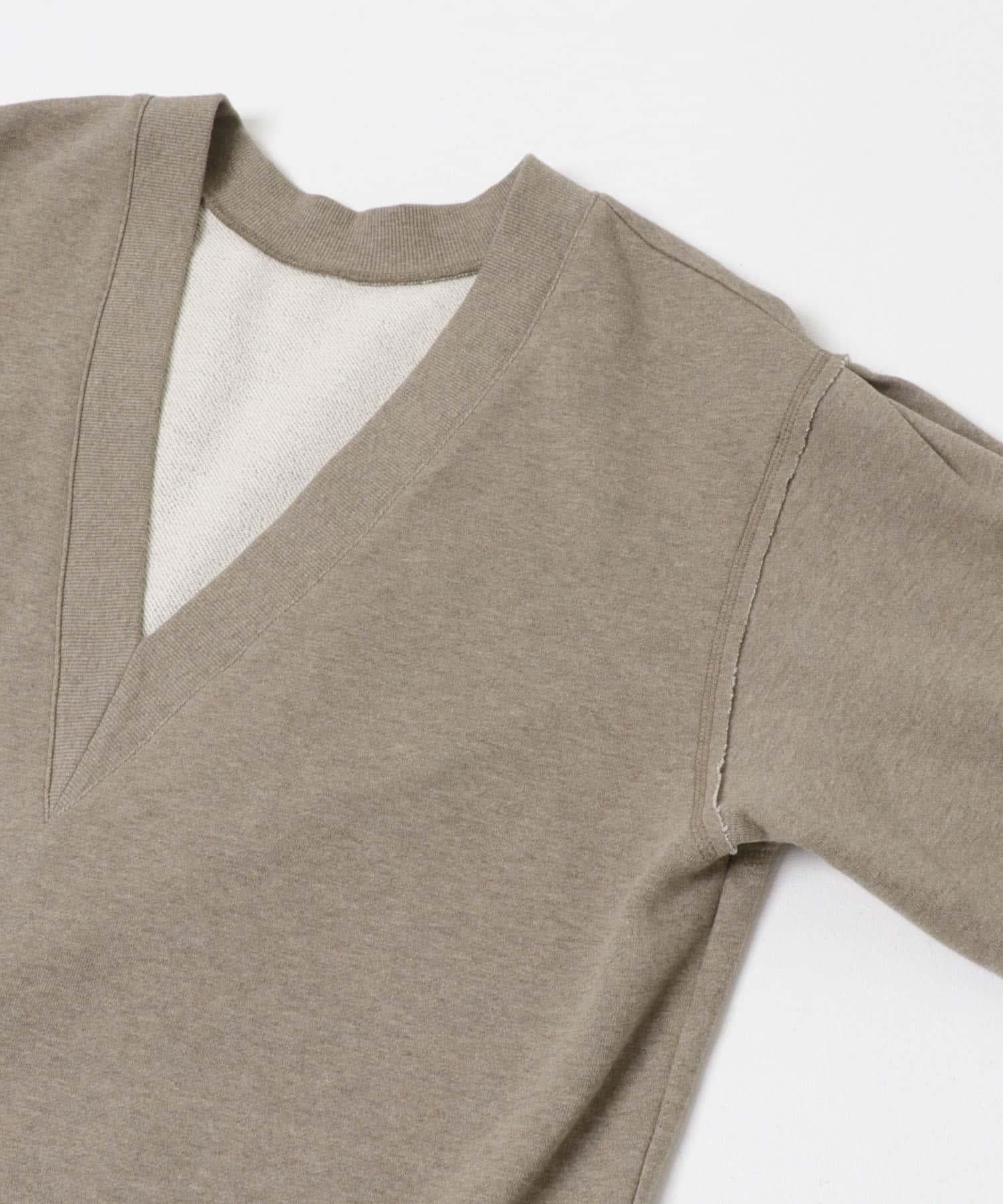 這款運動衫採用細緻的木質面料,前後均可雙面穿著。前幅的 V 領設計讓領口線條更簡潔、寬鬆,而寬鬆的尺寸則給人更輕鬆的感覺。也可作為圓領穿著。袖子和下襬的剪裁規格也是一大看點。如果內搭一件背心,則會有一種略帶模式化和女性化的感覺。