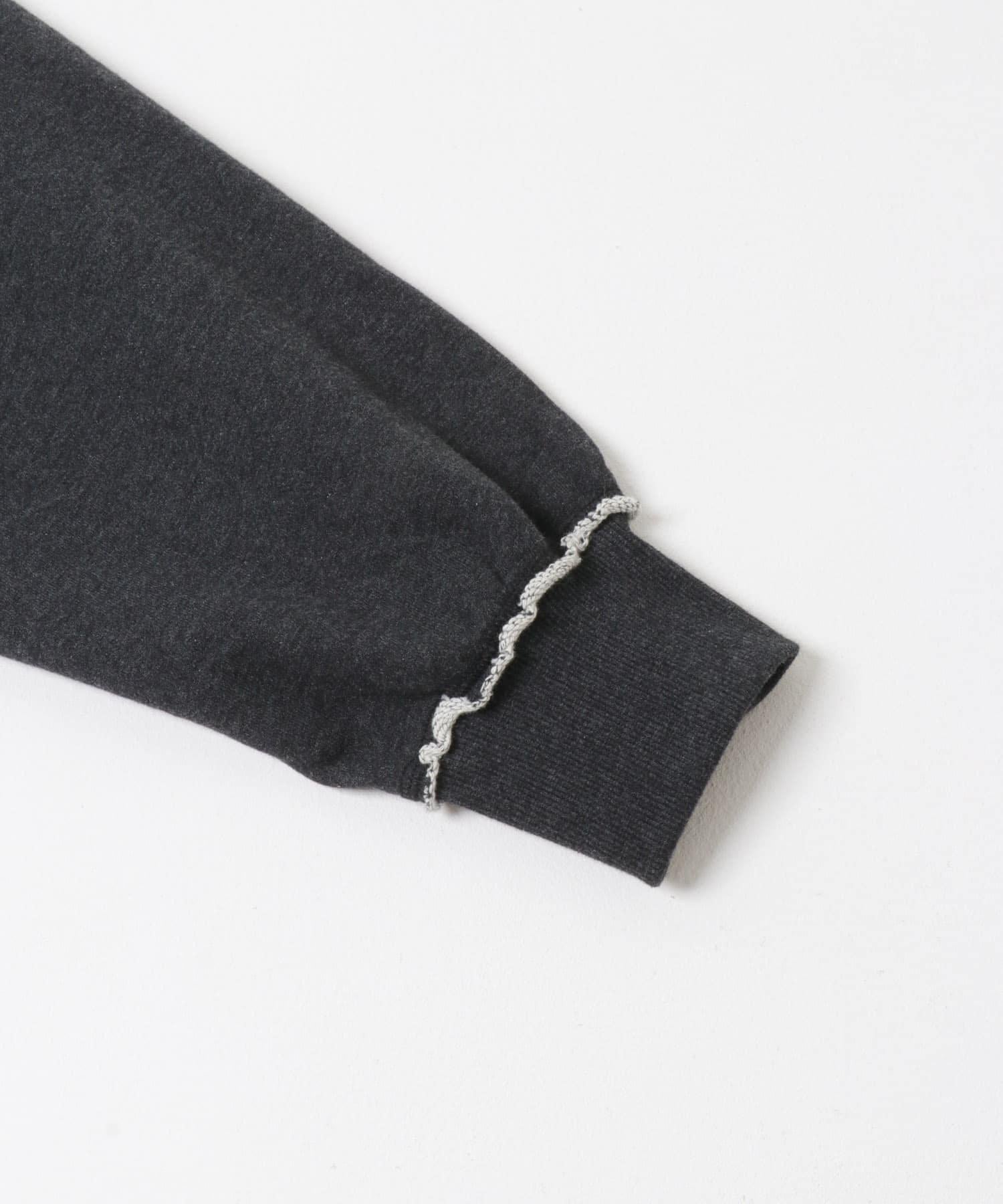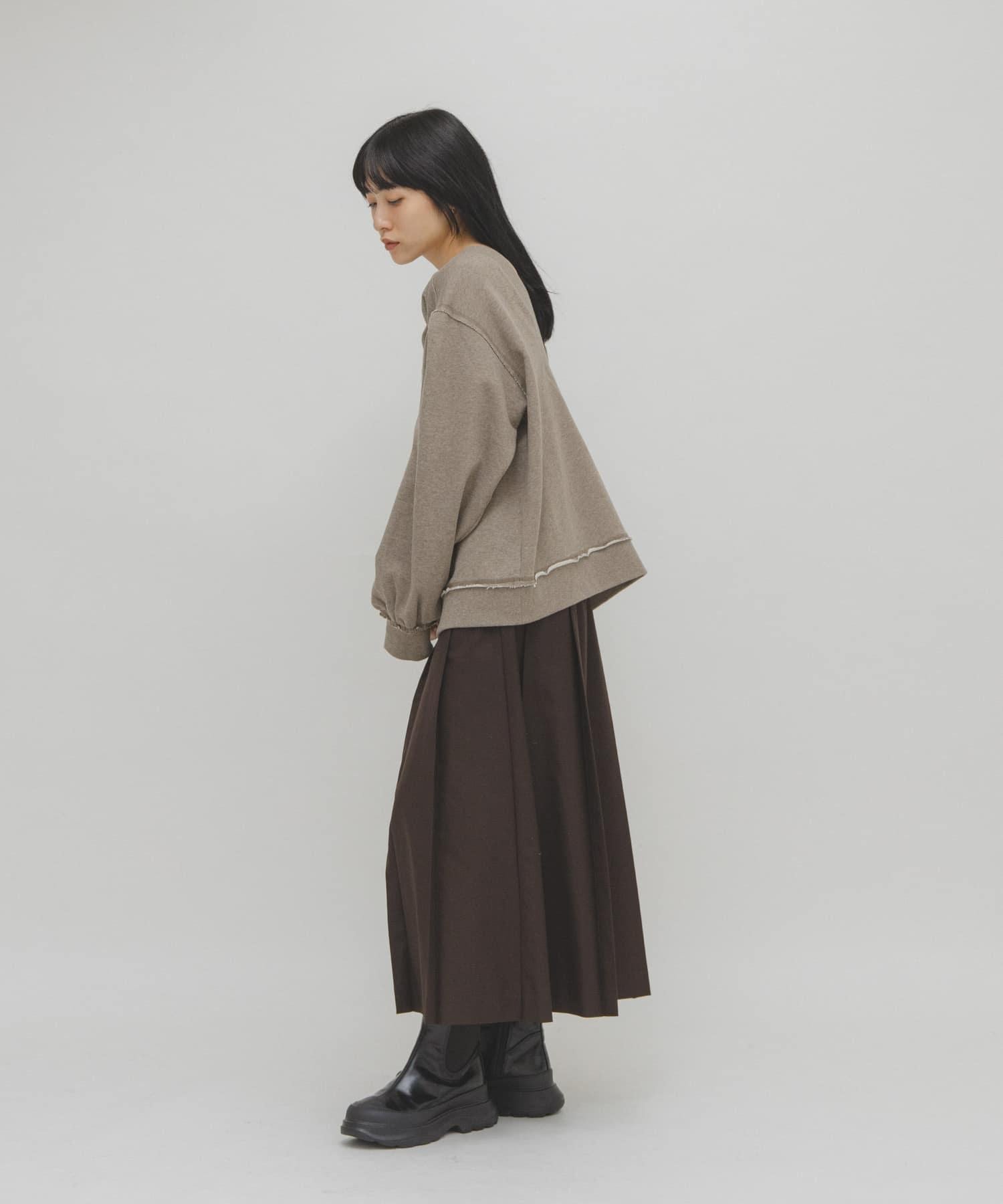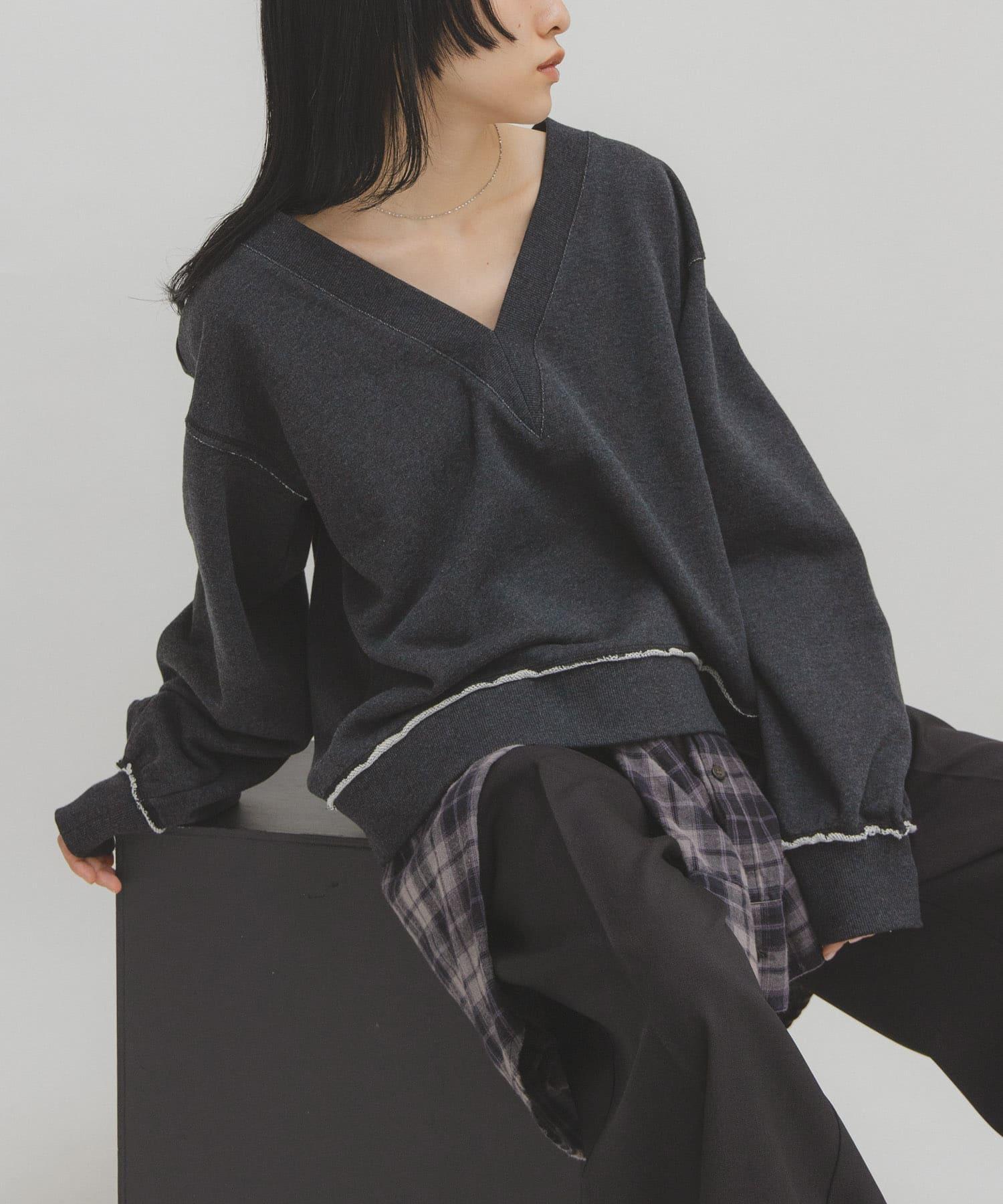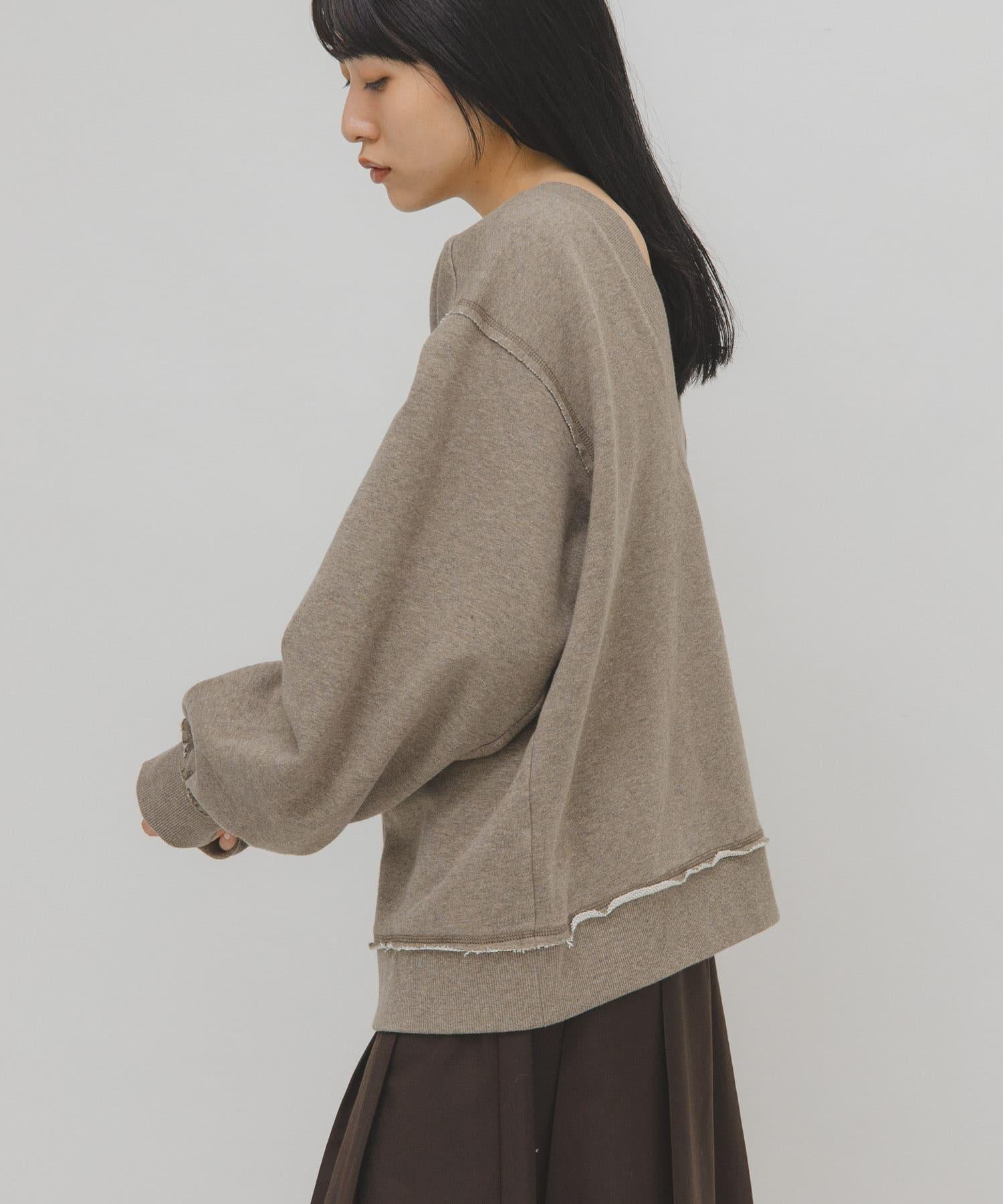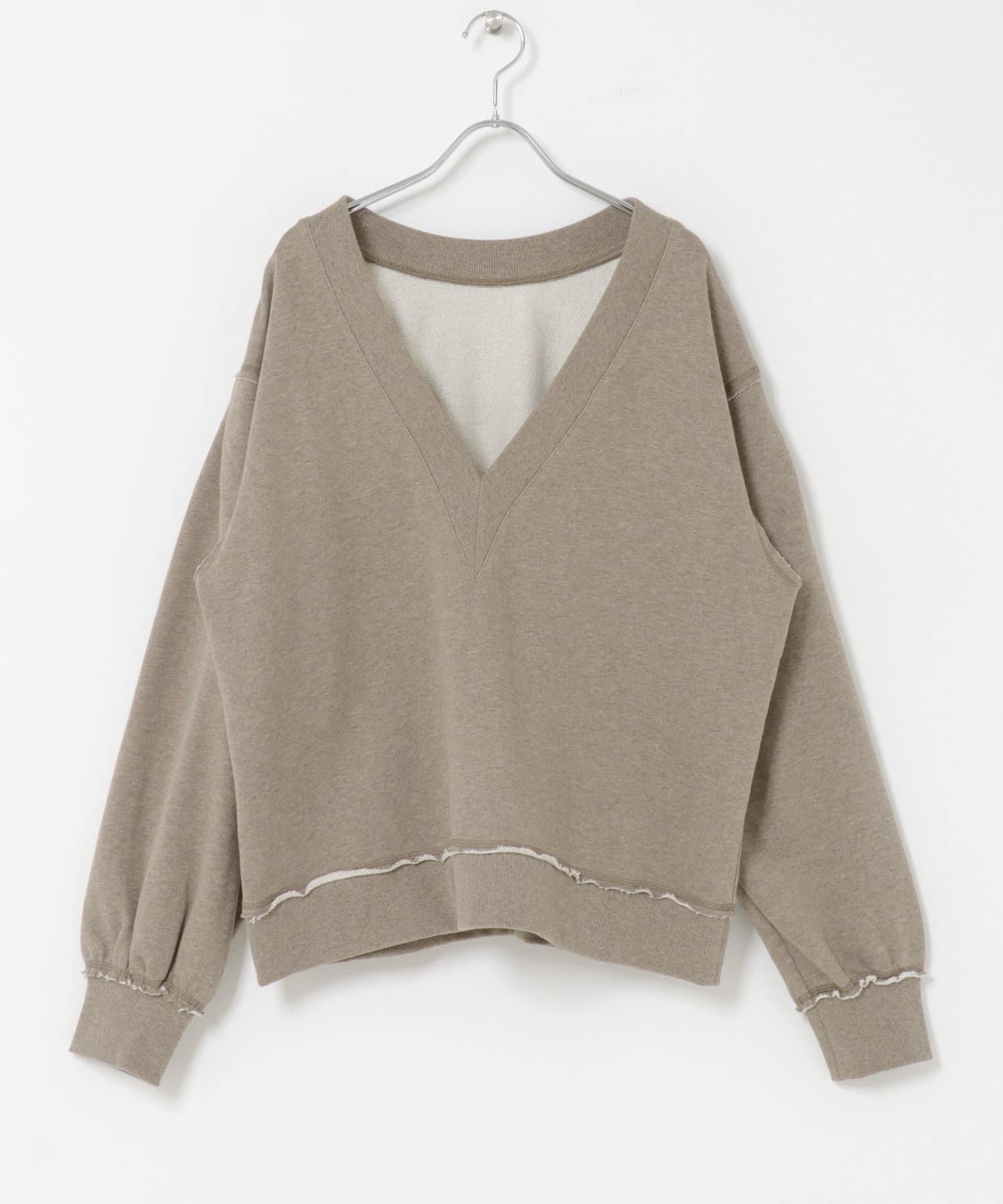 這款運動衫採用細緻的木質面料,前後均可雙面穿著。前幅的 V 領設計讓領口線條更簡潔、寬鬆,而寬鬆的尺寸則給人更輕鬆的感覺。也可作為圓領穿著。袖子和下襬的剪裁規格也是一大看點。如果內搭一件背心,則會有一種略帶模式化和女性化的感覺。