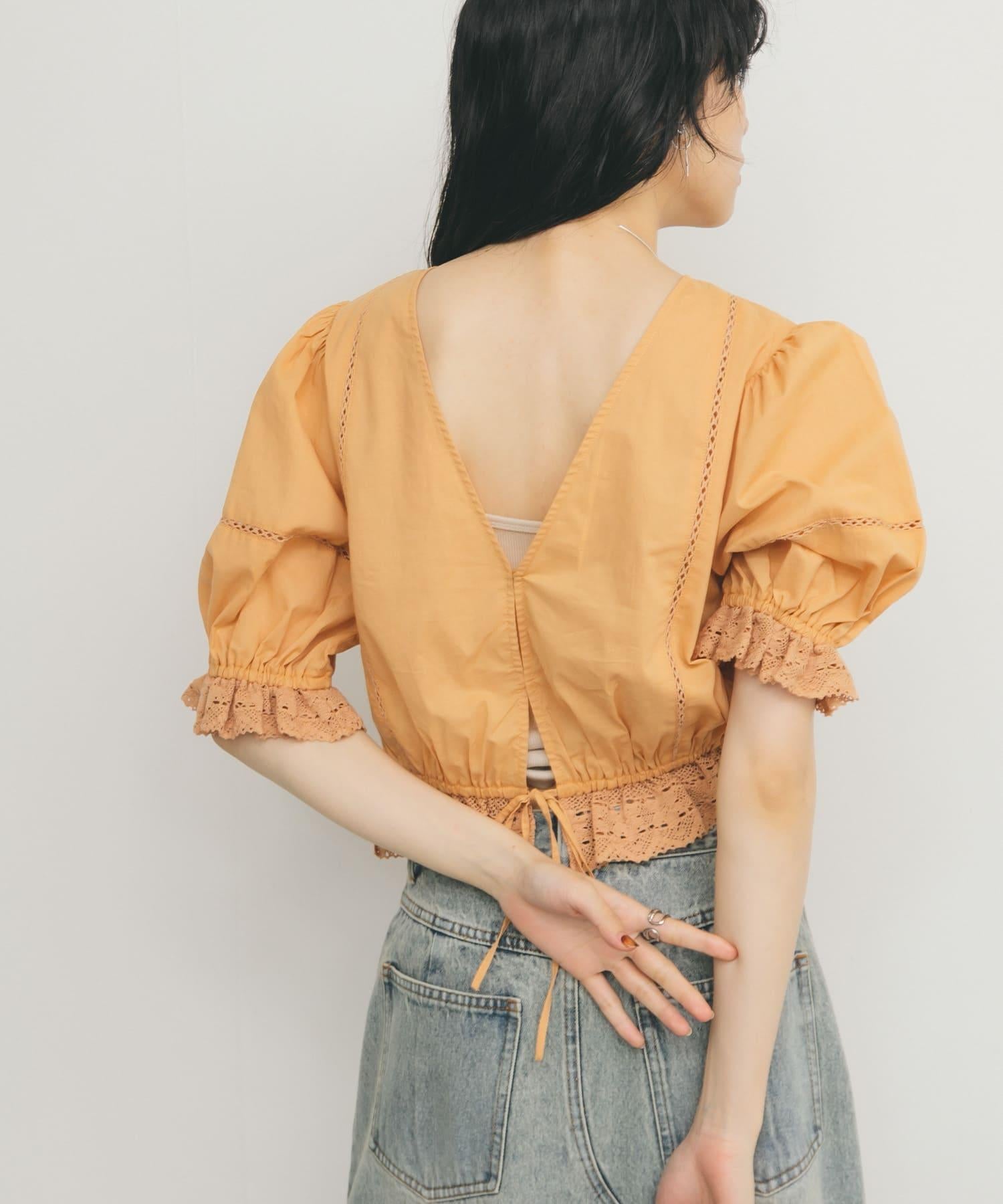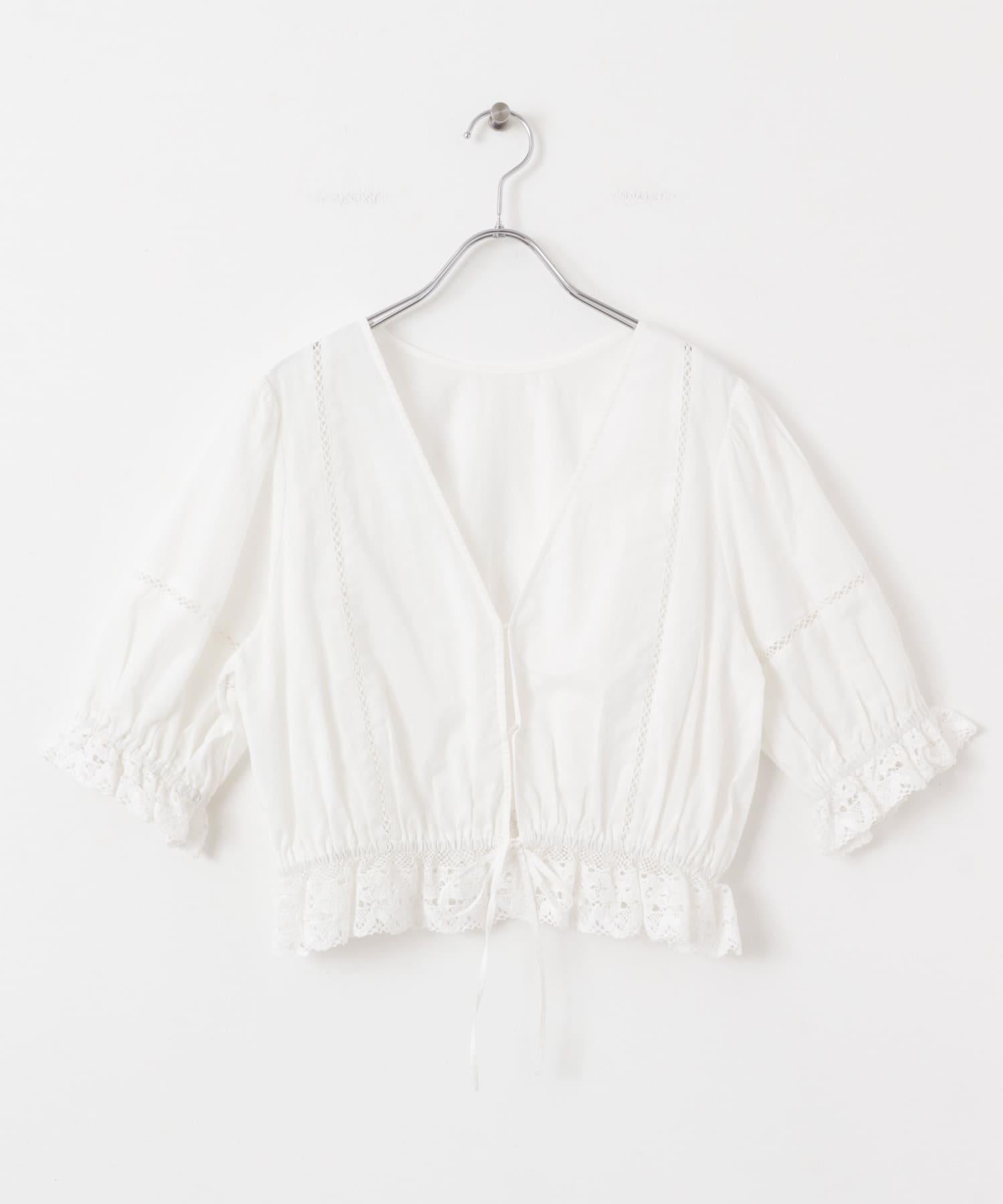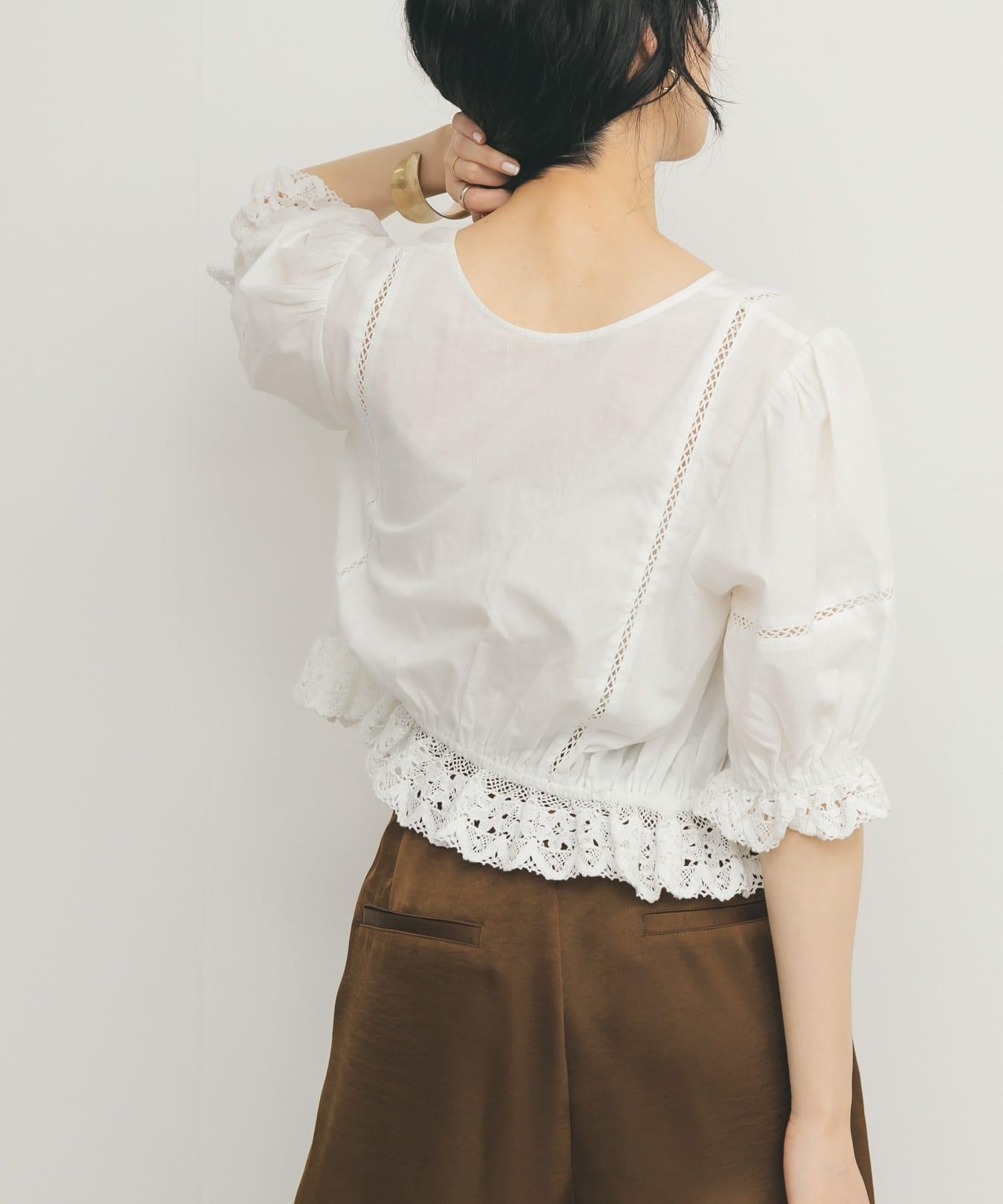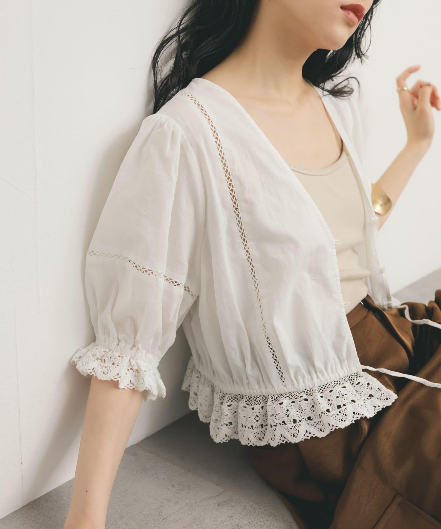 蕾絲上衣將蕾絲與復古手帕相結合。上衣有前、後兩種穿法,小巧的尺寸讓人看起來更加苗條。舒適的棉質面料和可作為梭織面料使用的規格也是重點。在休閒搭配中,它能帶來恰到好處的甜美感。