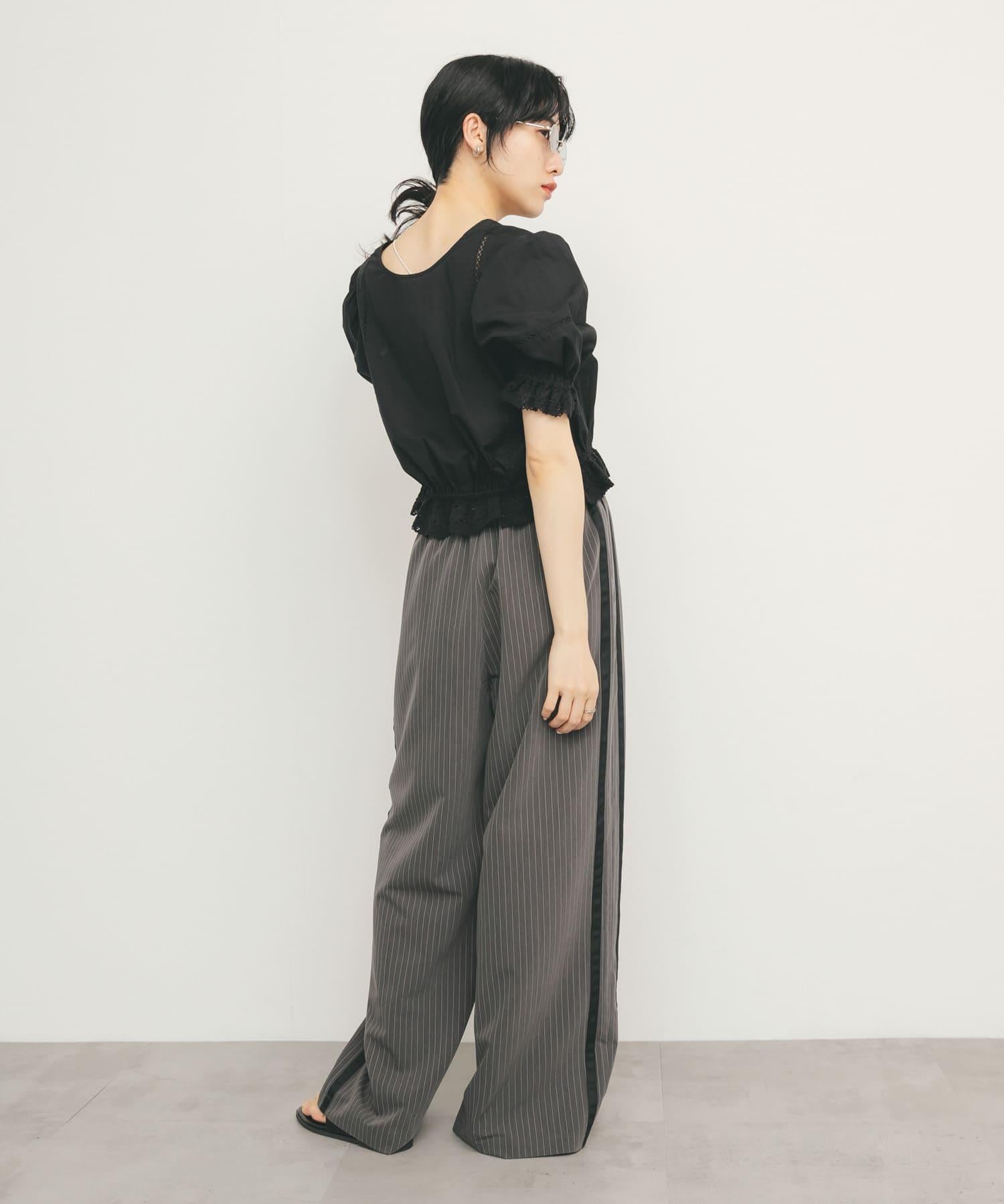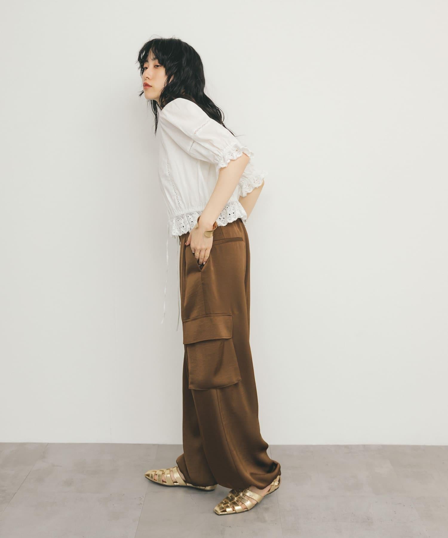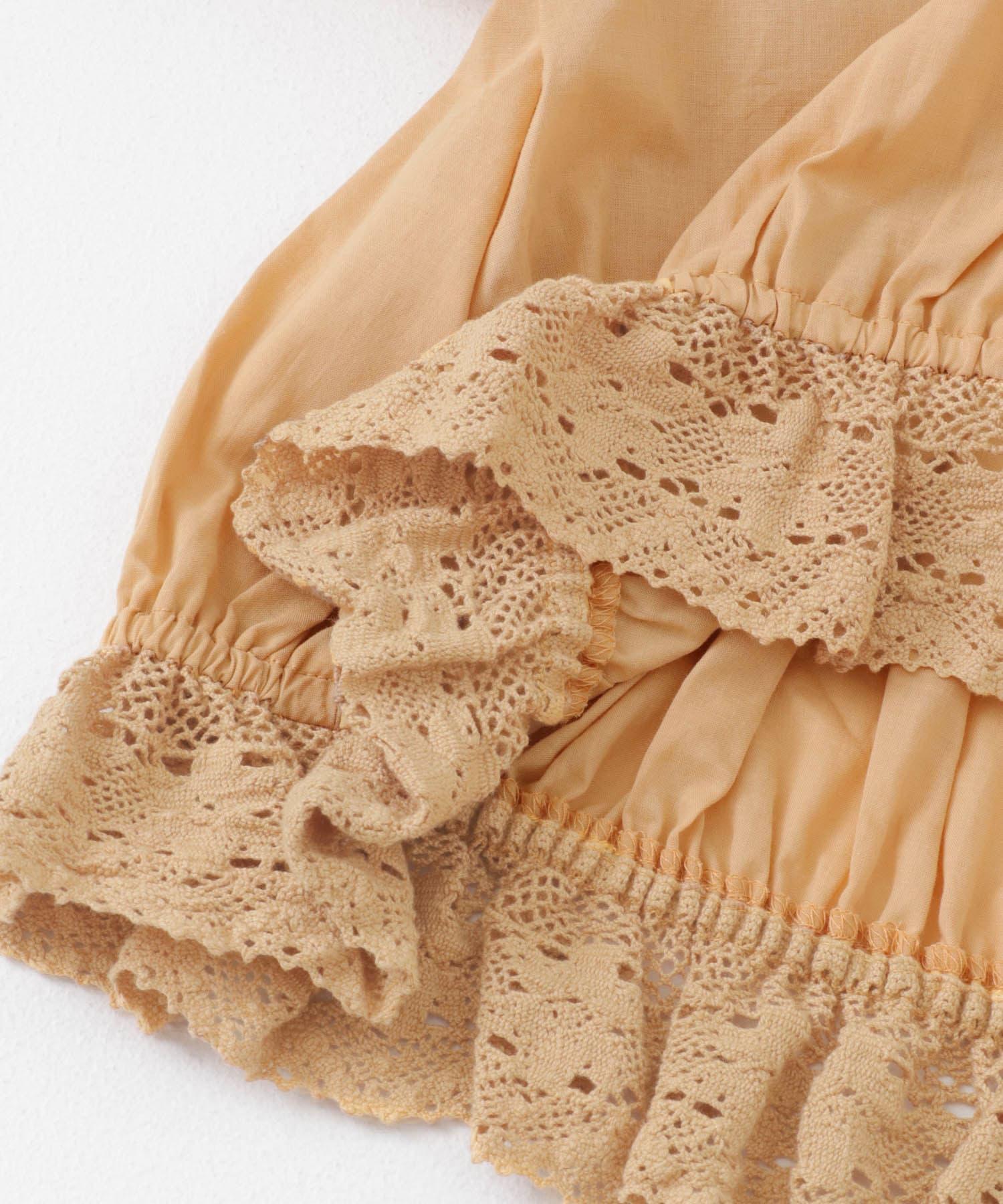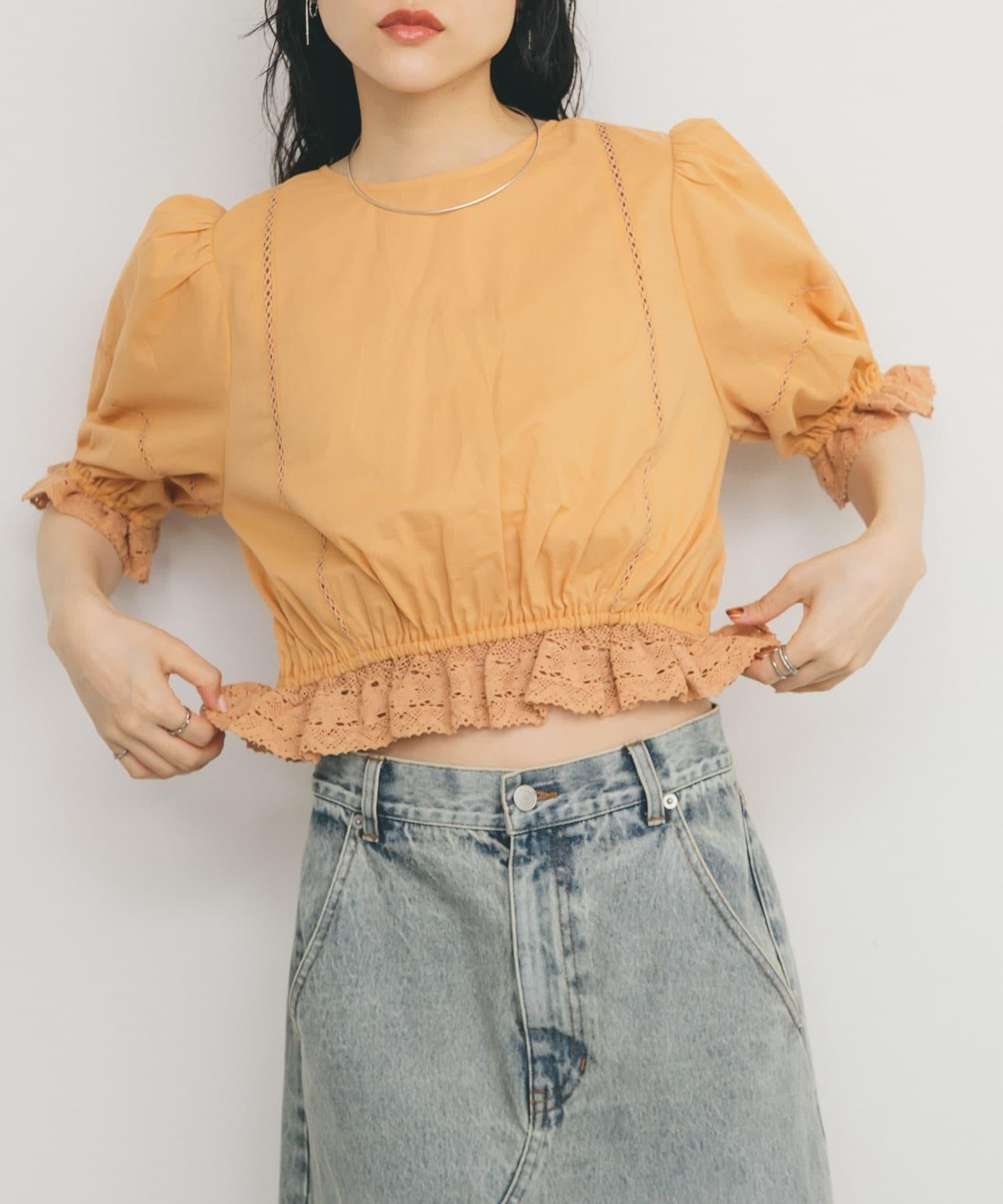 蕾絲上衣將蕾絲與復古手帕相結合。上衣有前、後兩種穿法,小巧的尺寸讓人看起來更加苗條。舒適的棉質面料和可作為梭織面料使用的規格也是重點。在休閒搭配中,它能帶來恰到好處的甜美感。