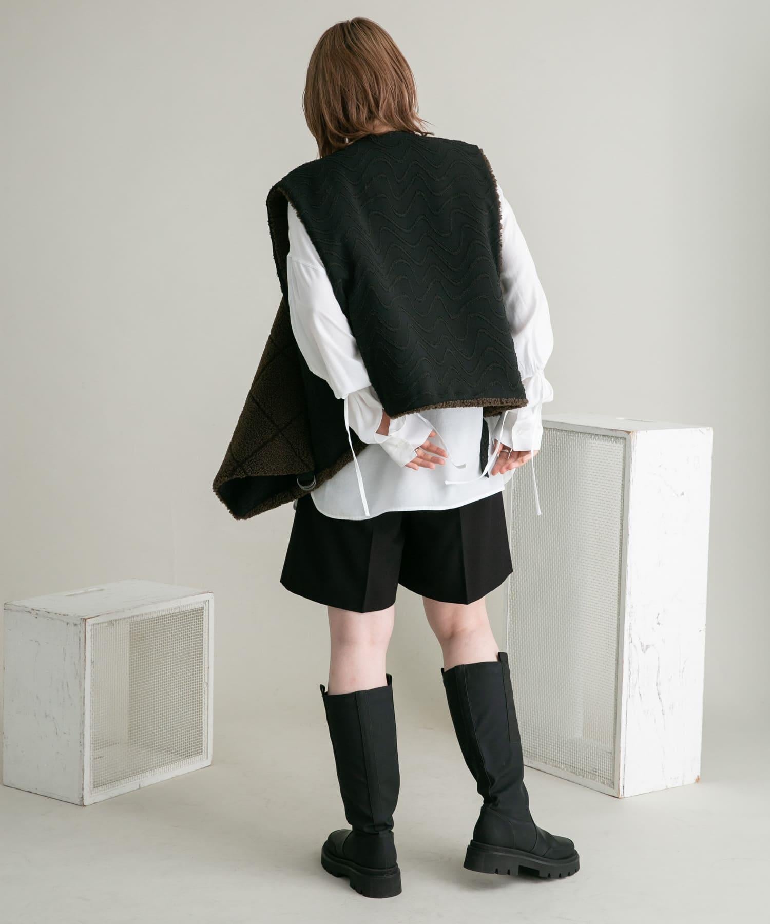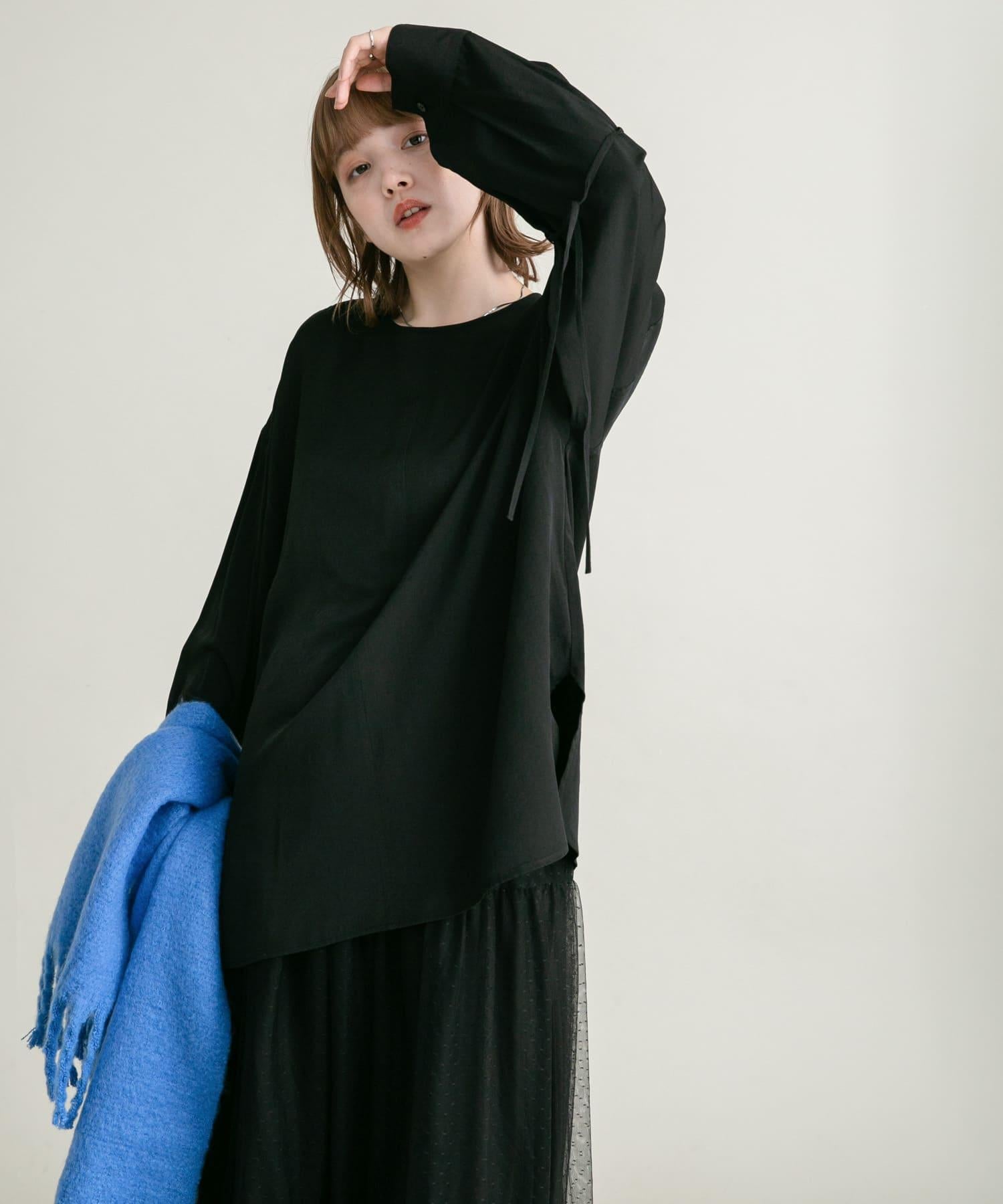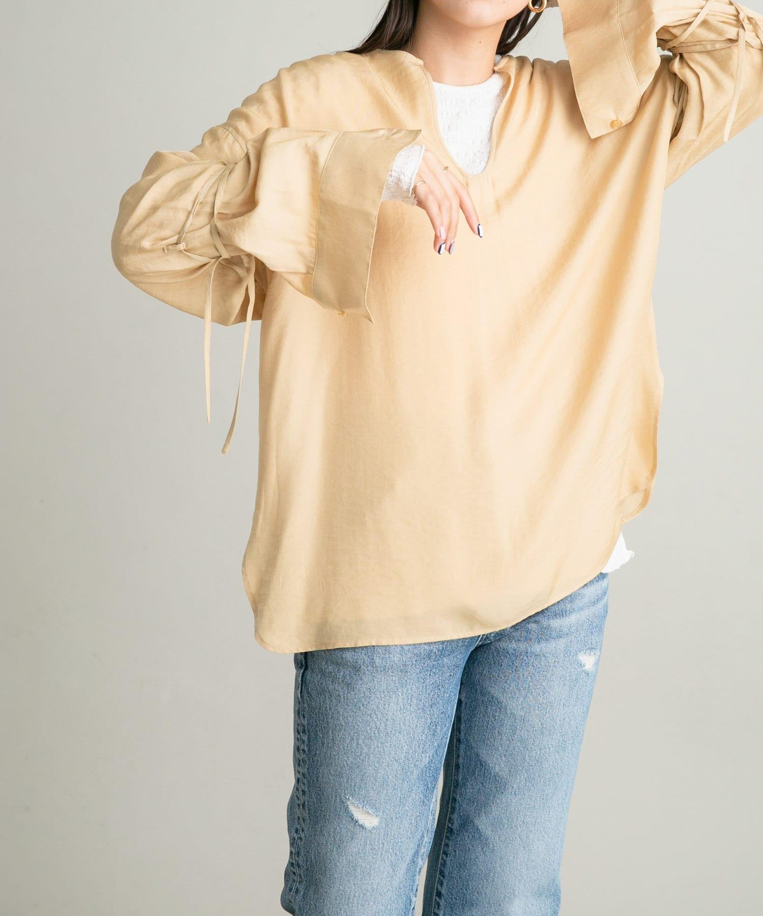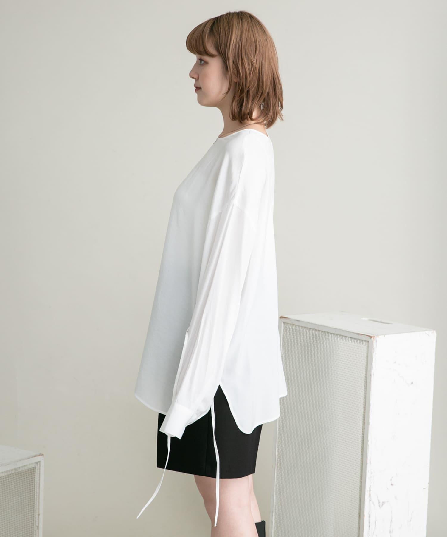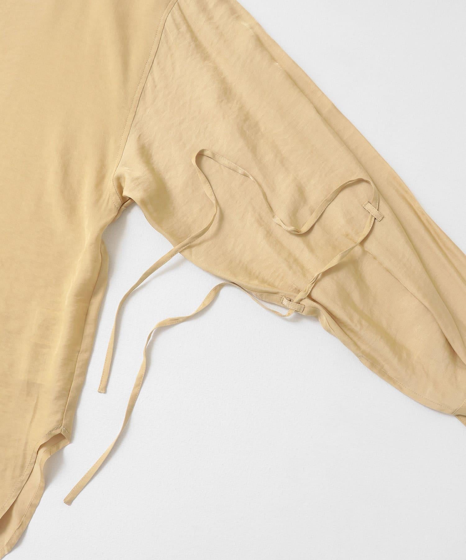 這款襯衫採用前後雙向設計,面料質感寬鬆。這款上衣既可作為圓領上衣穿著,也可取下掛鉤作為圓領上衣穿著。袖子可以系在一起,以改變輪廓。