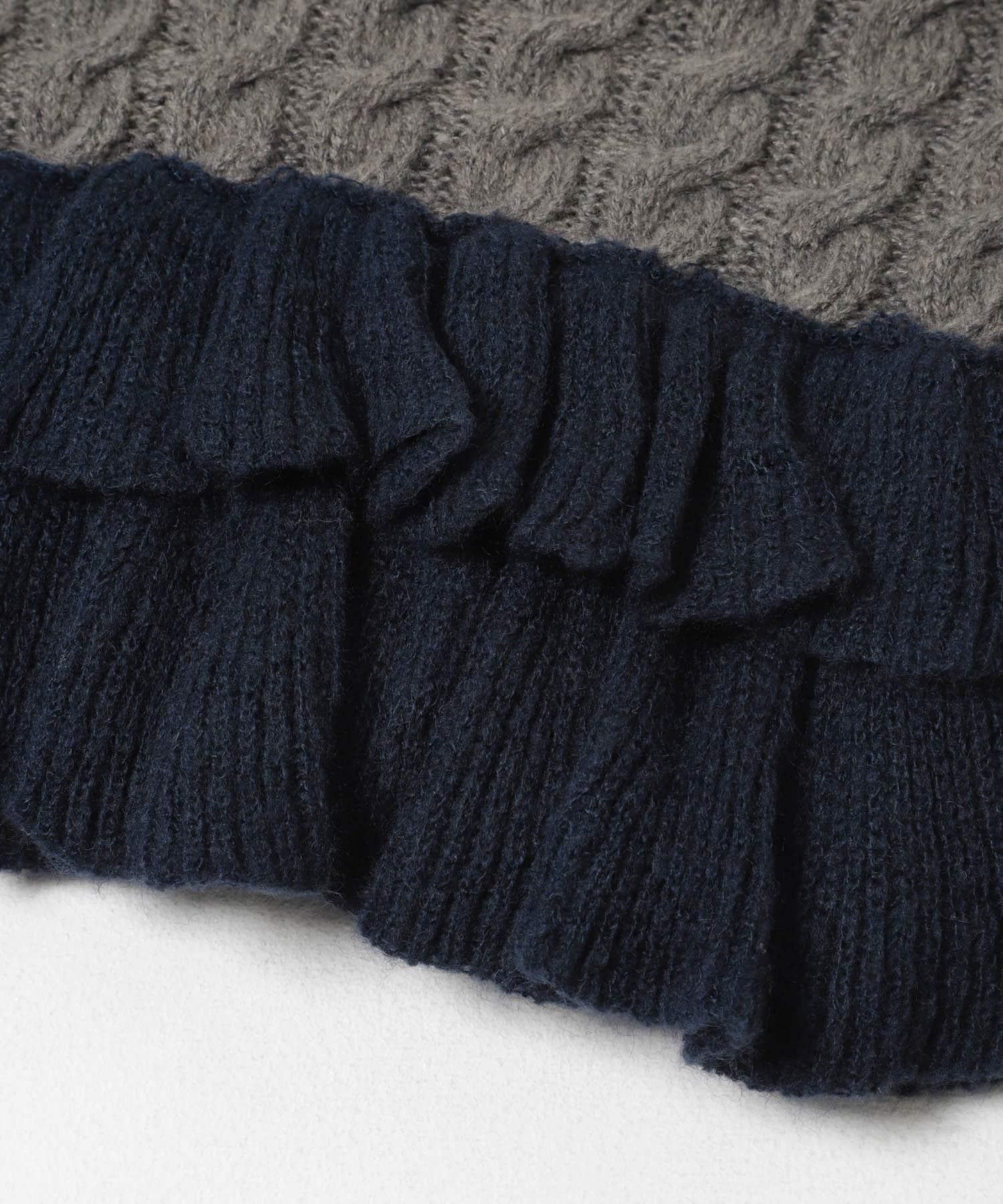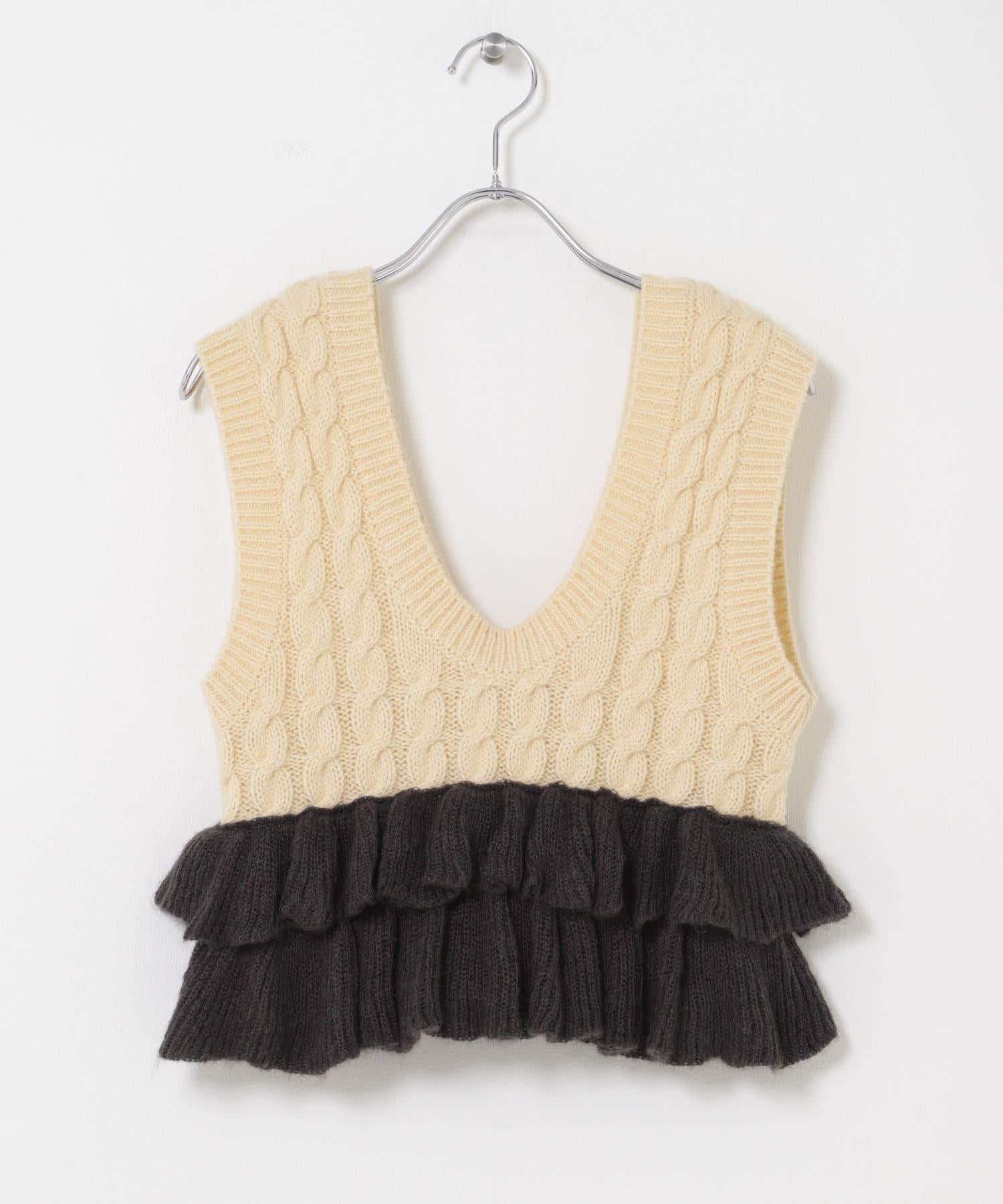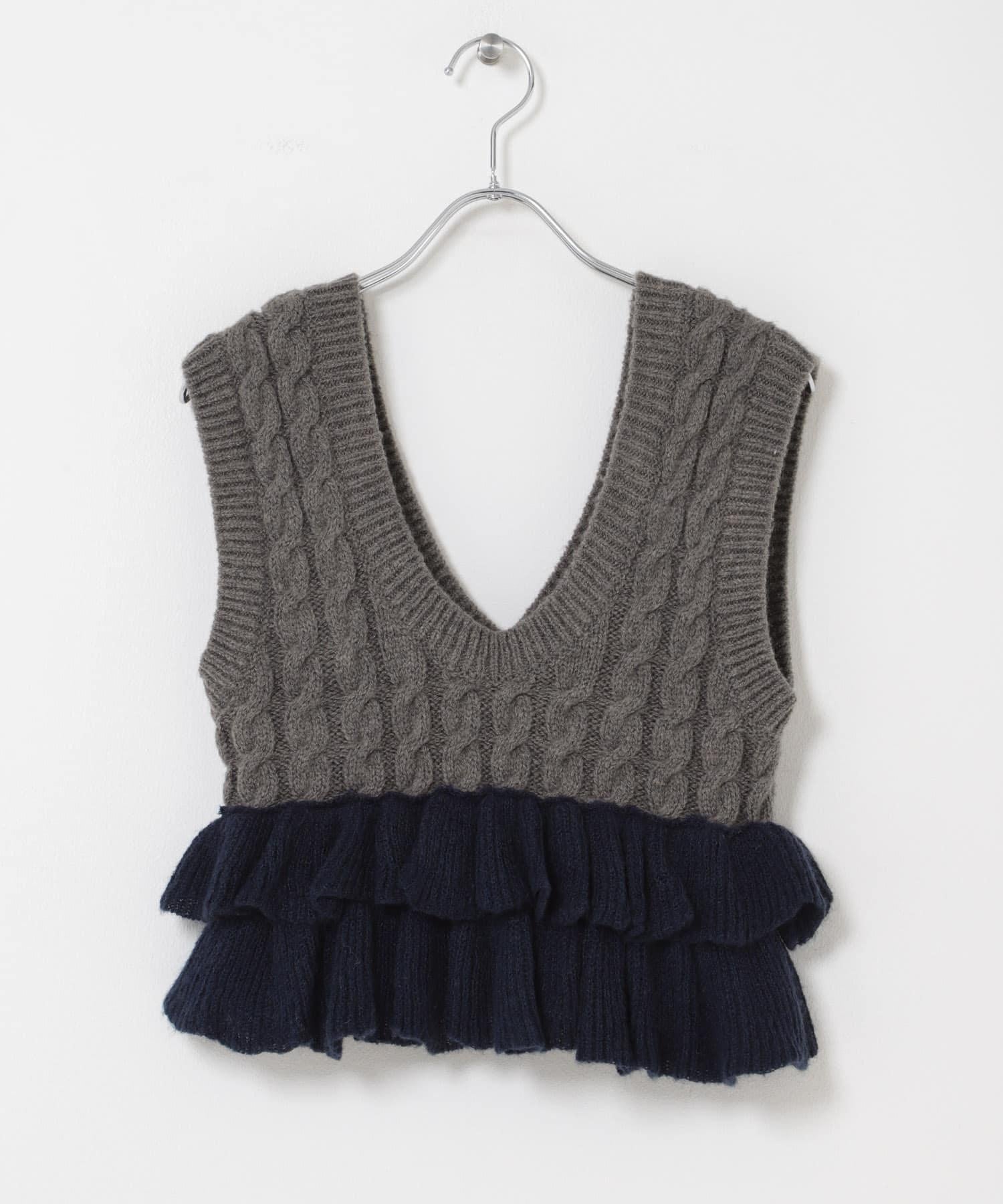 配色荷葉邊下襬針織馬甲。它有前後兩種穿法,穿著時自然會增添一抹魅力。精巧的電纜編織也是一大亮點。小巧的尺寸意味著你也可以期待水銀般的外觀。