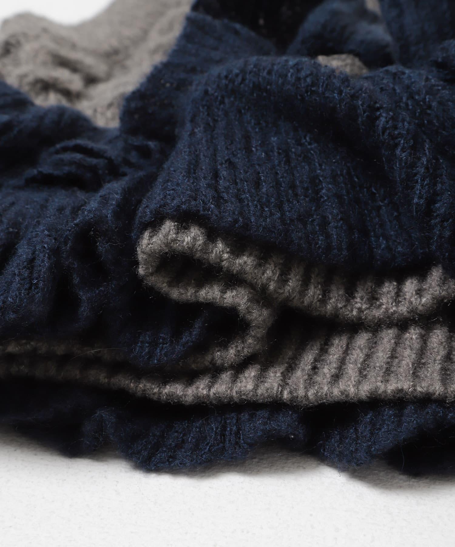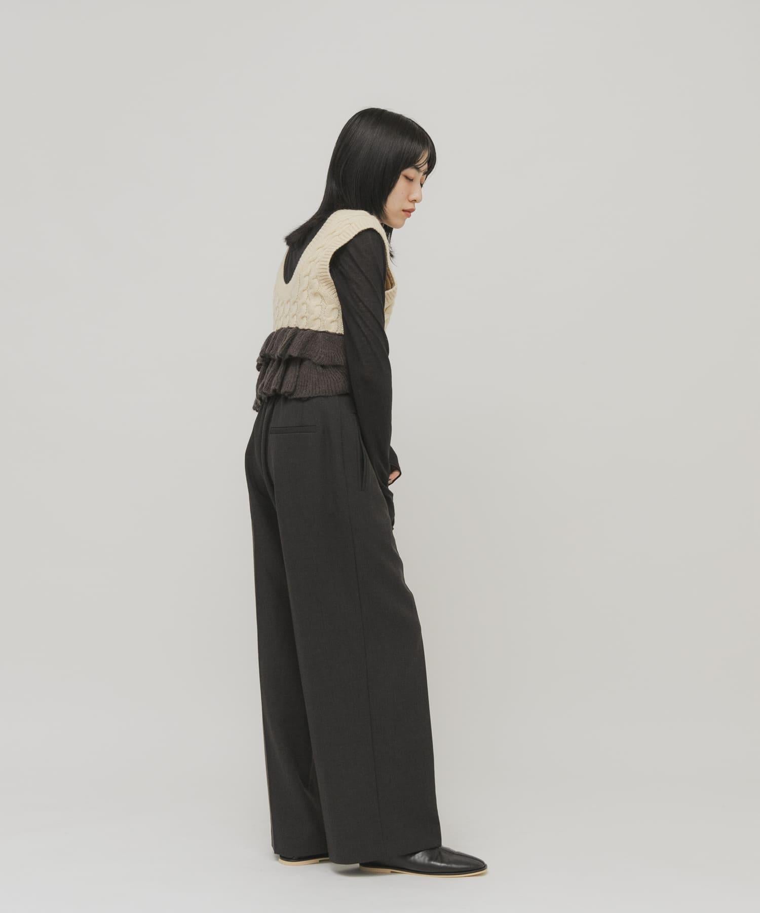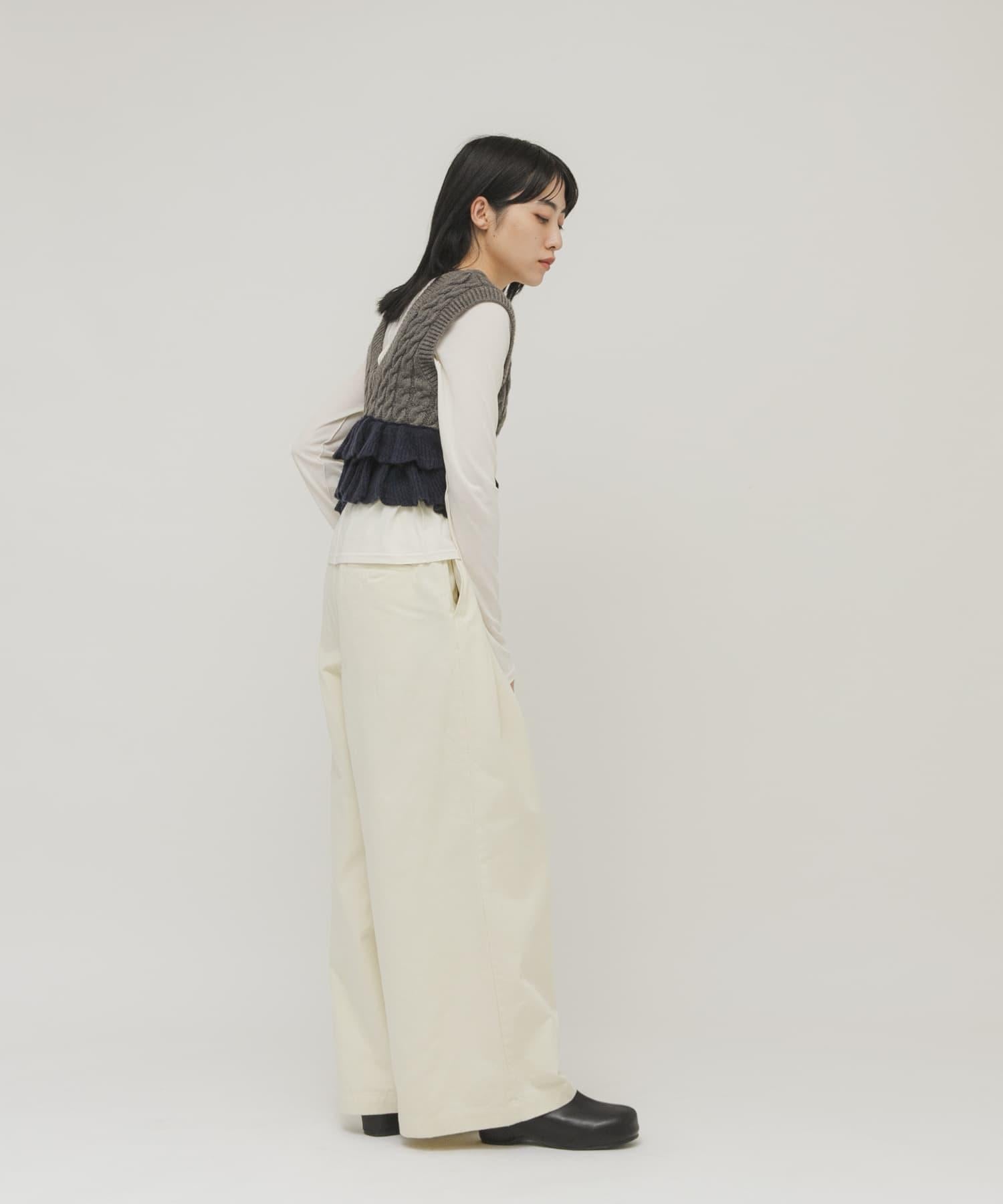 配色荷葉邊下襬針織馬甲。它有前後兩種穿法,穿著時自然會增添一抹魅力。精巧的電纜編織也是一大亮點。小巧的尺寸意味著你也可以期待水銀般的外觀。