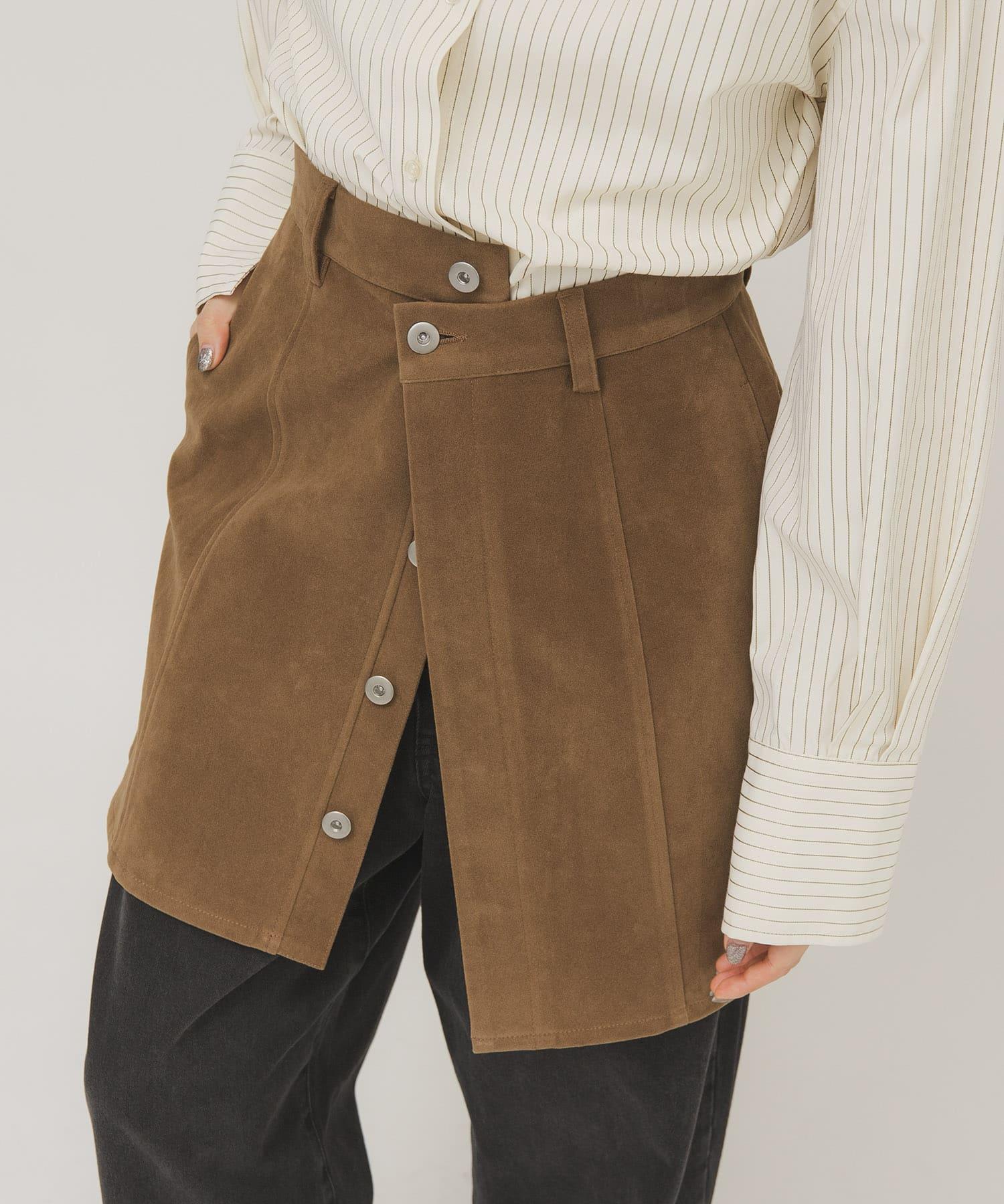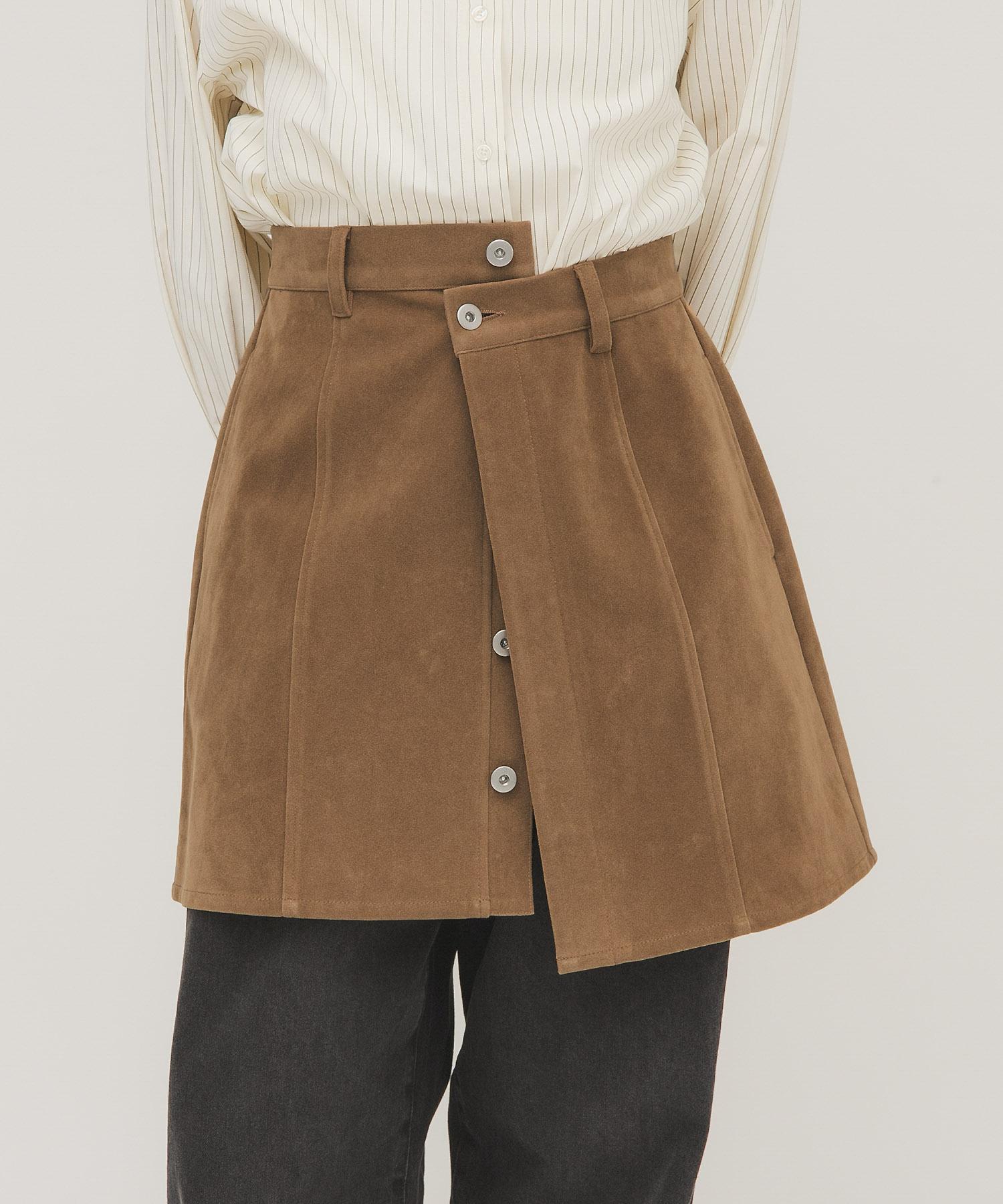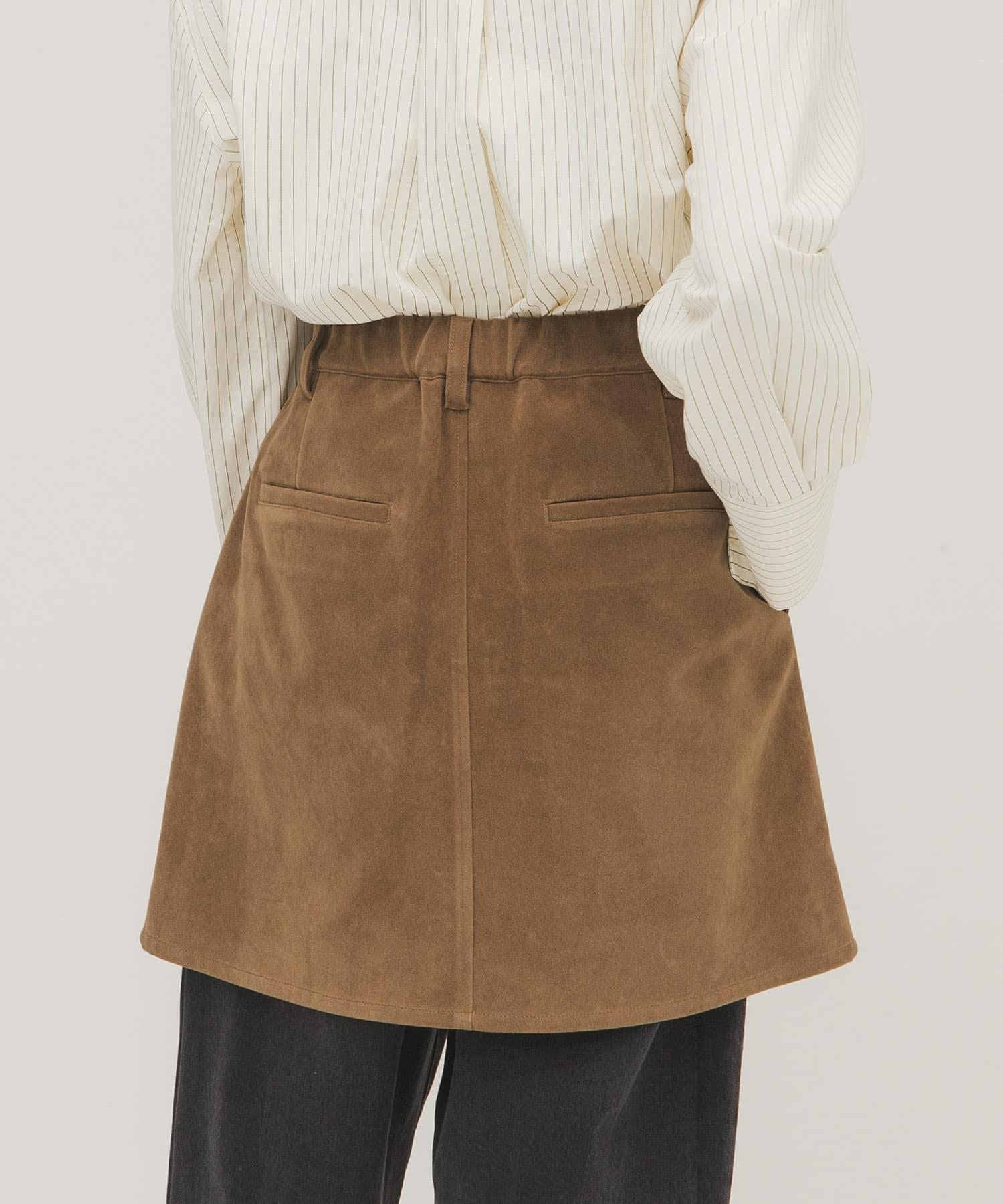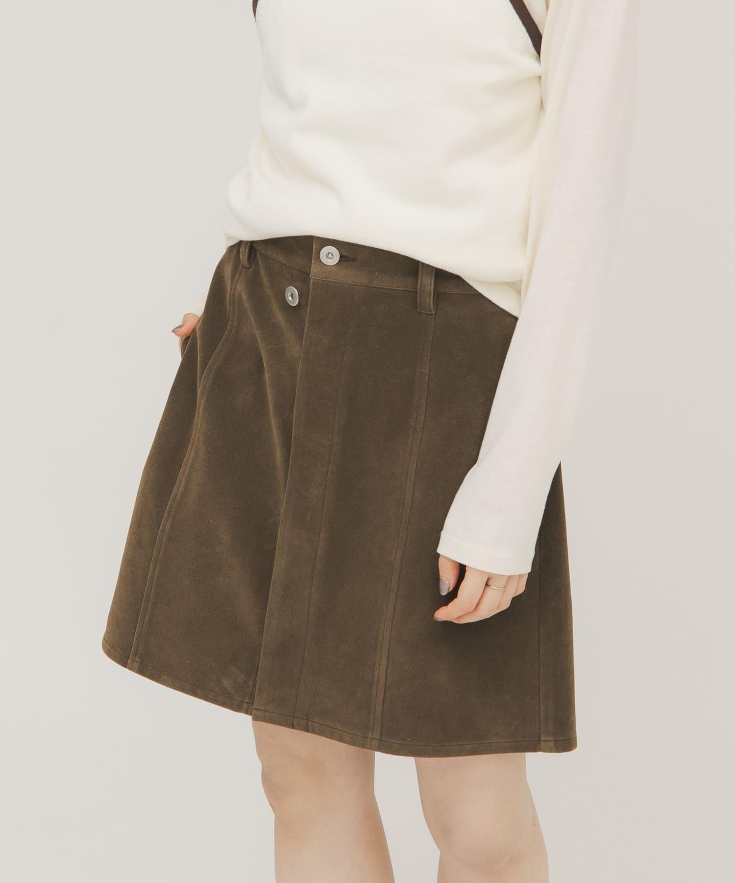 這款迷你裙採用硬度適中的麂皮絨面料製成,具有悠閒的感覺,不僅可以作為單品穿著,還可以作為長褲的疊穿單品,採用前開口設計和開放式紐扣。
