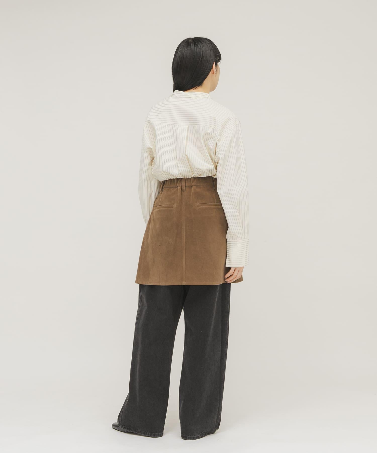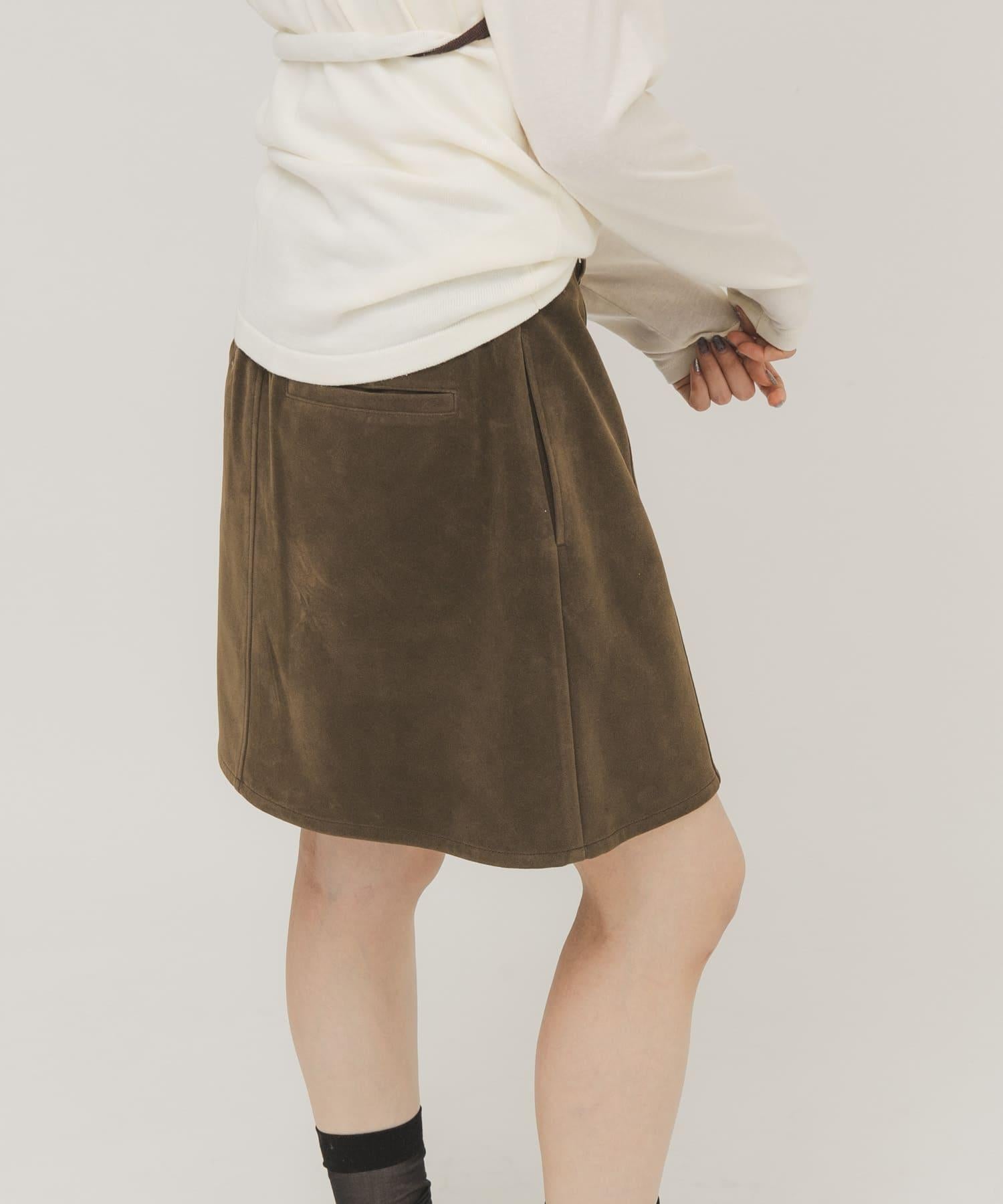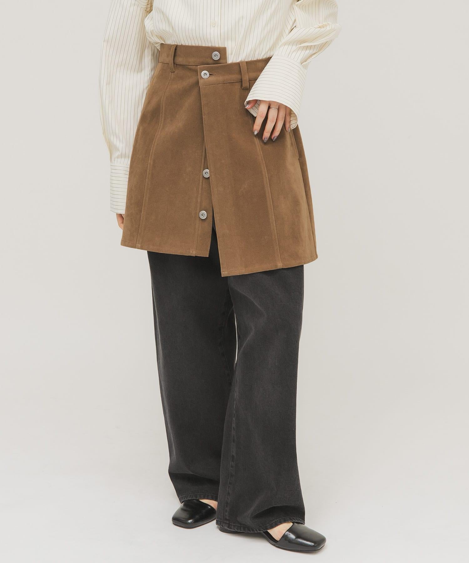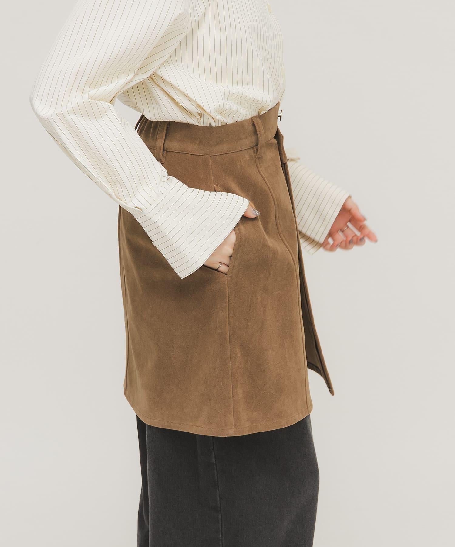這款迷你裙採用硬度適中的麂皮絨面料製成,具有悠閒的感覺,不僅可以作為單品穿著,還可以作為長褲的疊穿單品,採用前開口設計和開放式紐扣。
