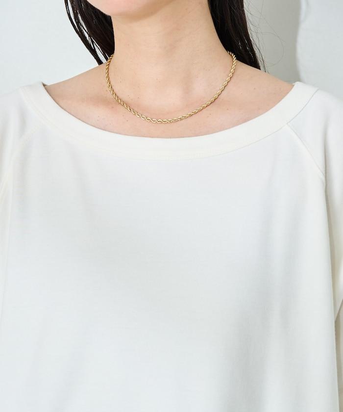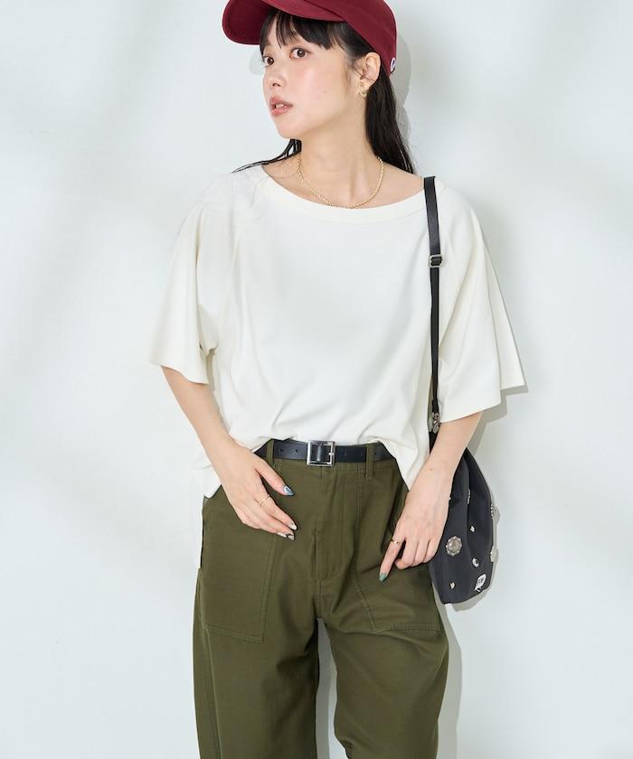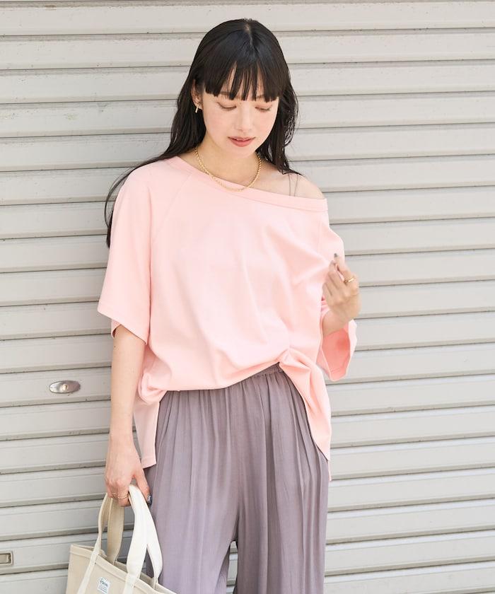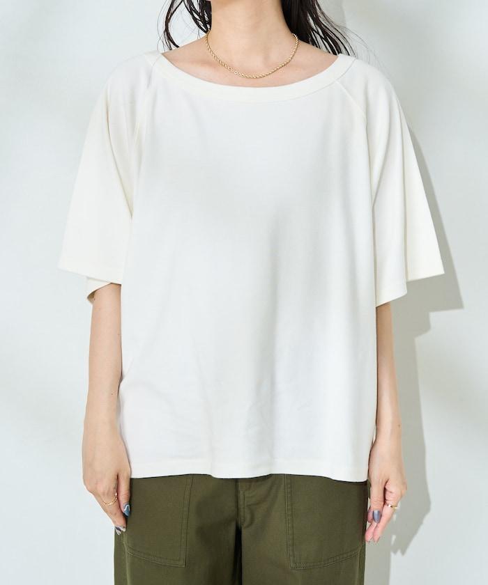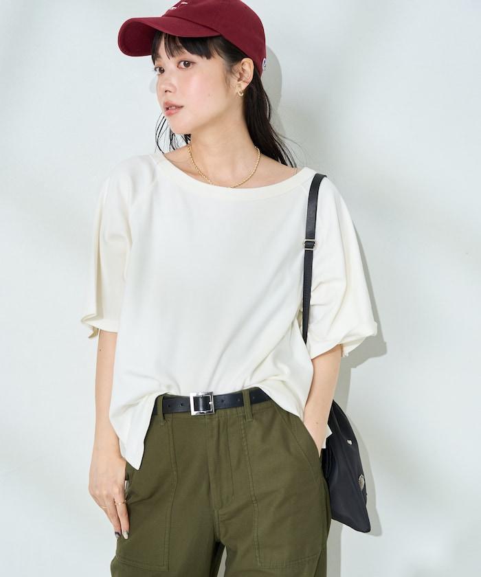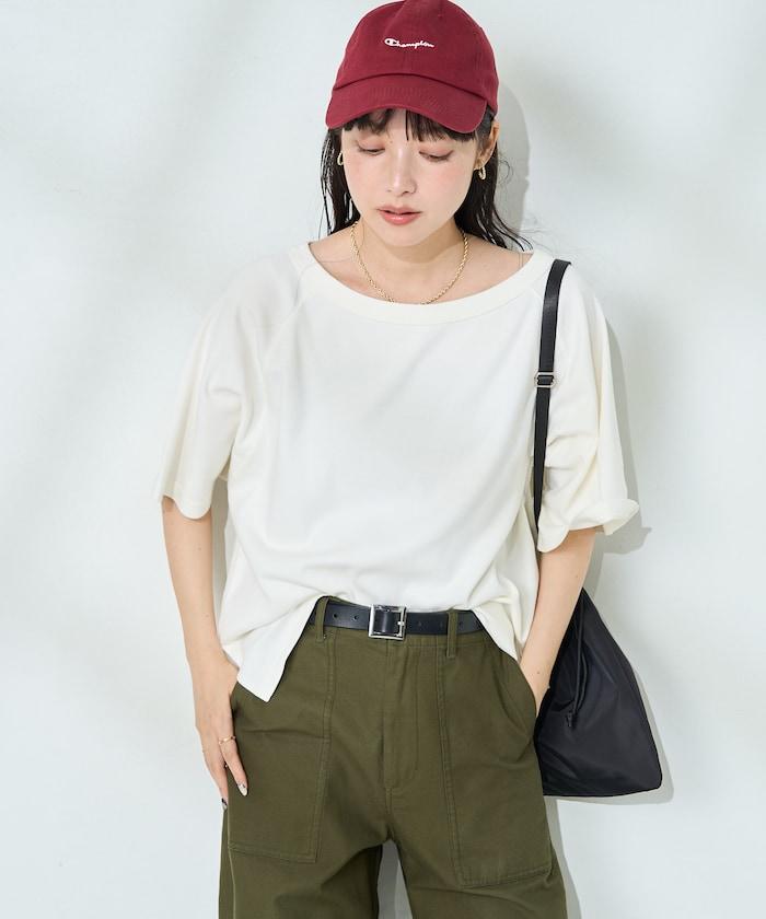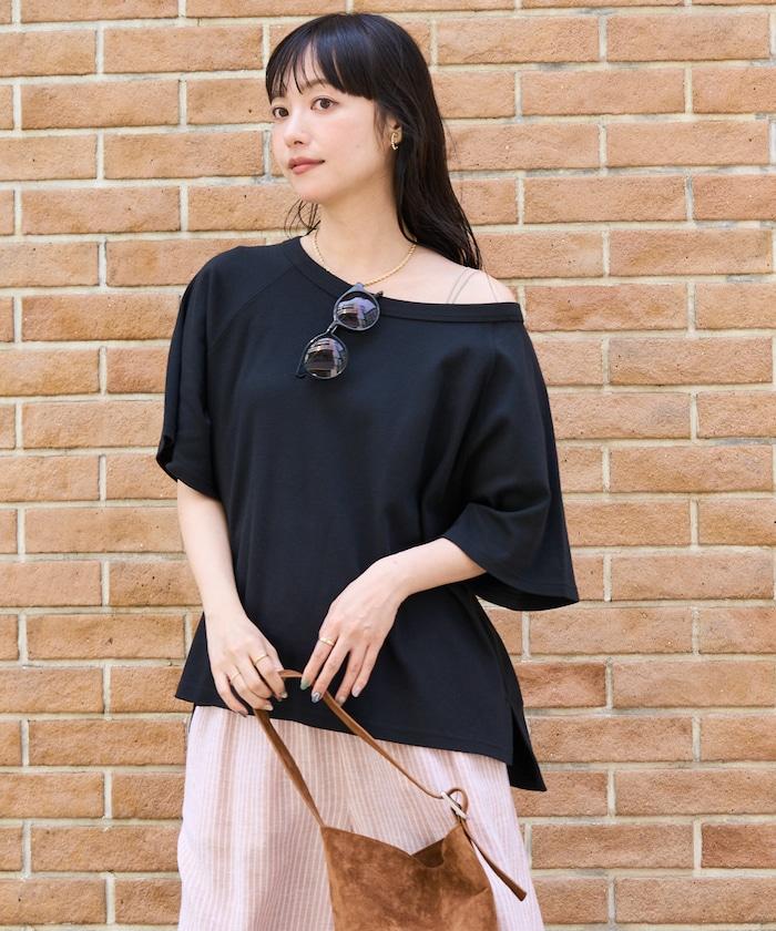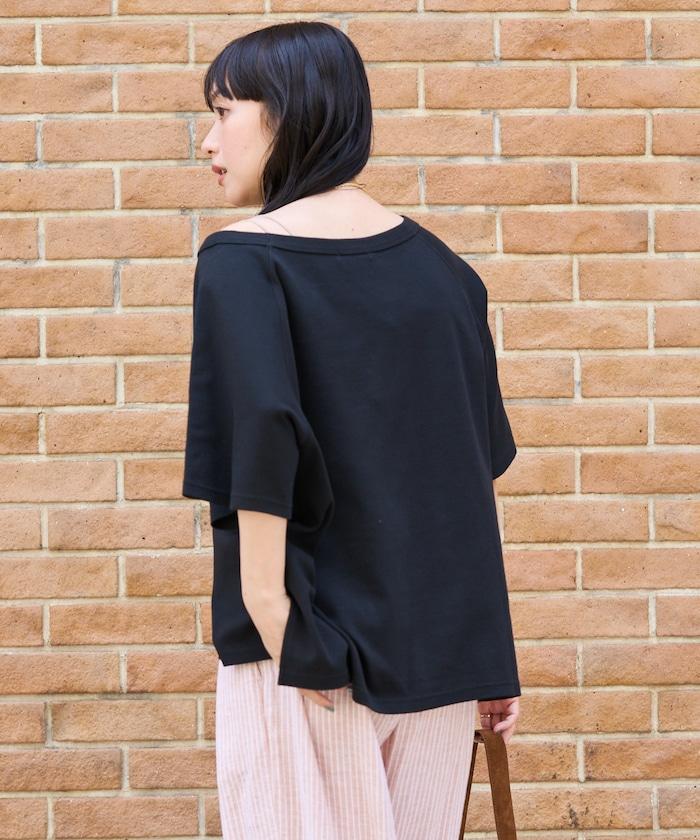 寬而女性化的領口設計讓這款 T 恤也可以露肩穿著。
