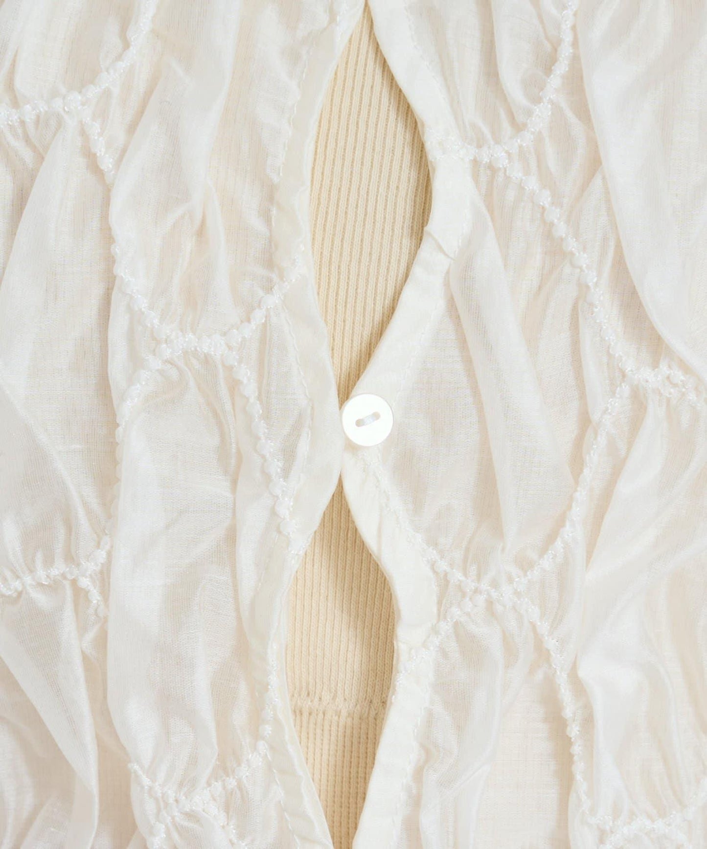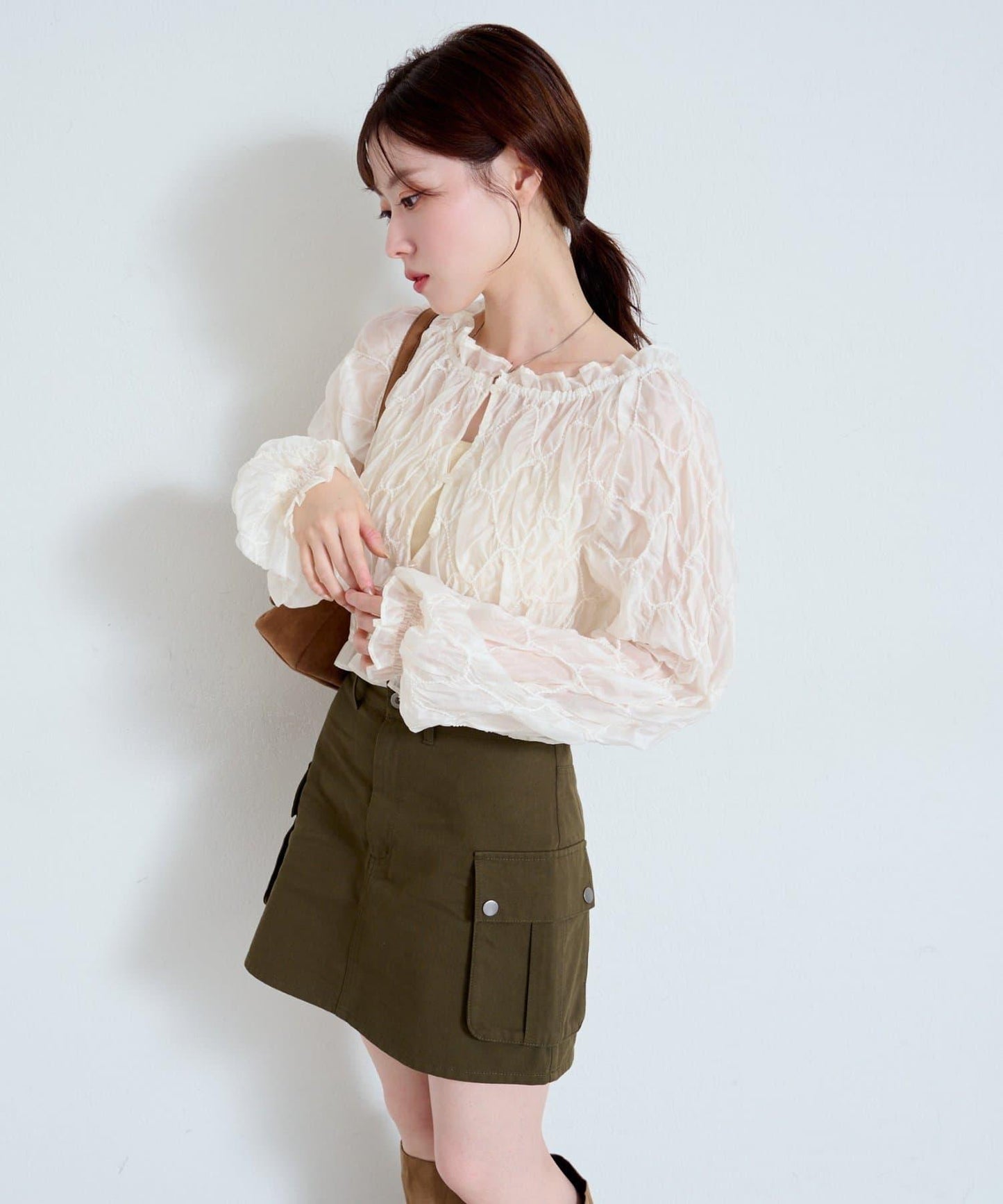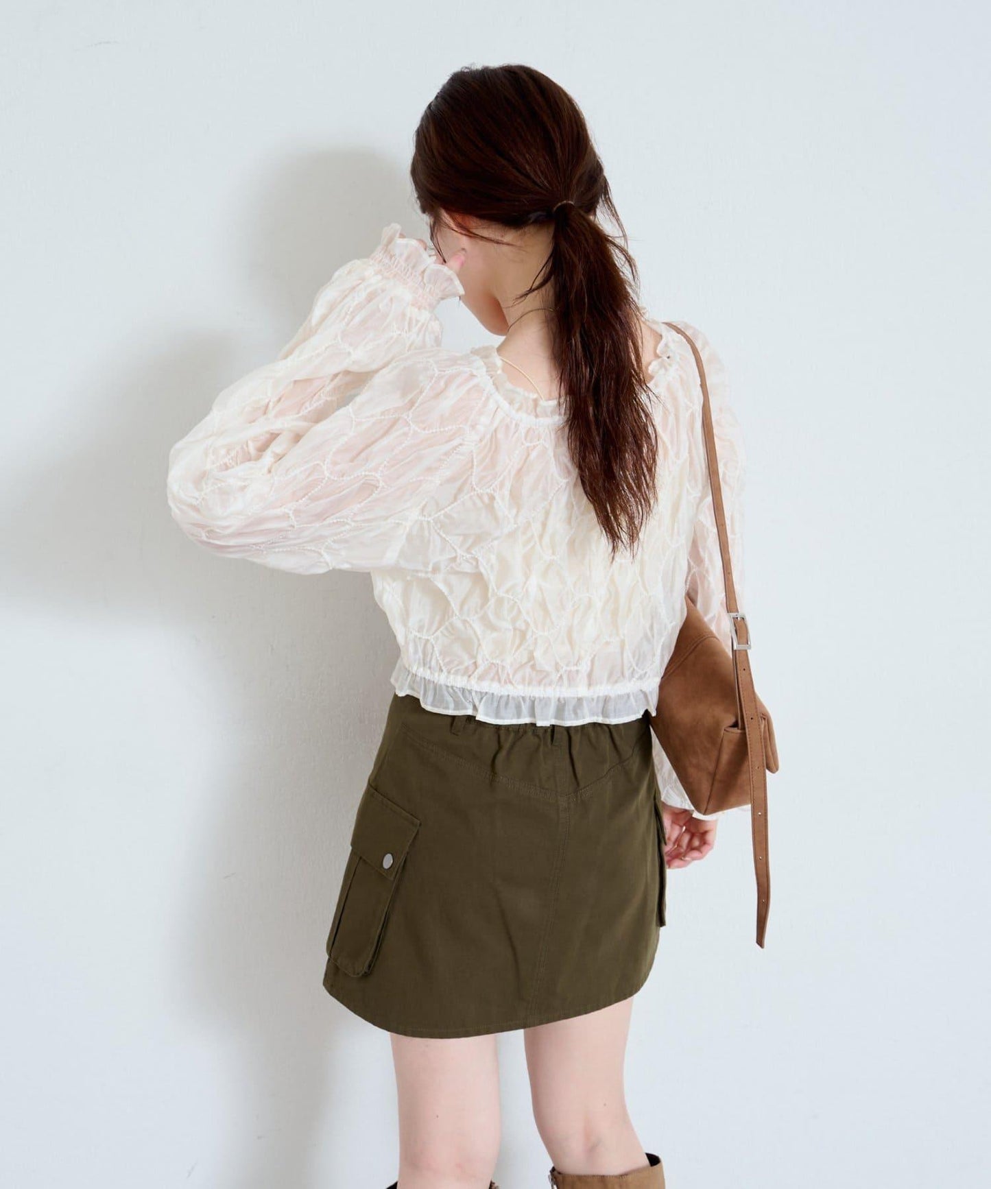 在蓬鬆的透視面料上搭配精緻的搖曳花邊,是一款極具女性魅力的荷葉邊襯衫。
