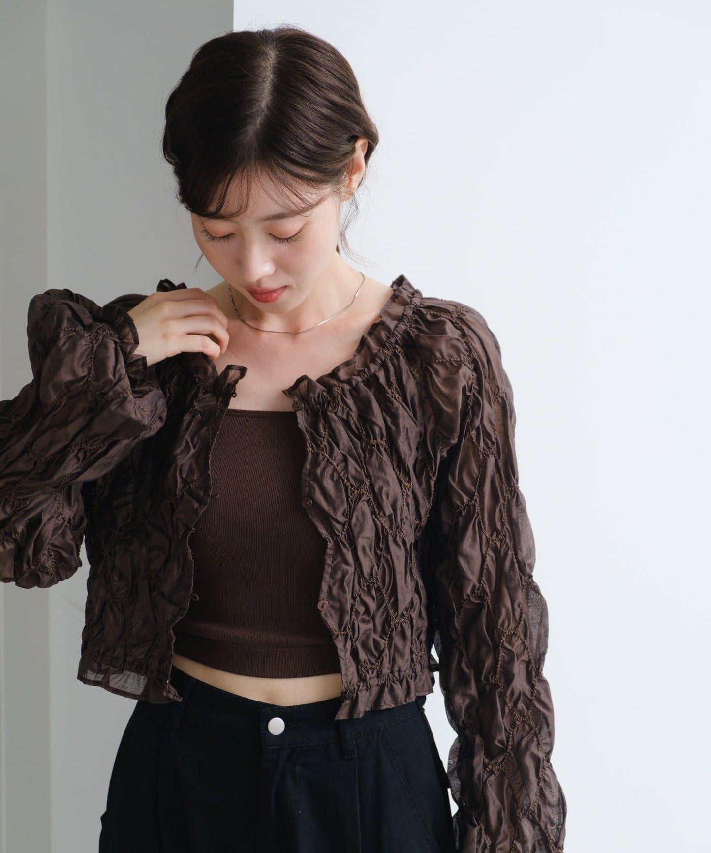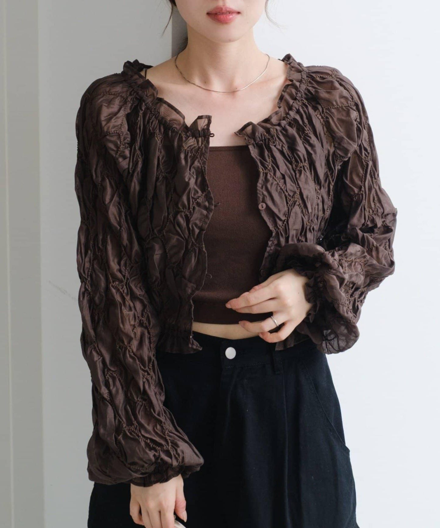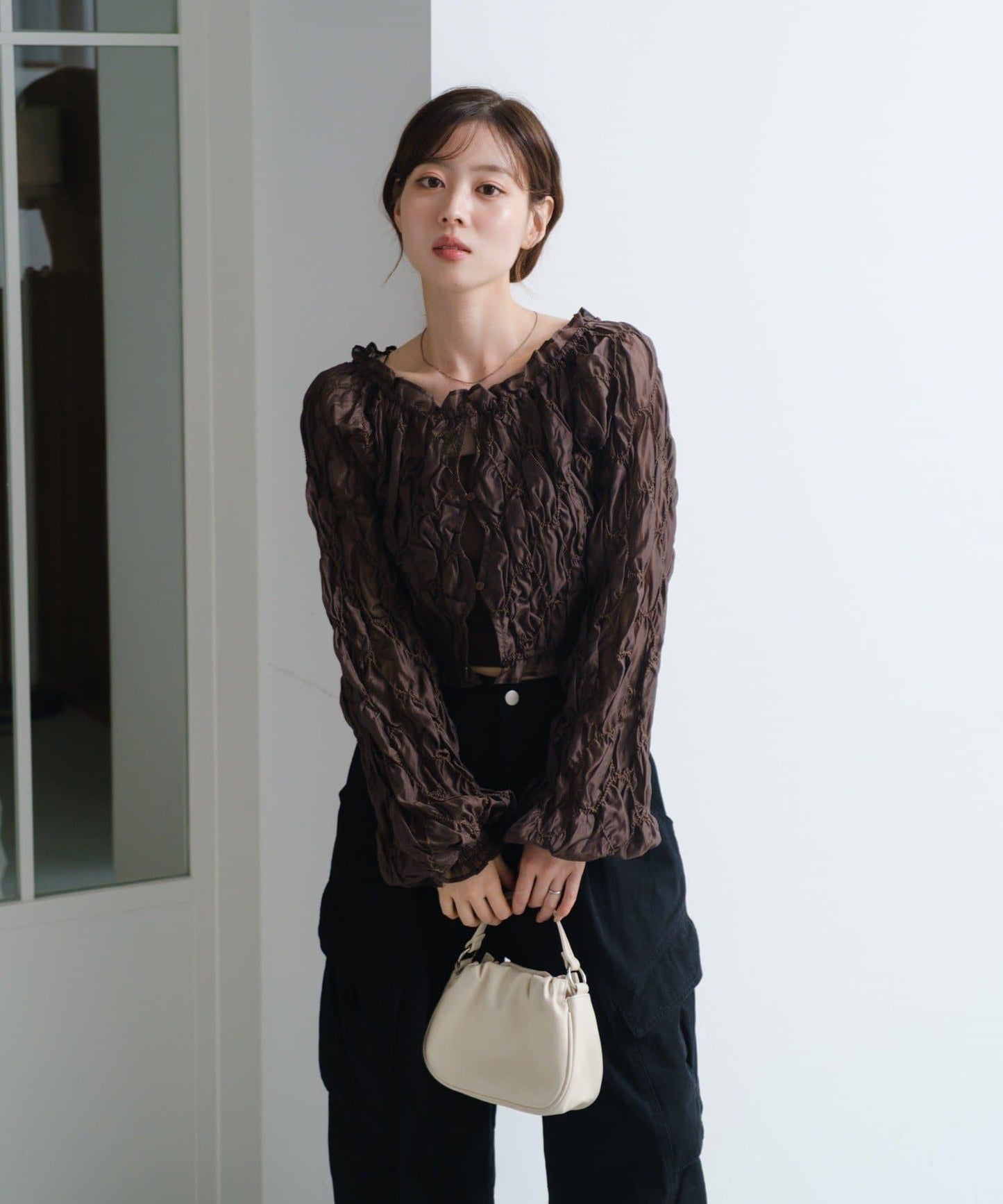 在蓬鬆的透視面料上搭配精緻的搖曳花邊,是一款極具女性魅力的荷葉邊襯衫。