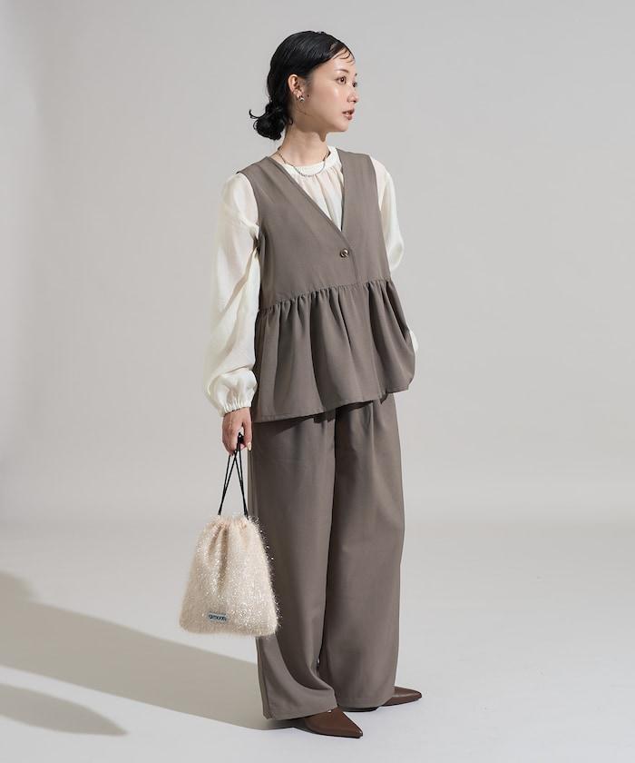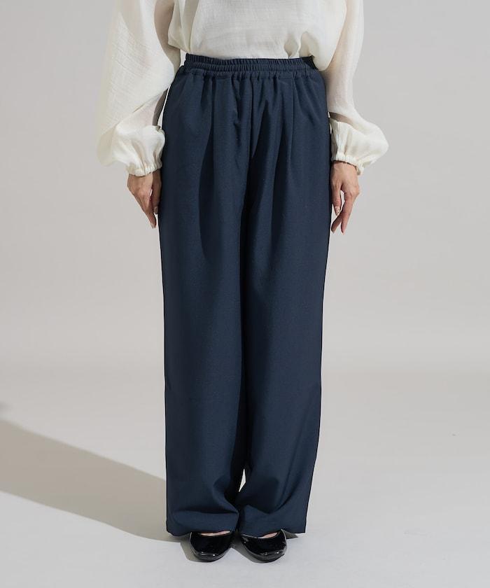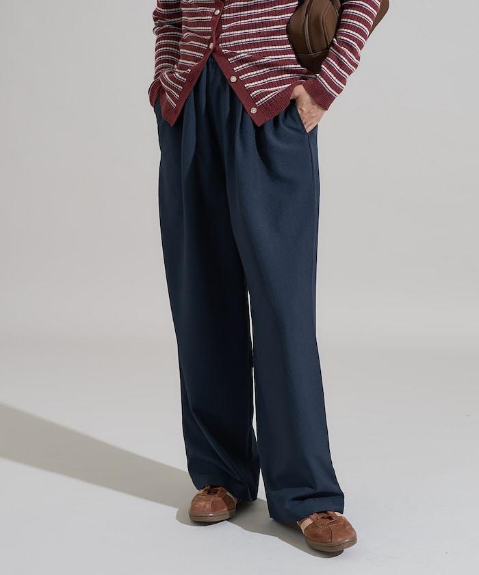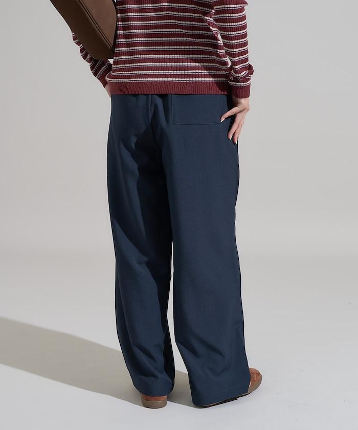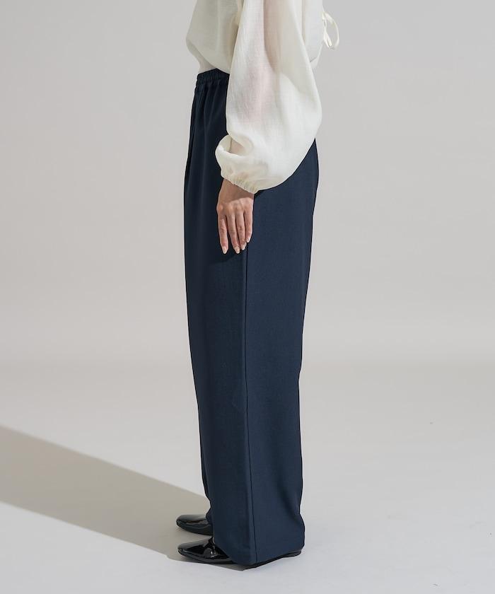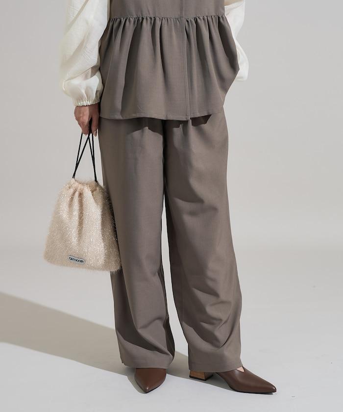 長褲的輪廓寬大,腰部採用鬆緊帶設計,寬鬆合體。