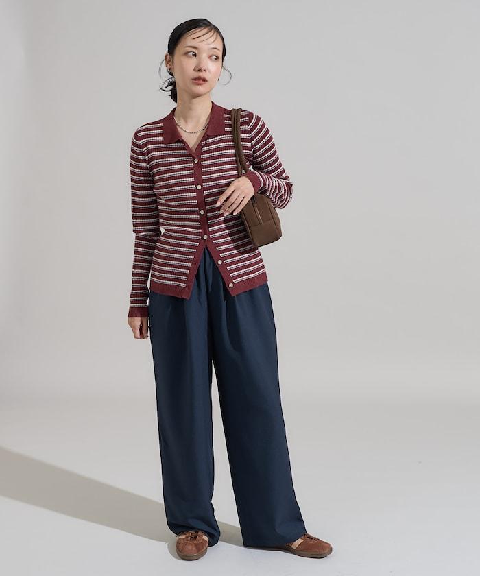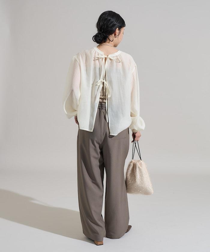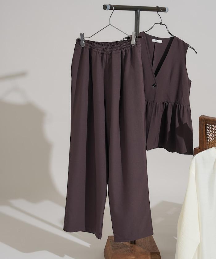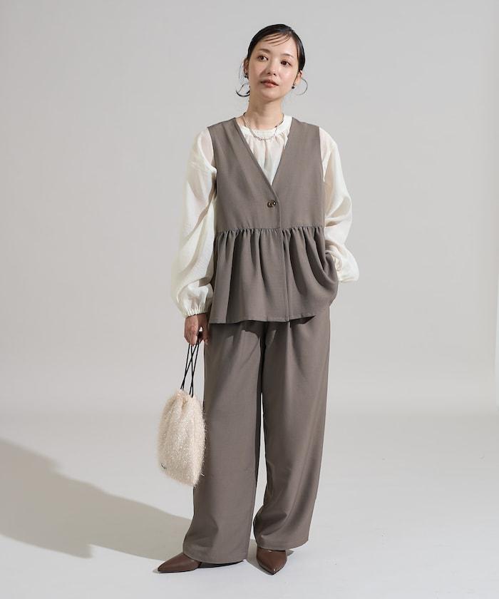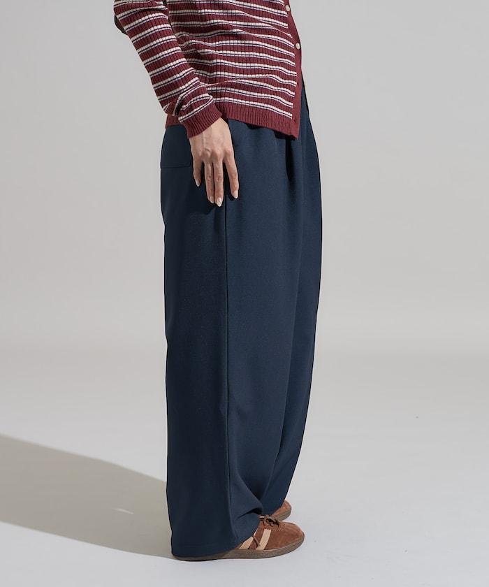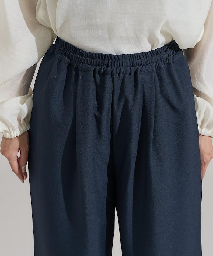 長褲的輪廓寬大,腰部採用鬆緊帶設計,寬鬆合體。