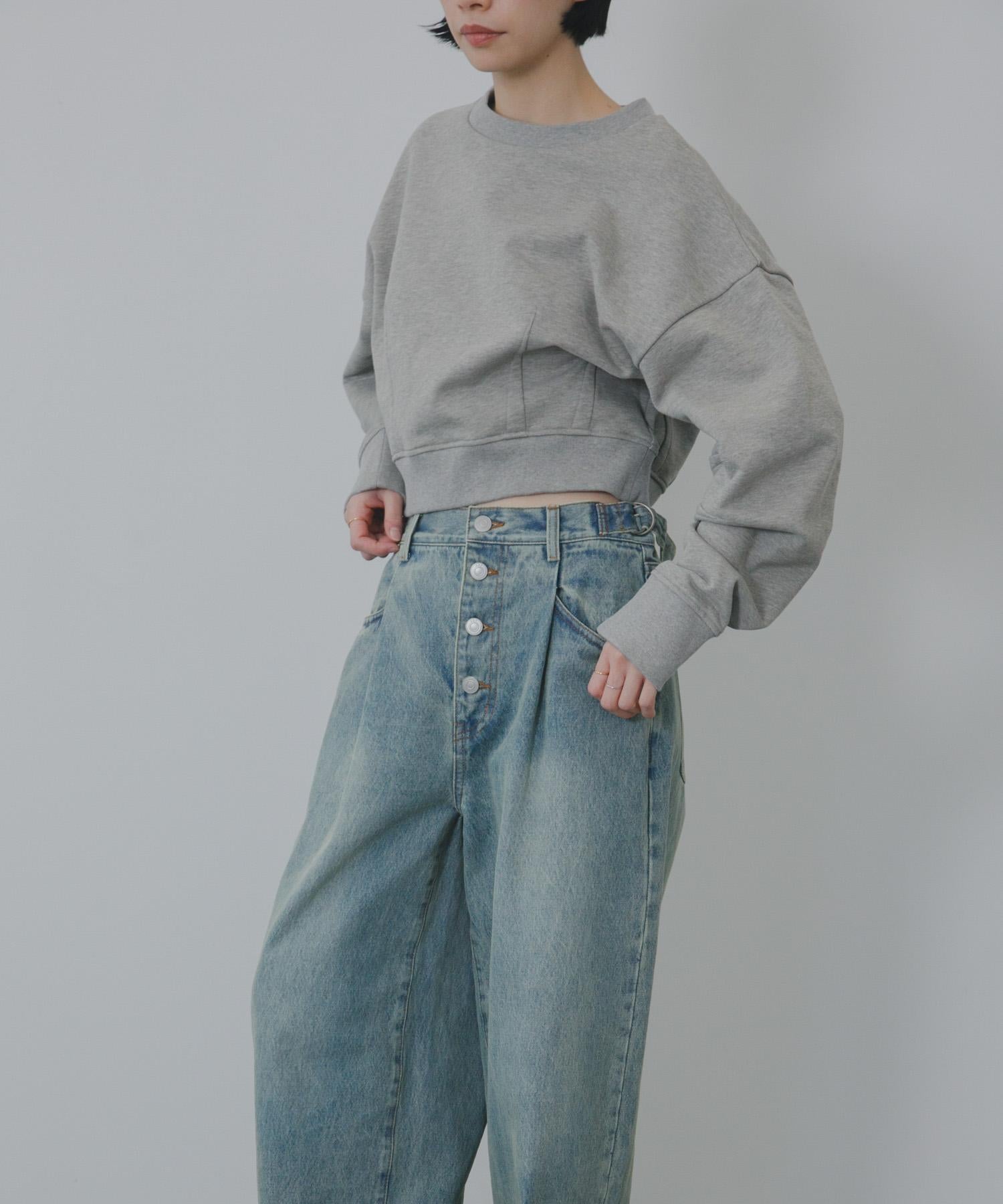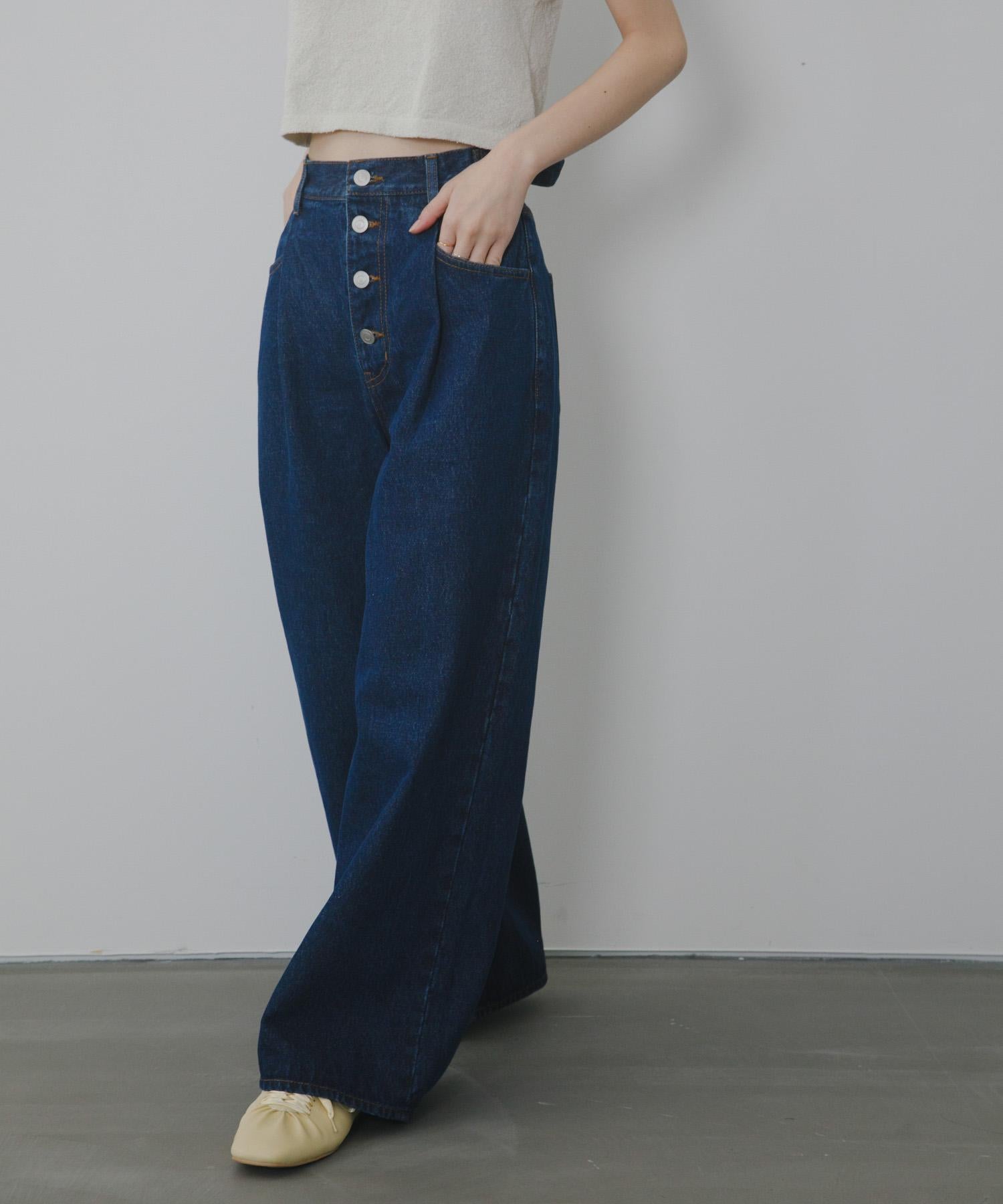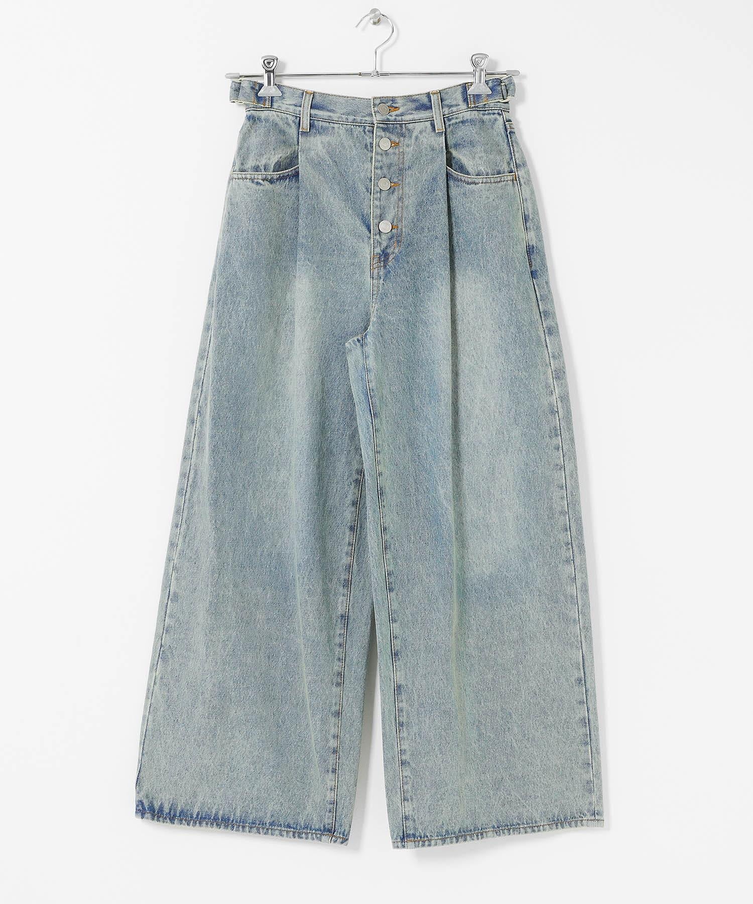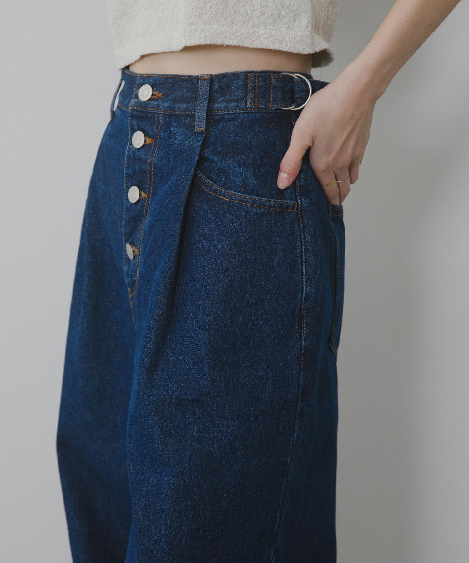 寬鬆牛仔布,前幅紐扣裝飾。腰部採用內收設計,使腰部看起來更加簡潔。腰帶部分有可調節的腰圍規格,根據身高有三種尺寸可供選擇,這也是一大亮點。下襬變粗的輪廓也很有吸引力。