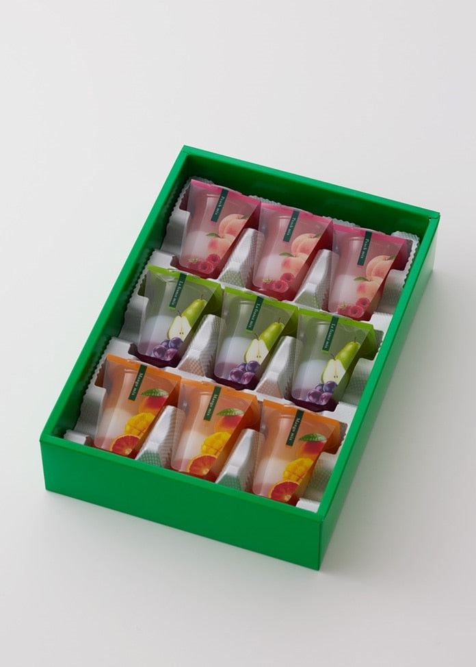 桃子混合味】糖(日本製造),異構糖與糖漿混合,桃子泥,桃子濃縮汁,還原糖漿,乳品乳酸菌飲料(滅菌),西洋酒,發酵牛奶(滅菌),加工草莓產品,甜煉乳,加工覆盆子產品,覆盆子醬,瓊脂,草莓/膠凝劑(多糖增稠劑),pH調節劑,乳酸。Ca,調味劑,抗氧化劑(V.C),酸化劑,著色劑(花青素,類胡蘿蔔素,紅酵母),(含有一些乳製品成分,明膠,大豆和桃子) [芒果混合口味] 糖(在日本生產),異構糖與糖漿,芒果泥,濃縮橙汁,還原糖漿,乳酸菌飲料(乳製品)。巴氏殺菌)、發酵乳(巴氏殺菌)、濃縮百香果汁、甜煉乳、西洋酒、瓊脂、草粉/膠凝劑(多糖增稠劑)、pH調節劑、穩定劑(加工澱粉、果膠)、乳酸Ca、香料、抗氧化劑(V.C)、類胡蘿蔔素顏色、(含有一些牛奶成分、橙子、明膠和大豆)。拉法斯混合風味】糖(日本製造)、異構糖混合糖漿、拉法斯果汁、濃縮蘋果汁、還原糖漿、乳製品乳酸菌飲料(滅菌)、發酵乳(滅菌)、西洋葡萄酒、濃縮葡萄汁、甜煉乳、瓊脂、草粉/膠凝劑(多糖增稠劑)、pH調節劑、乳酸Ca、風味、色素(包括乳製品成分、橘子、明膠、梔子、大豆)。花青素,梔子,類胡蘿蔔素),抗氧化劑(V.C),(含有一些乳製品成分,明膠,大豆和蘋果)。