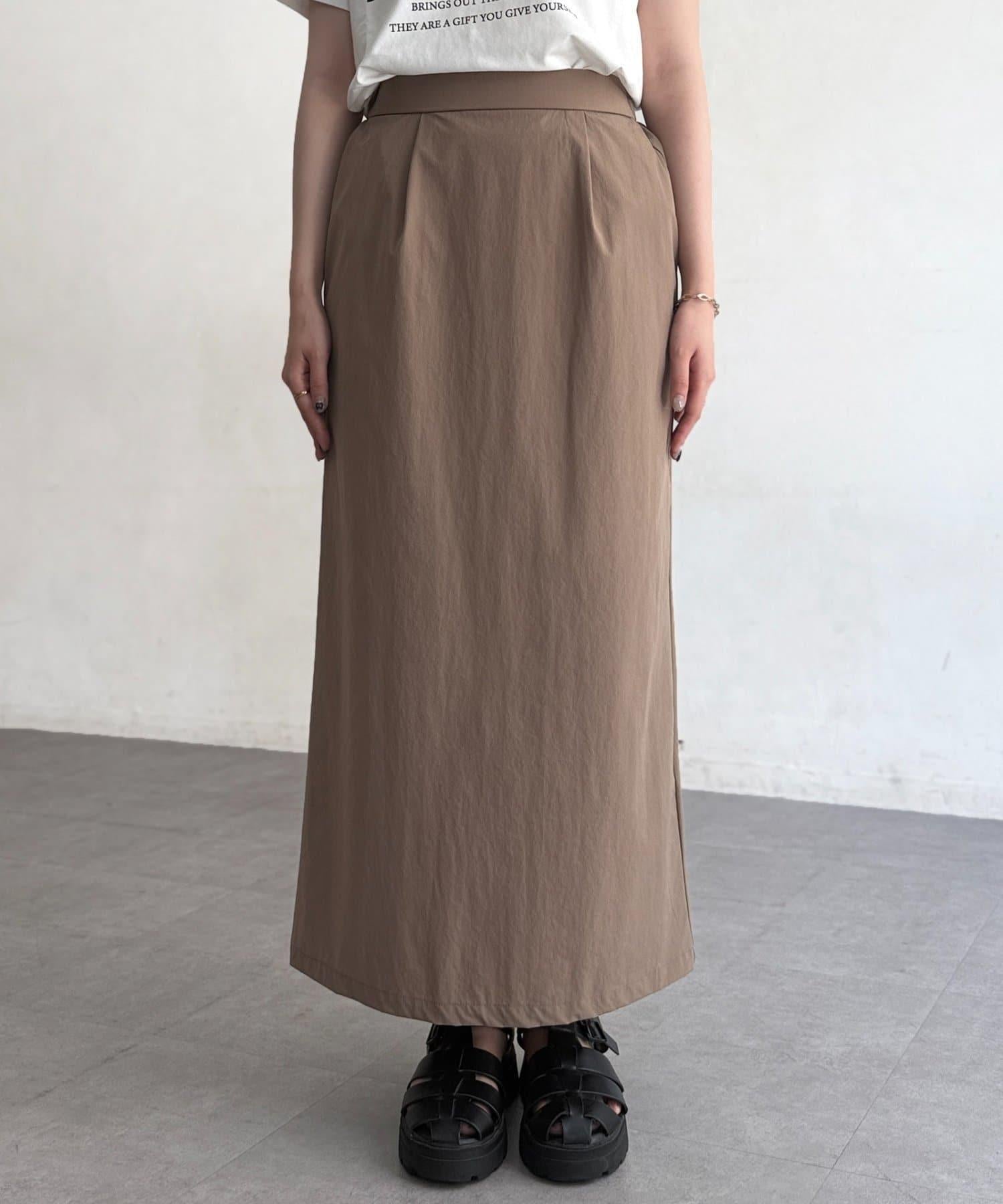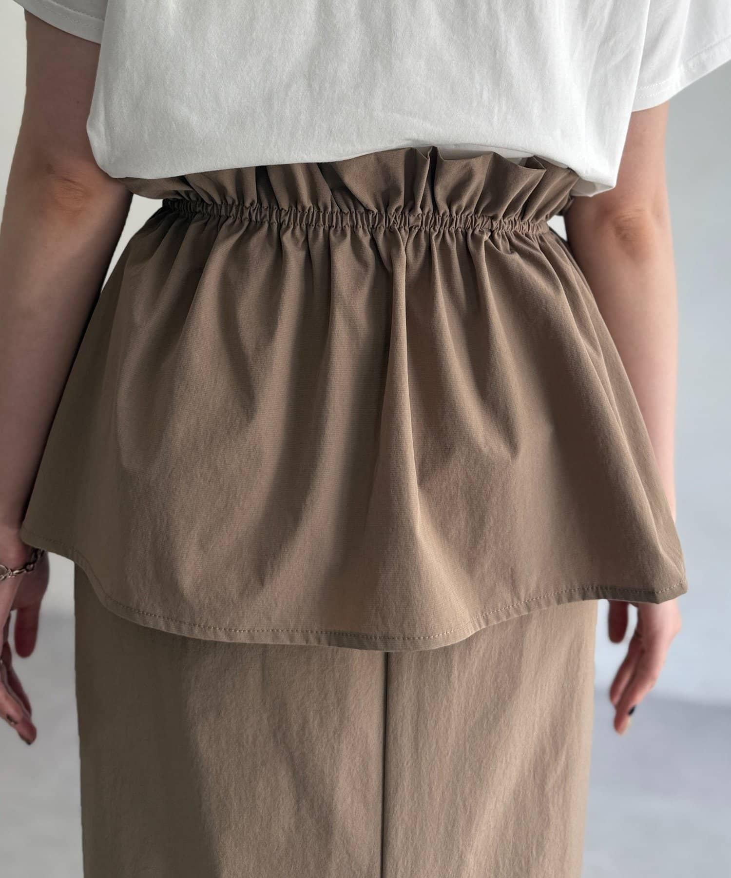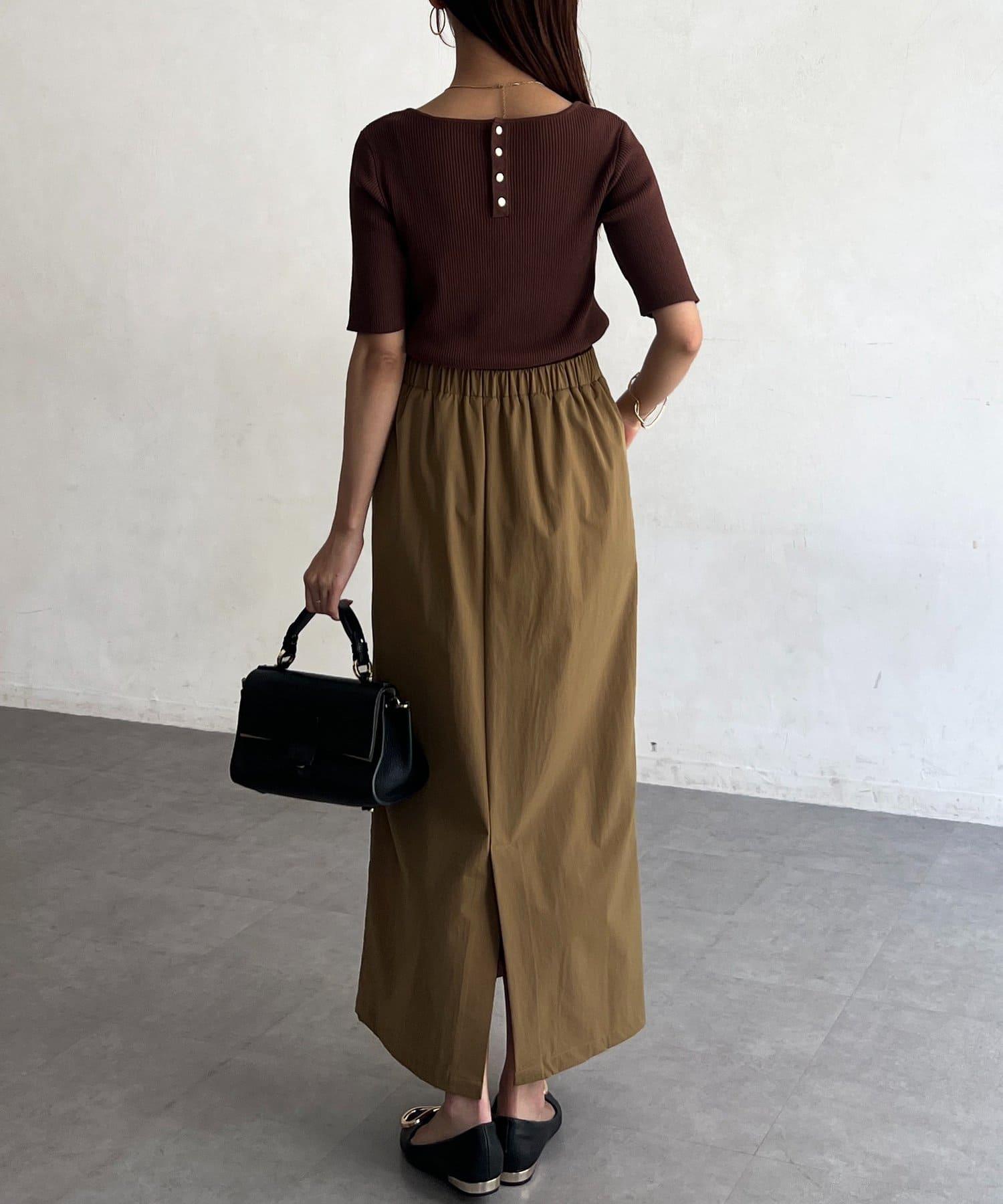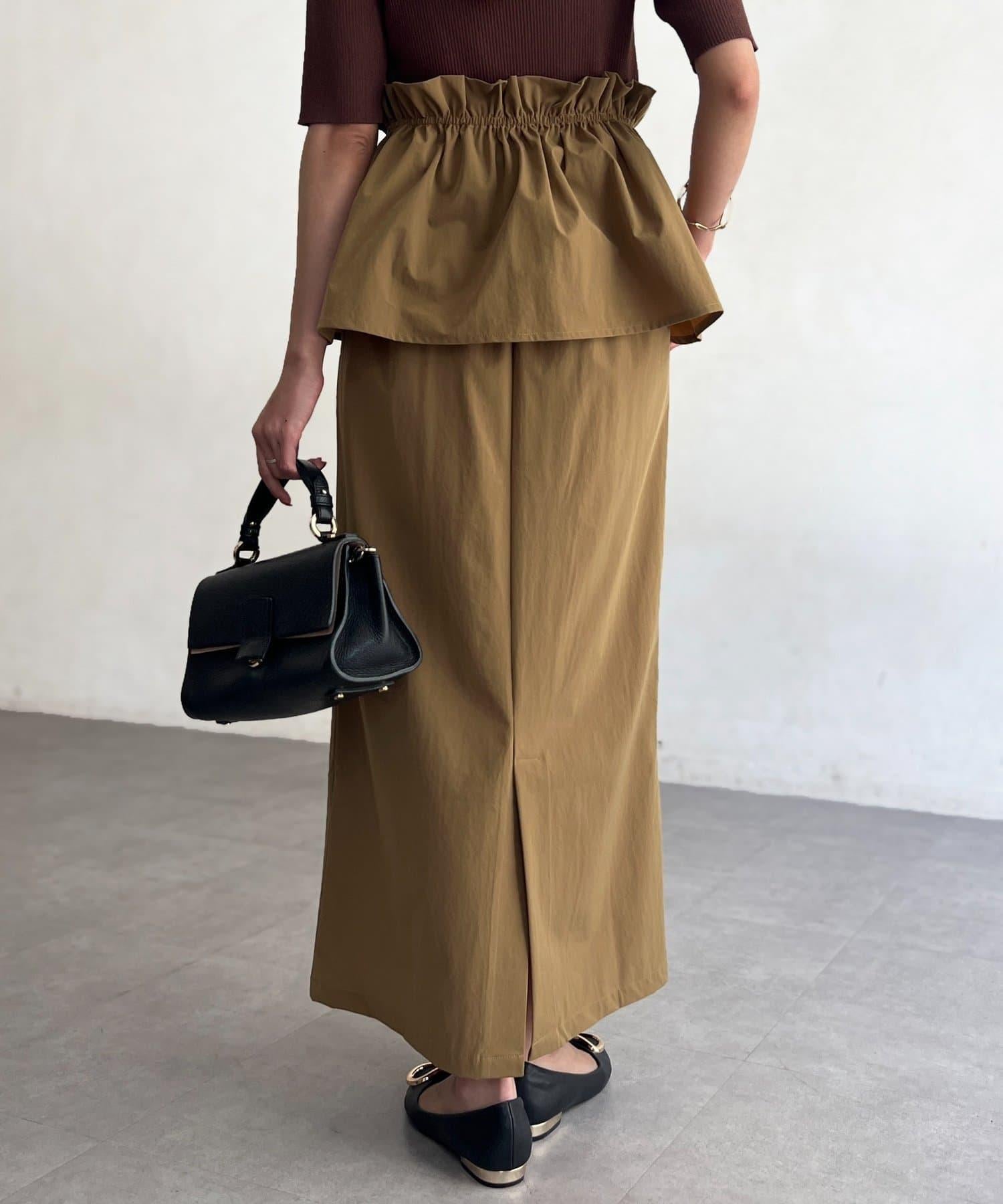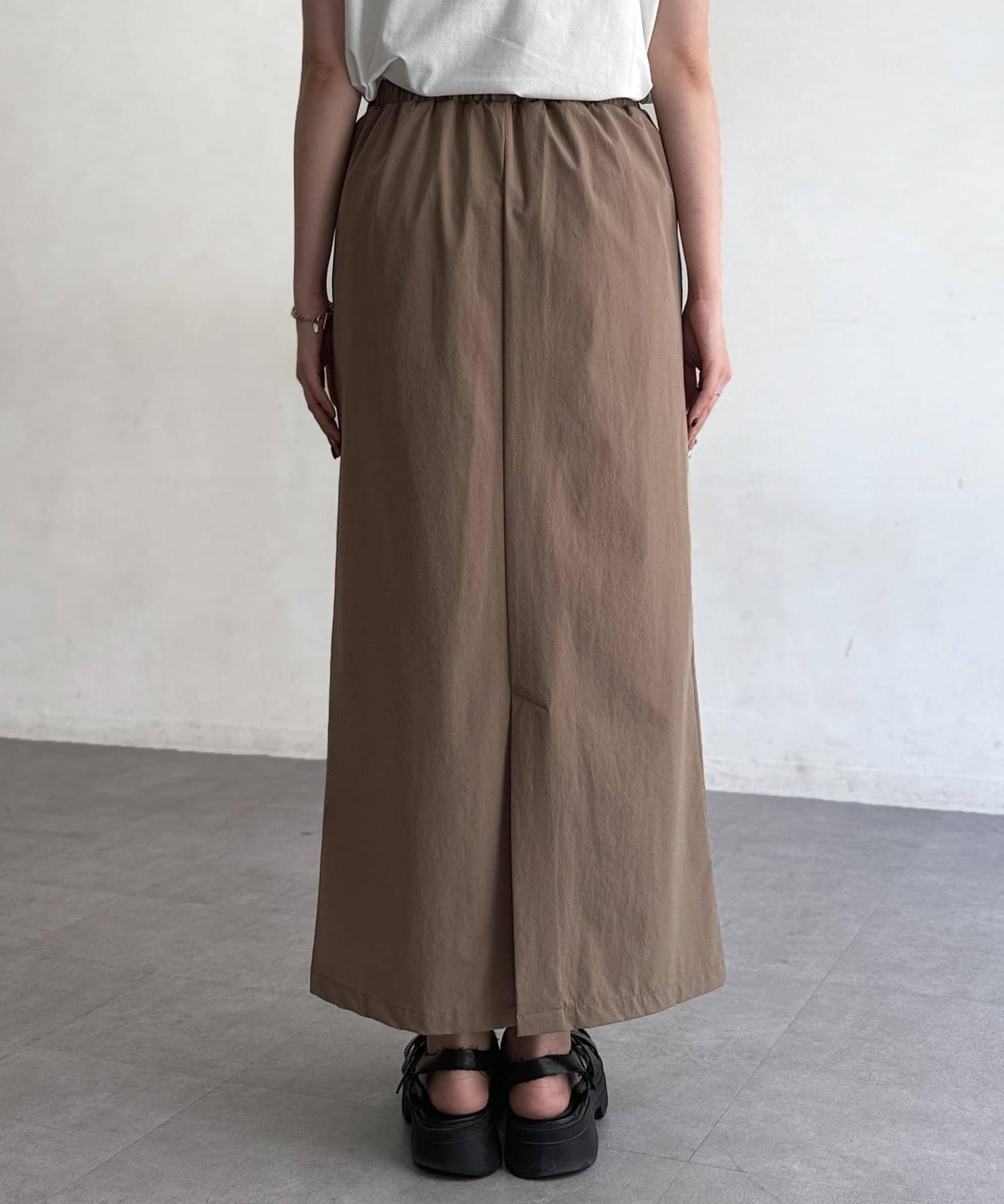 前部收腰的窄裙後腰處有鬆緊帶和袋口,穿起來輕鬆自如。