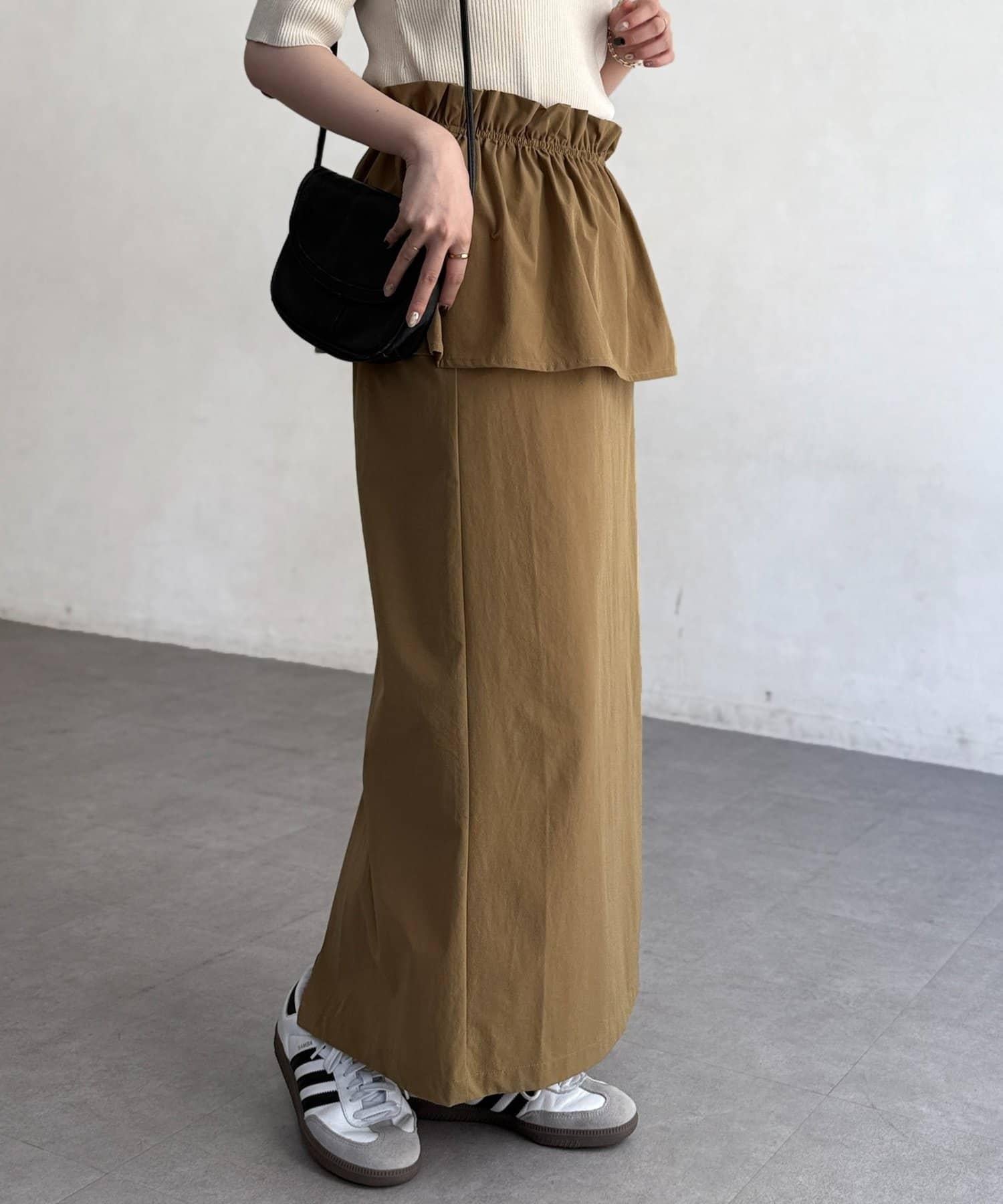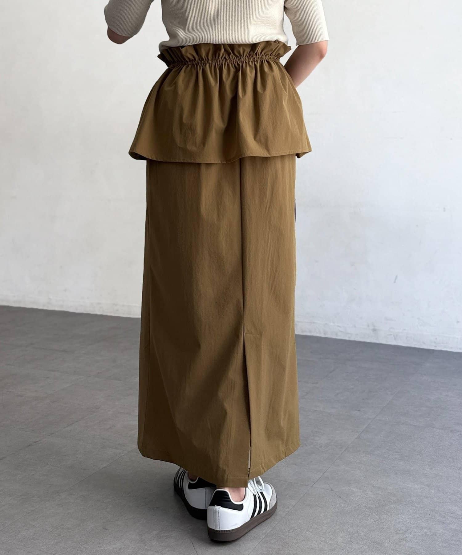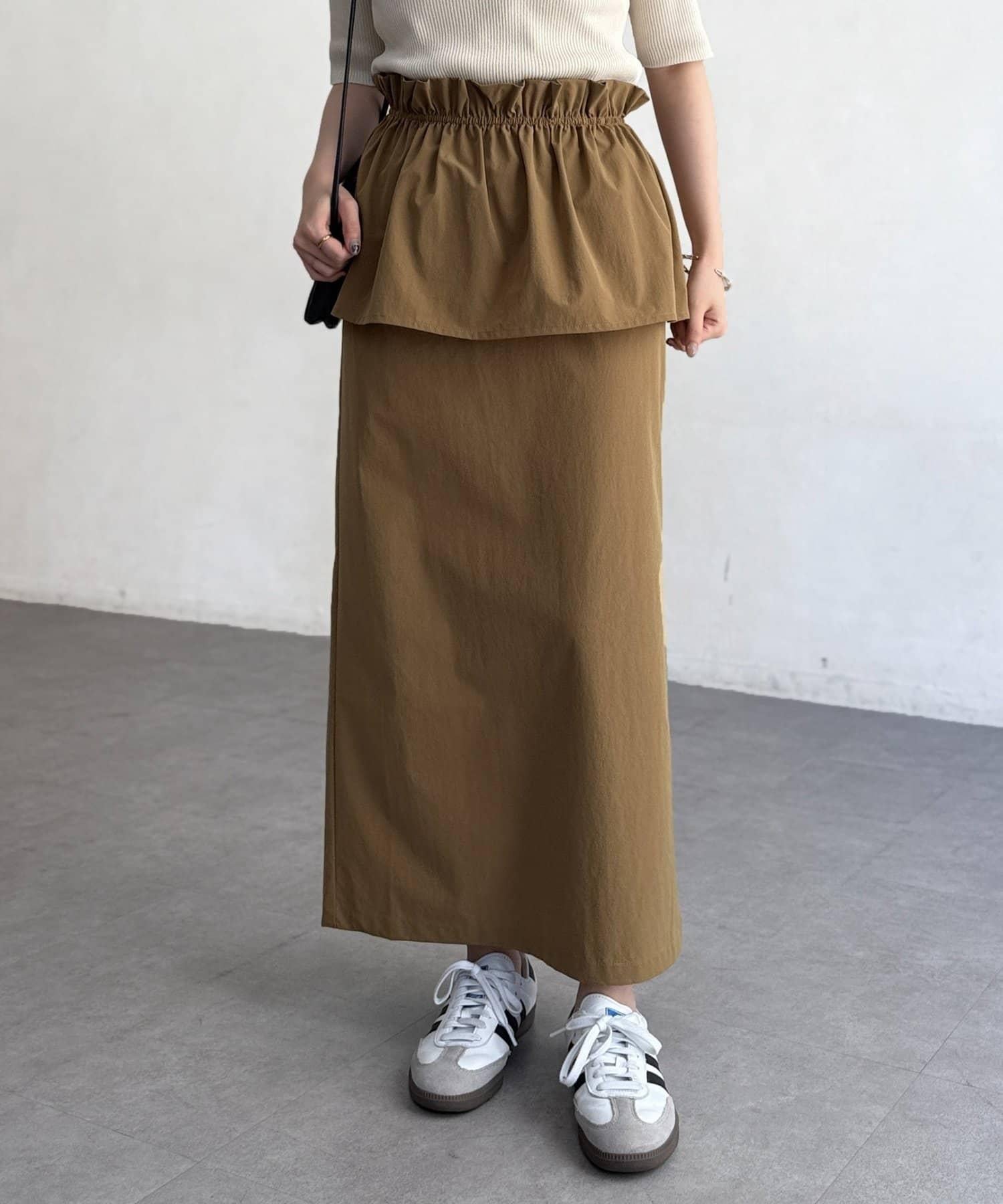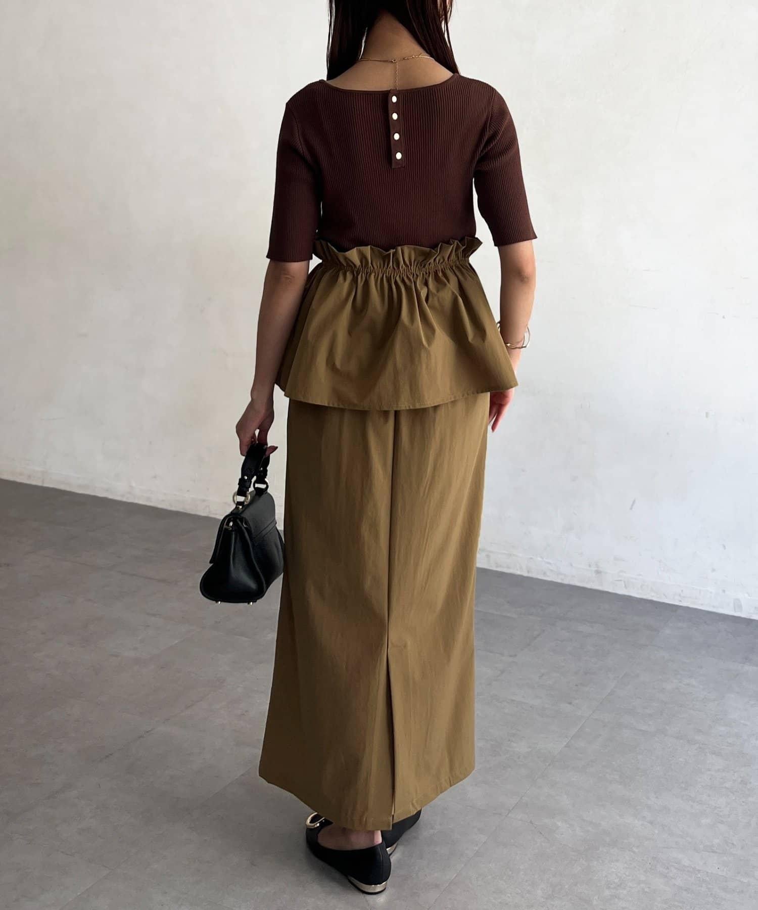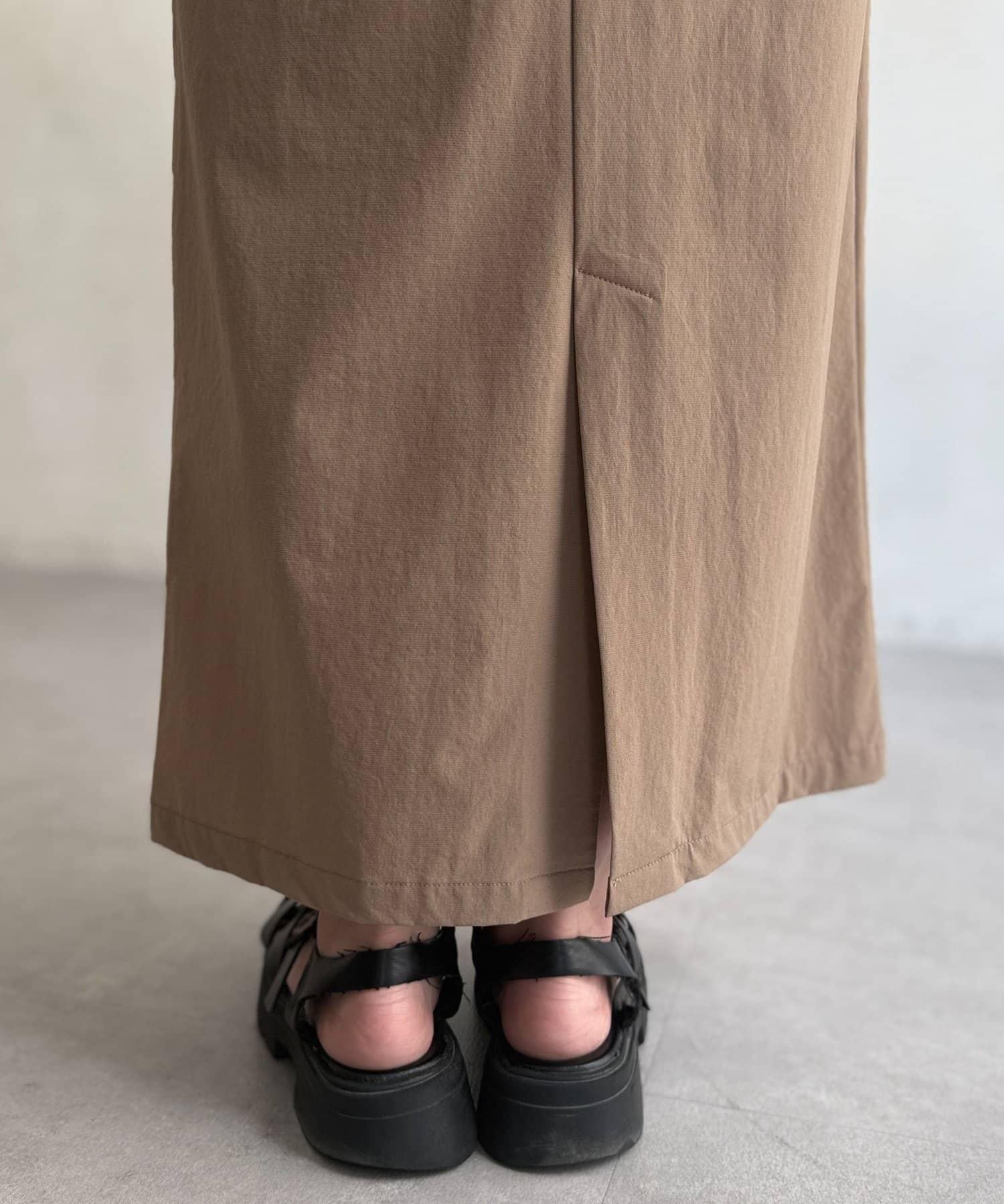 前部收腰的窄裙後腰處有鬆緊帶和袋口,穿起來輕鬆自如。