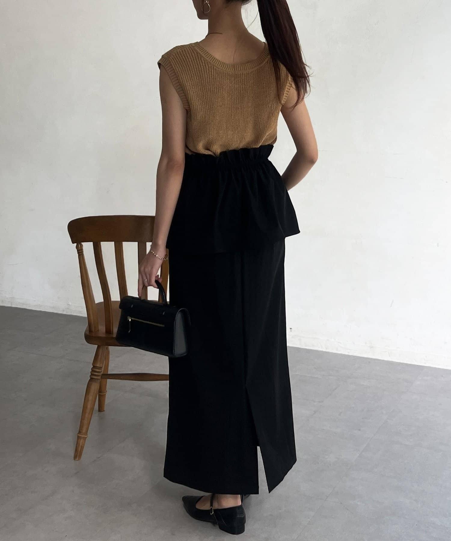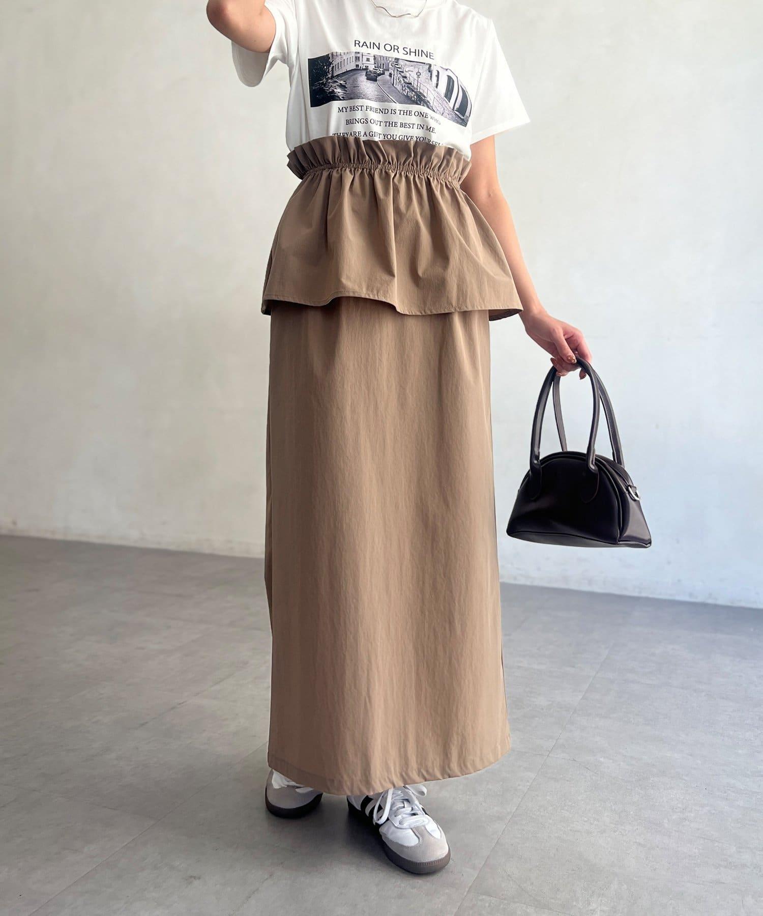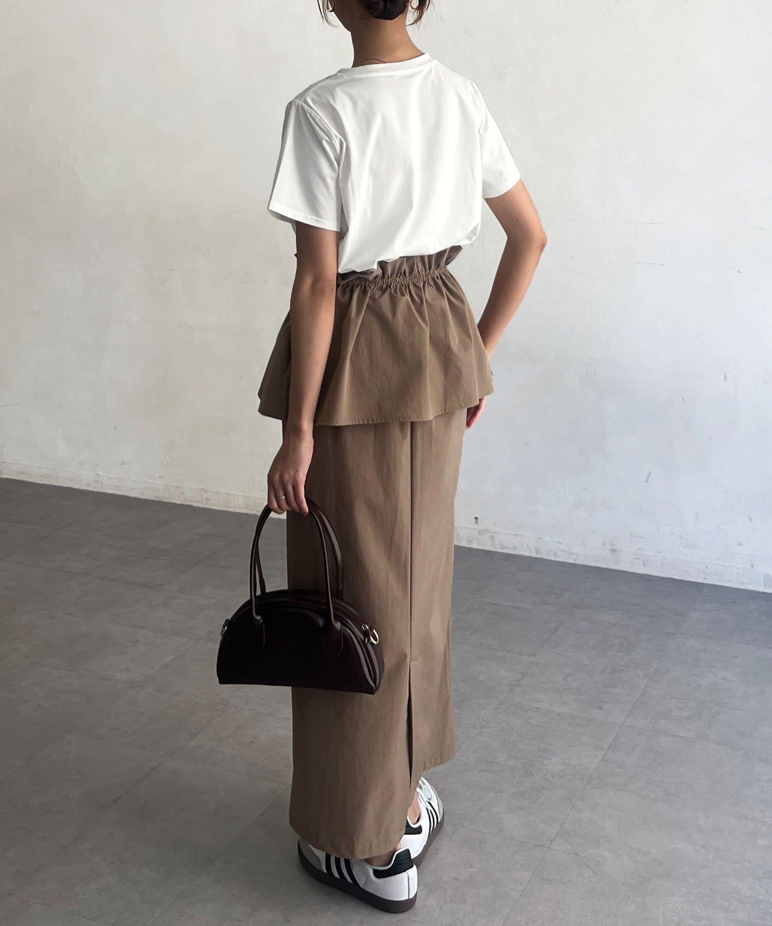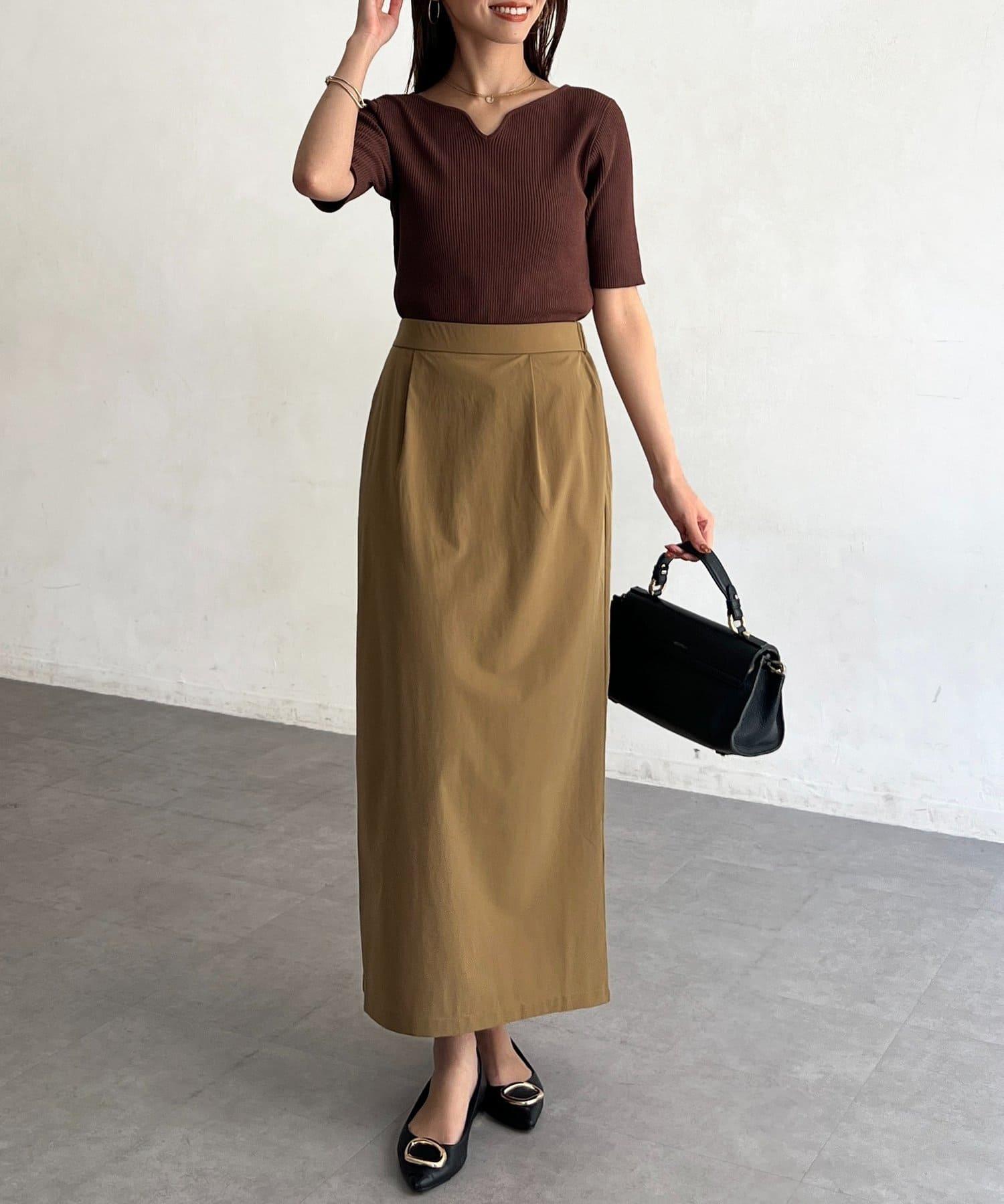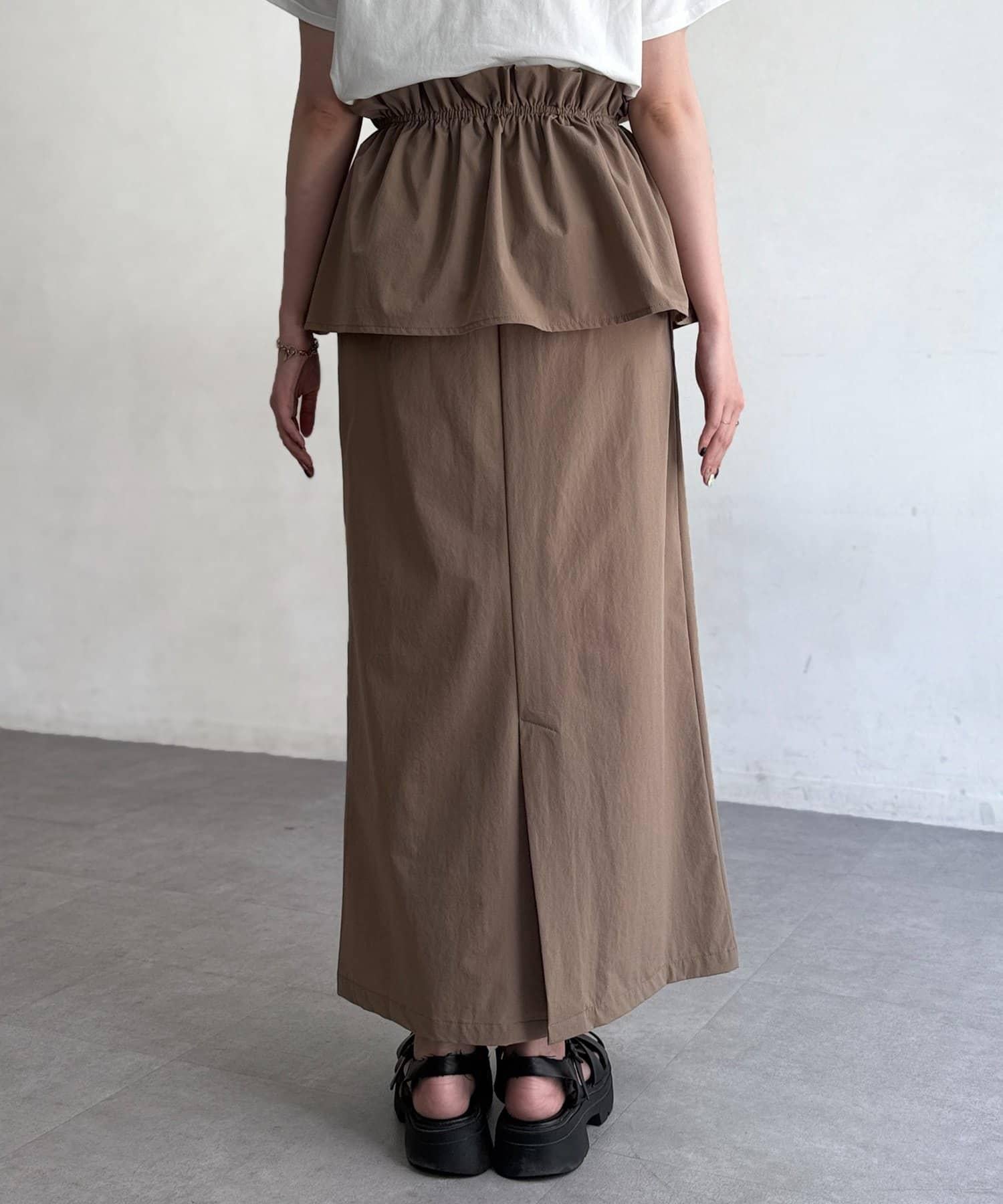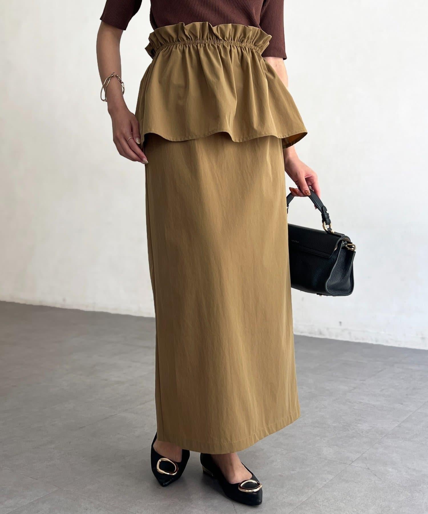 前部收腰的窄裙後腰處有鬆緊帶和袋口,穿起來輕鬆自如。